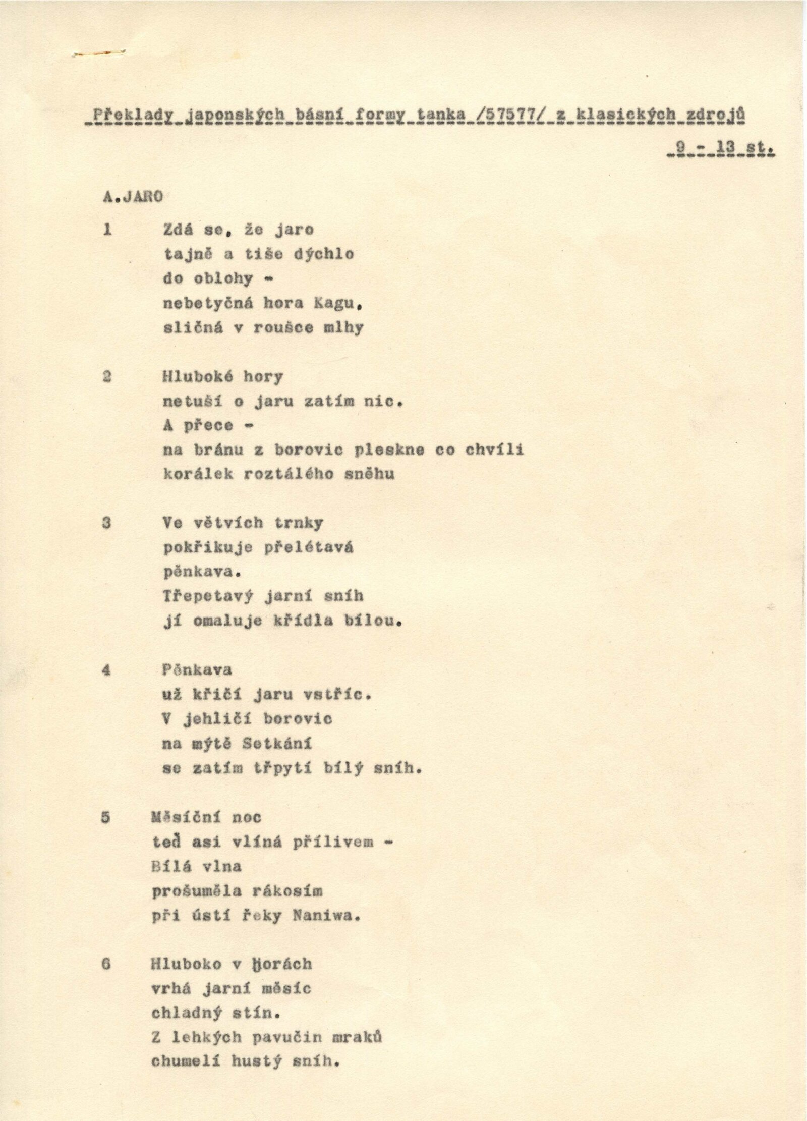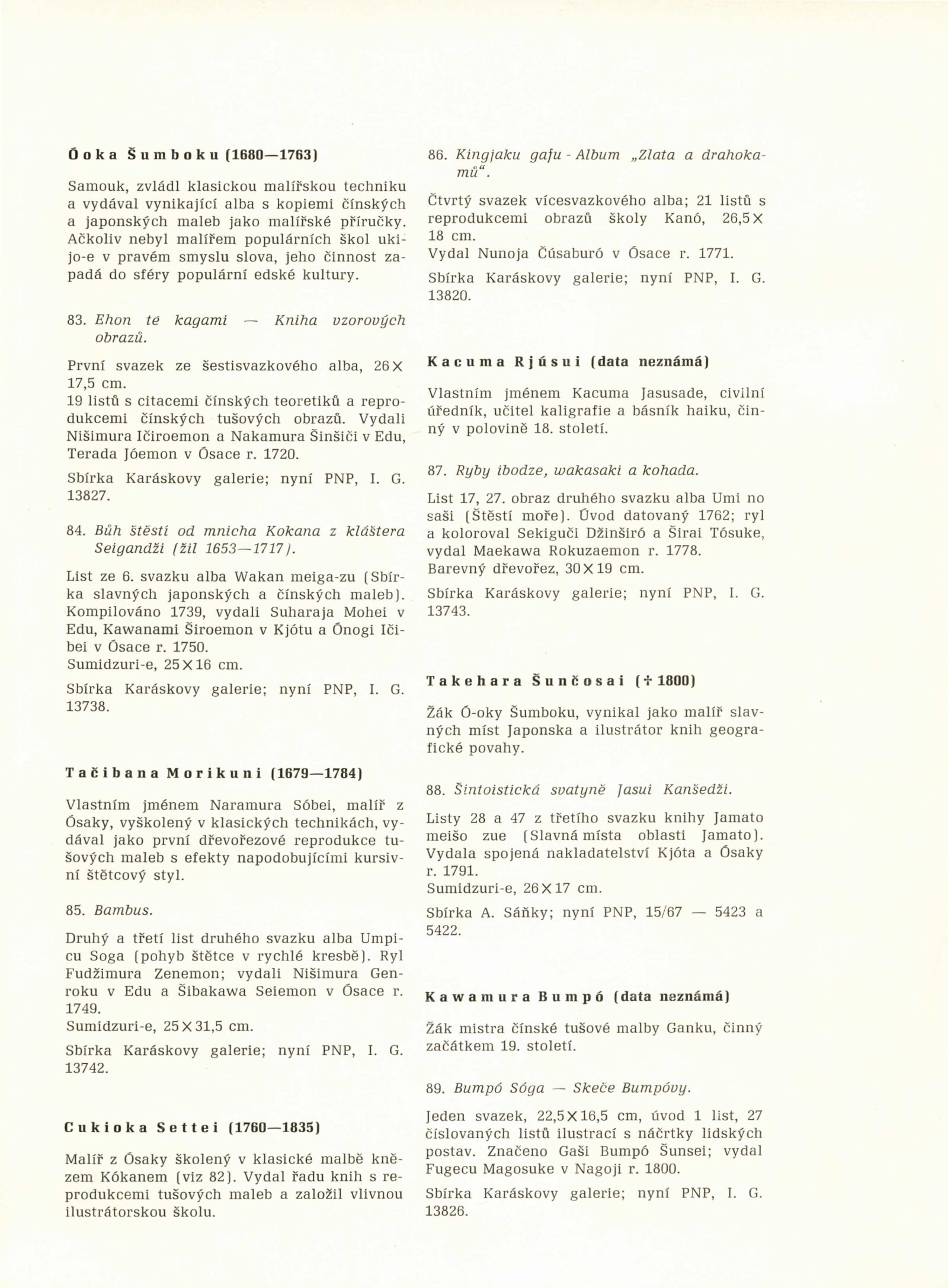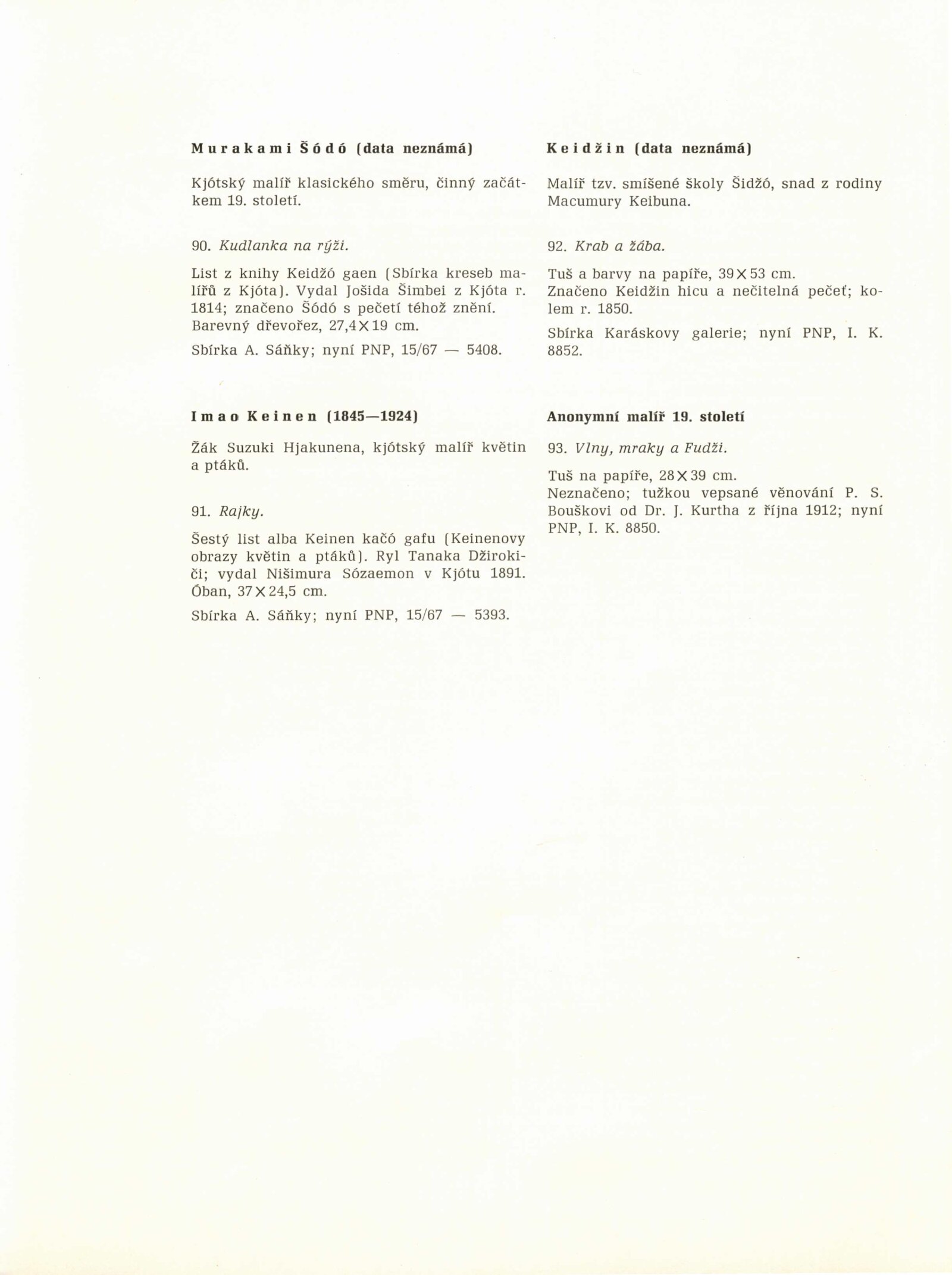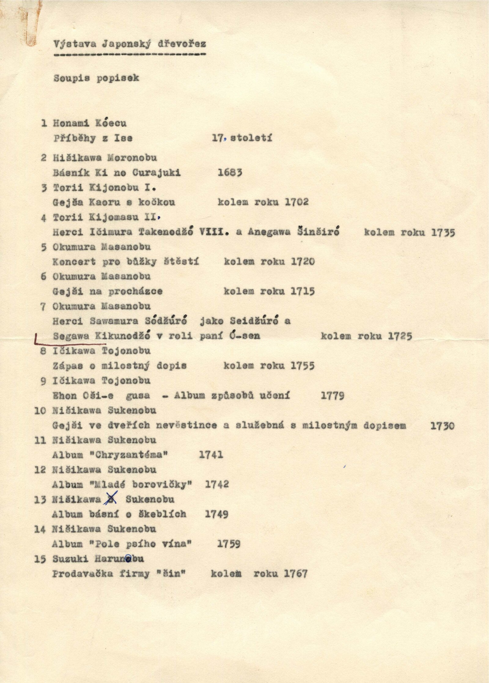 pozvánka, společná pozvánka DPK 599, 562 a 563, katalog, seznam vystavených děl s odhadovanými cenami, překlady japonských básní, informace k výstavě, výpůjční záznam, dopis (DU a Památník nár. písemnictví), provozní korespondence, žádost o povolení výstavy, recenze v tisku
