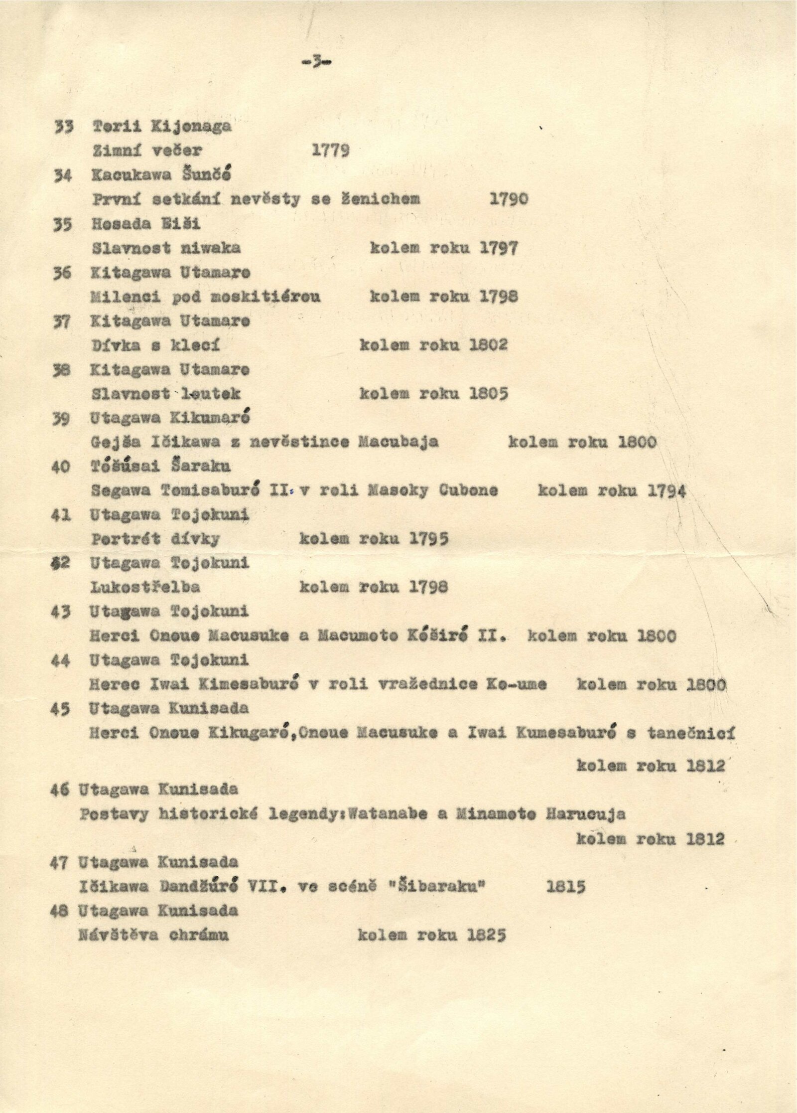 Honami Kóecu, Hišikawa Moronobu, Torii Kijonobu I., Torii Kijomasu II., Okumura Masanobu, IčikawaTojonobu, Nišikawa Sukenobu, Suzuki Harunobu, Torii Kijonaga, Kacukawa Šunčó, Hosada Eiši, Kitagawa Utamaro, Tóšusai Šaraku, Utagawa Tojokuni, Utagawa Kunisada, Iseda Korjúsai, Torii Kijohide, Kacukawa Šunšó, Kitao Šigemasa, Kitao Masanobu, Kitao Masajoši, Utagawa Kunisada, Ikkósai Jošimori, Ičijótai Jošitaki, Ičihósai Kunikane, Šókósai Šuntei, Keisai Eisen, Kacušika Hokusai, Teisai Hokuba, Yašima Gakutei, Šunkosai Hokušu, Ičirjúsai Hirošige, Ó-oku Šumboku, Tačibana Morikuni, Cukioka Settei, Kacuma Rjúsui, Takehara Šunčosai, Kawamura Bumpó, Murakami Šódó, Imao Keinen, Keidžin