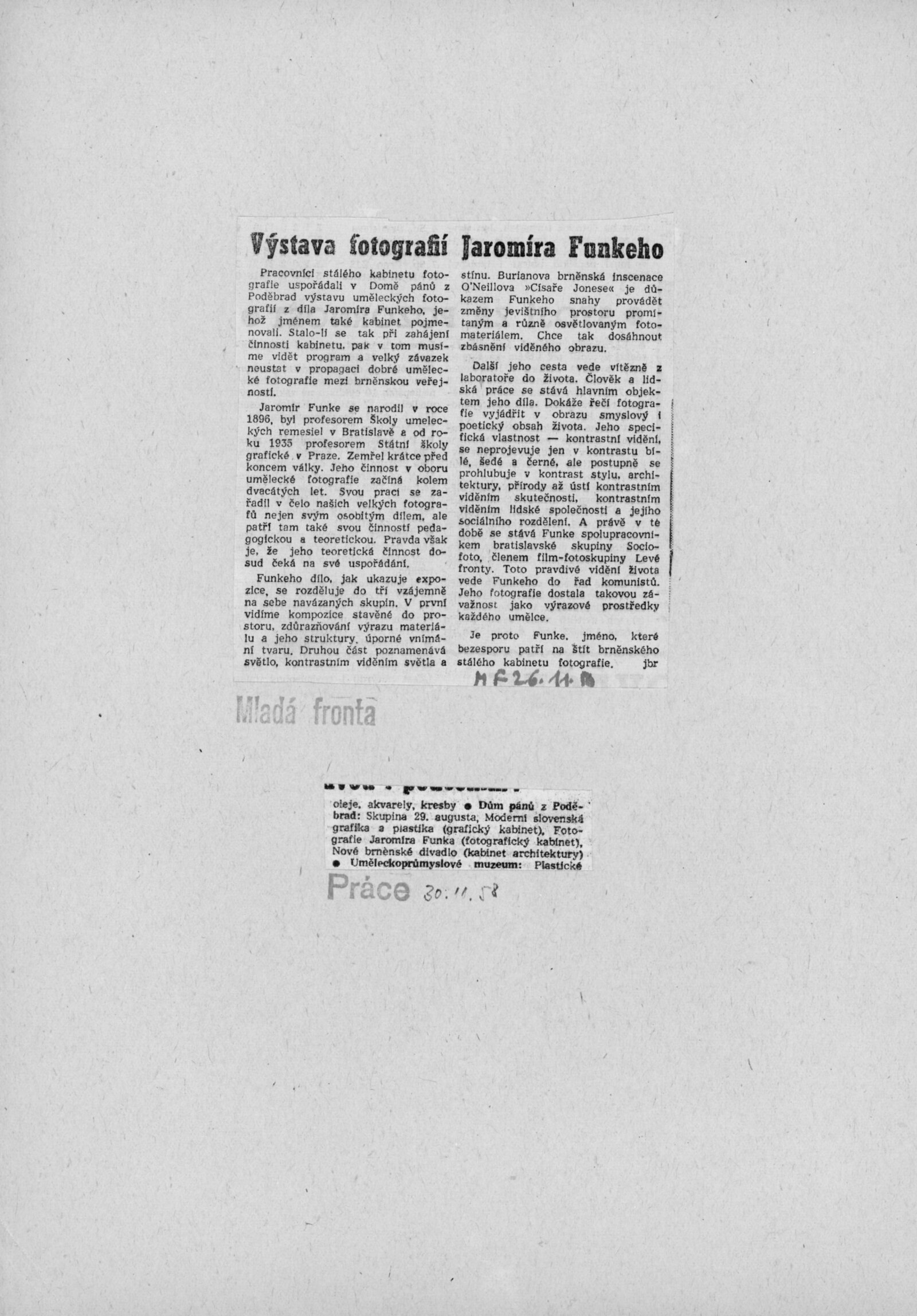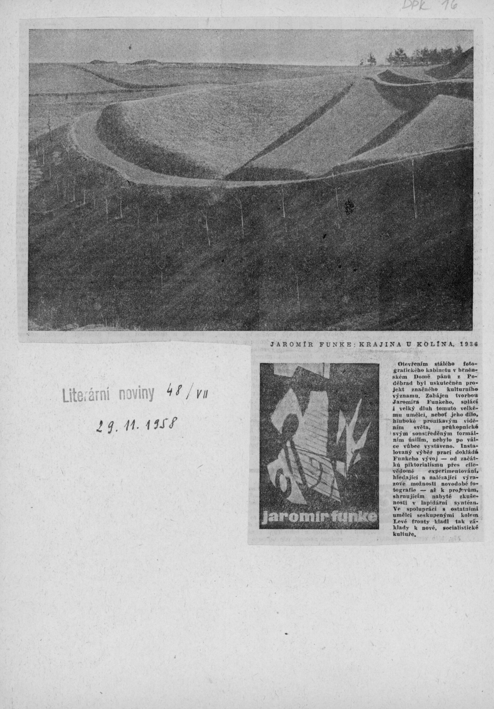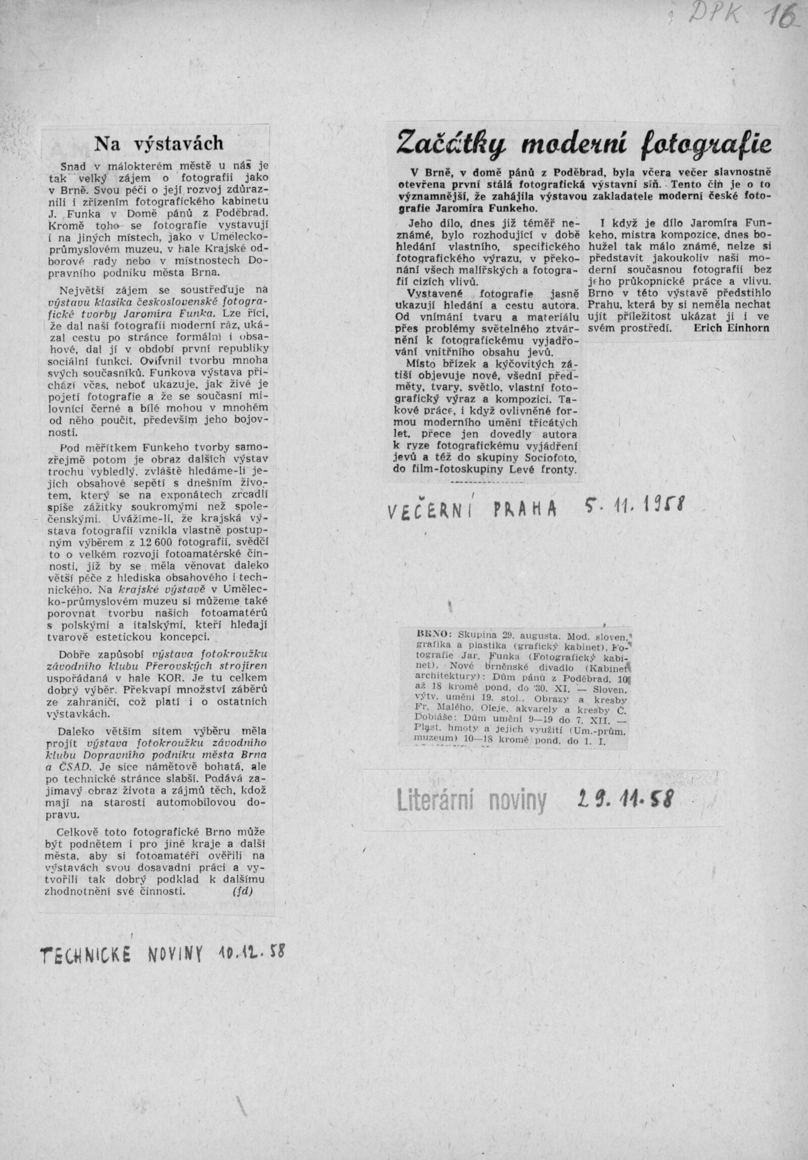 Jaromír Funke: Dům umění v Brně / Dům pánů z Poděbrad, Fotografický kabinet J. Funka, 4. 11. – 30. 11. 1958 / Text: Lubomír Linhart. – Brno: DUmB, 1958. – skládačka, 6 s., obr., životopis, DPK 16. – MZK; MG