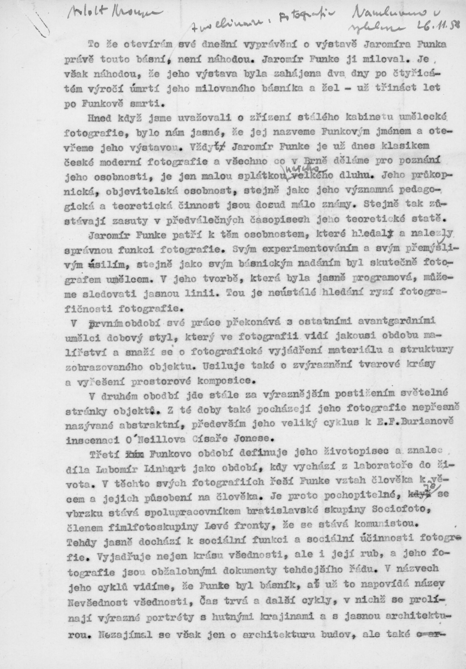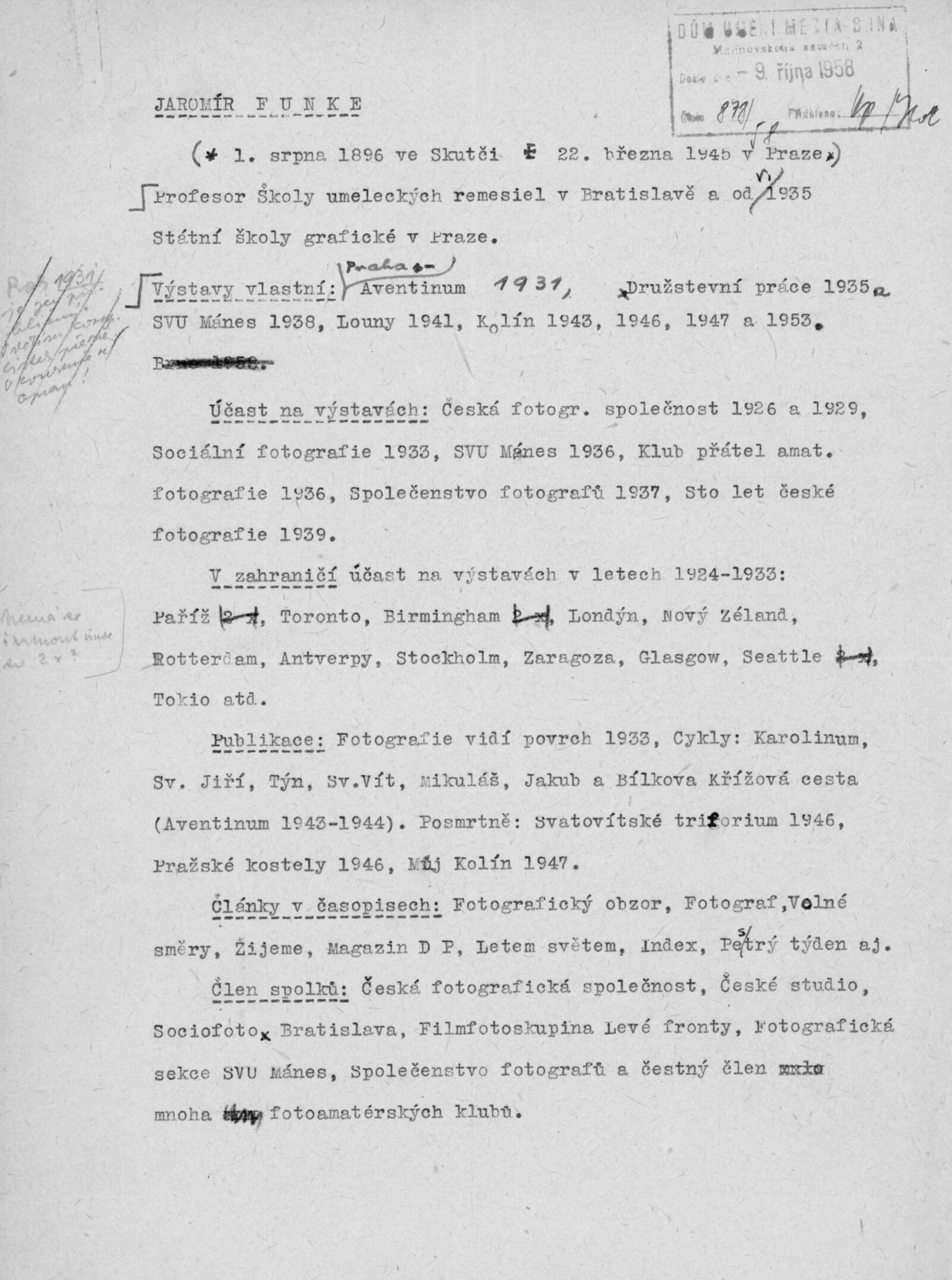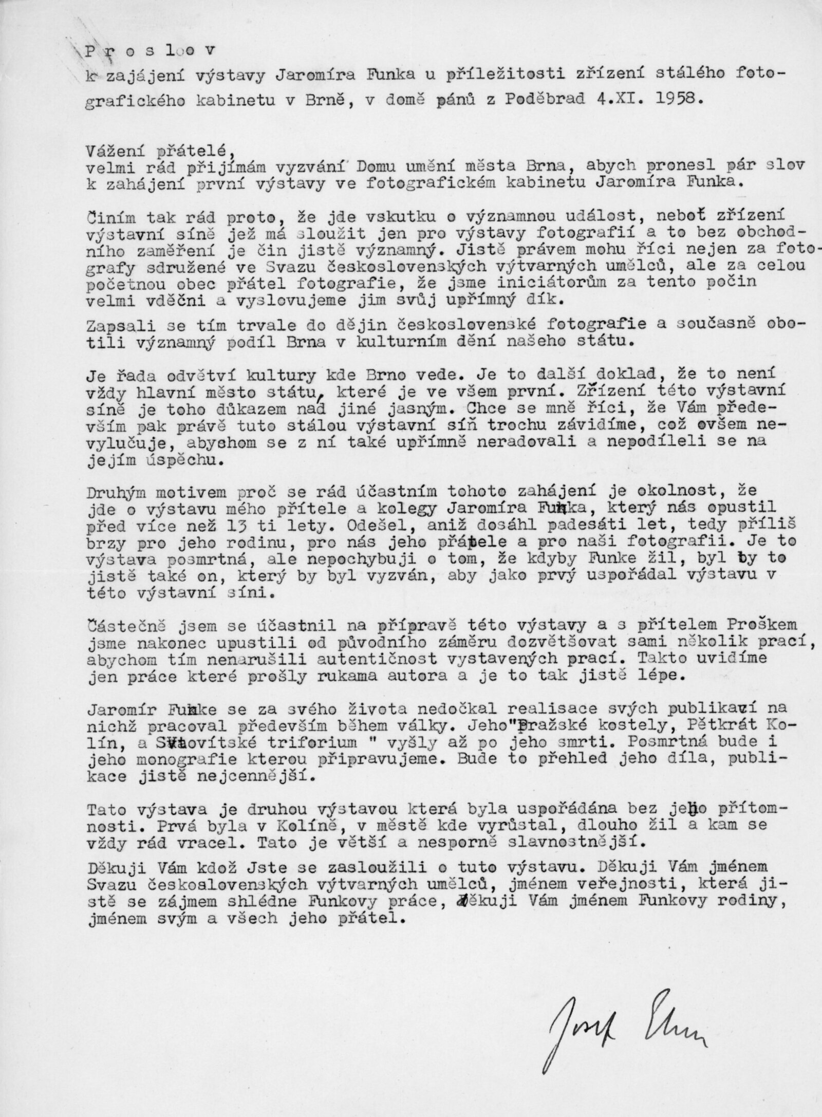 Jaromír Funke: Dům umění v Brně / Dům pánů z Poděbrad, Fotografický kabinet J. Funka, 4. 11. – 30. 11. 1958 / Text: Lubomír Linhart. – Brno: DUmB, 1958. – skládačka, 6 s., obr., životopis, DPK 16. – MZK; MG