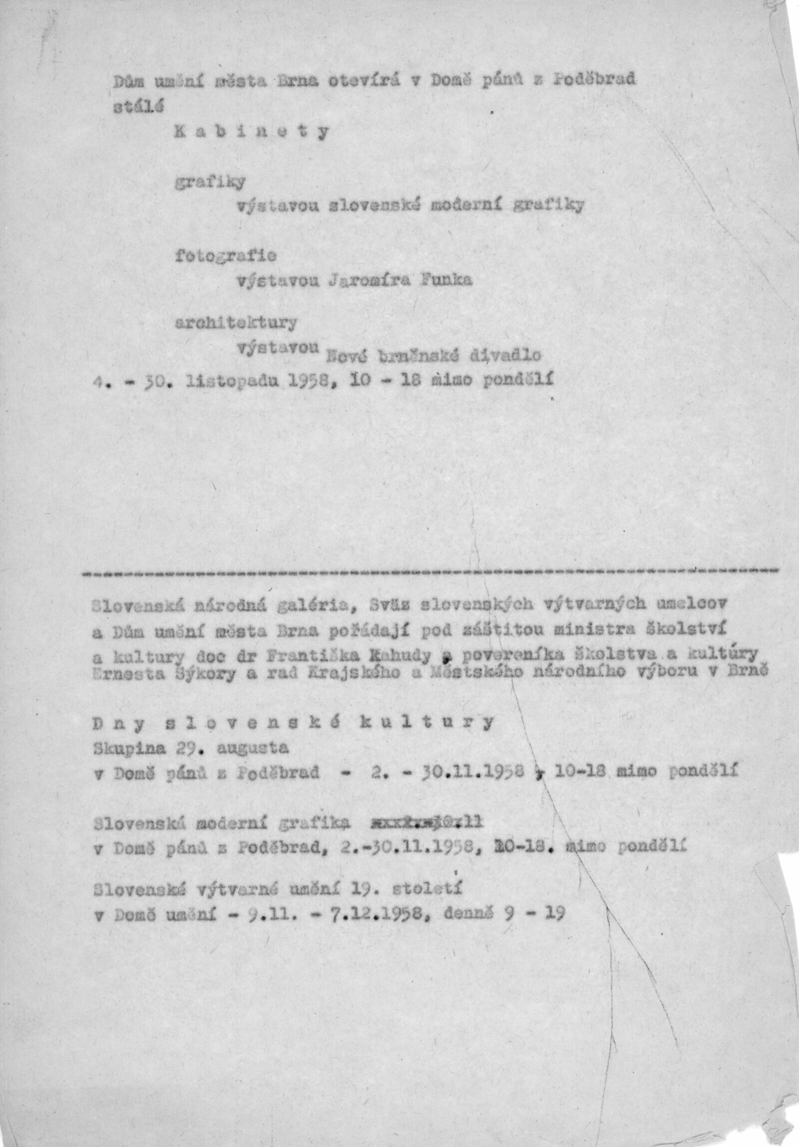 Výstavou Jaromíra Funkeho byla zahájena výstavní činnost v Kabinetu fotografie. Výstavu zahájili Adolf Kroupa, Lubomír Linhart a Josef Ehm.