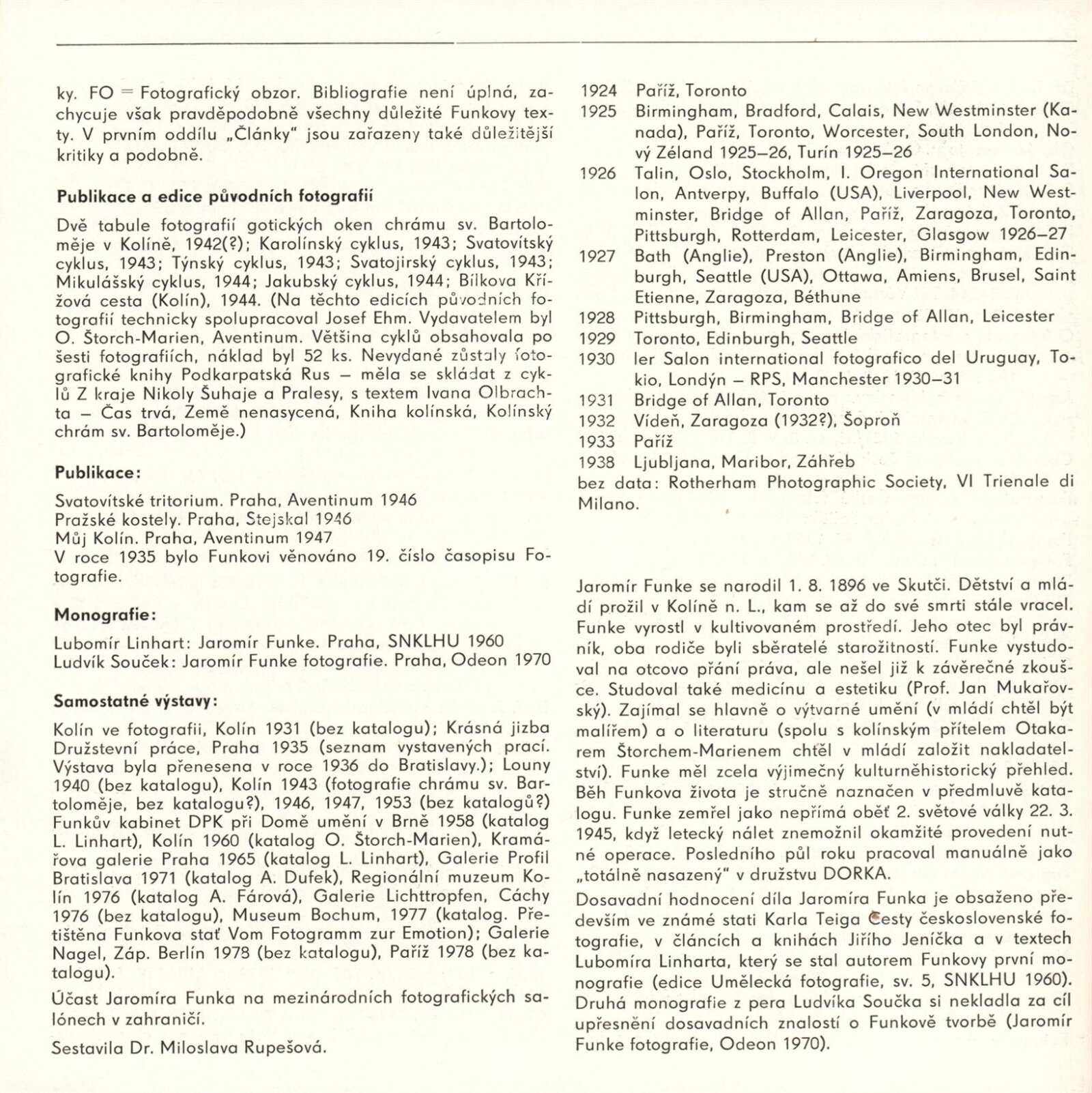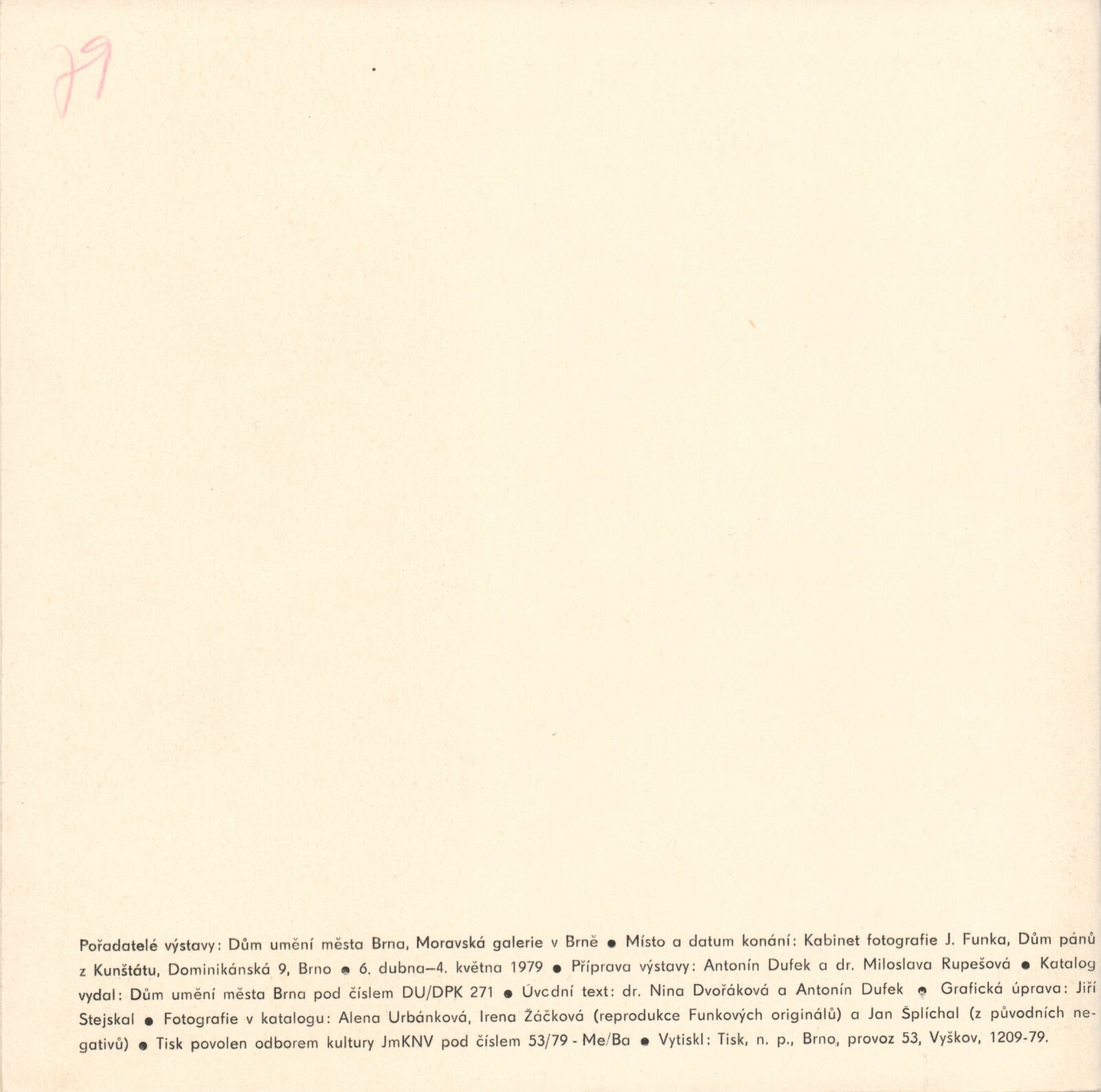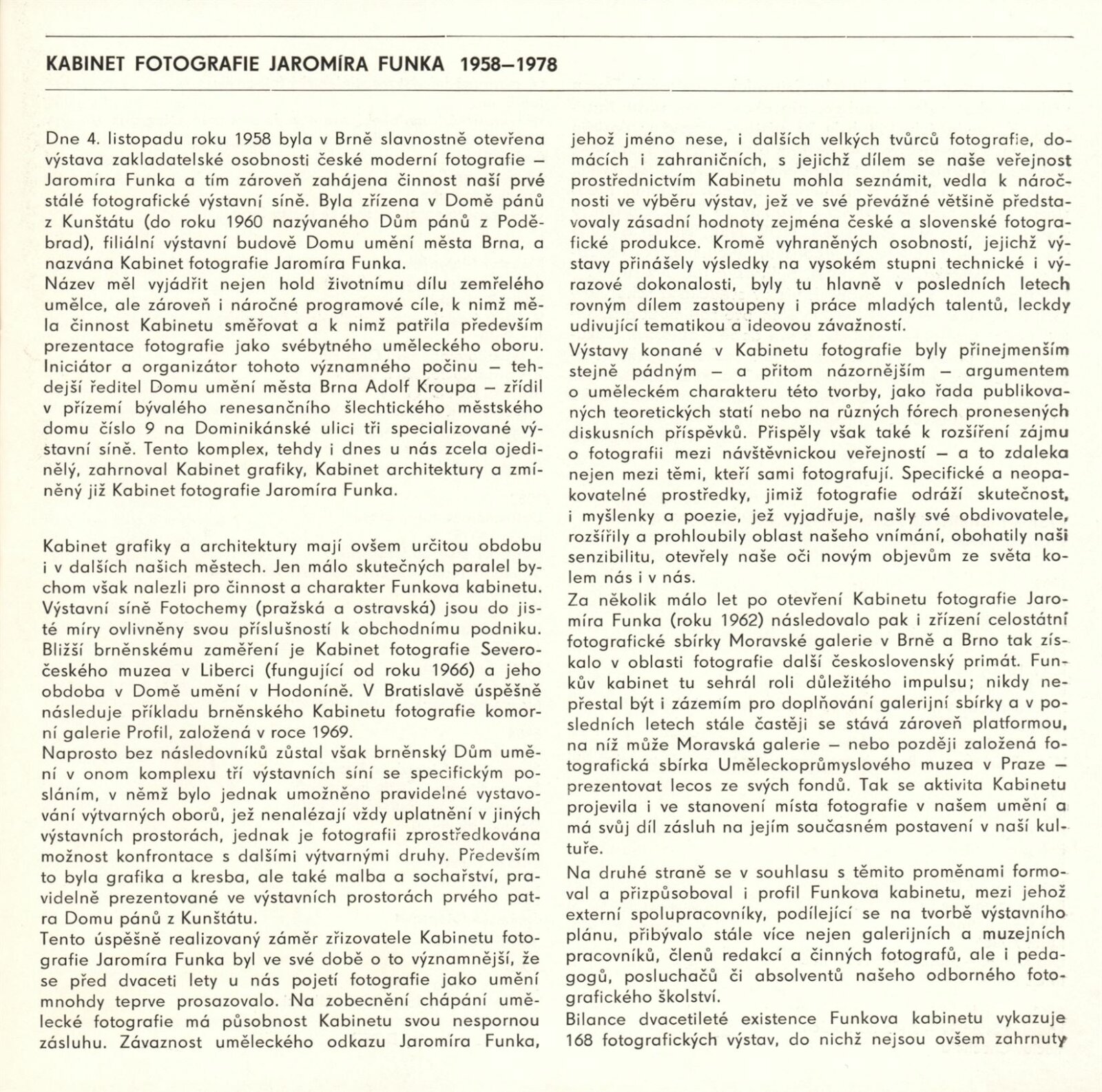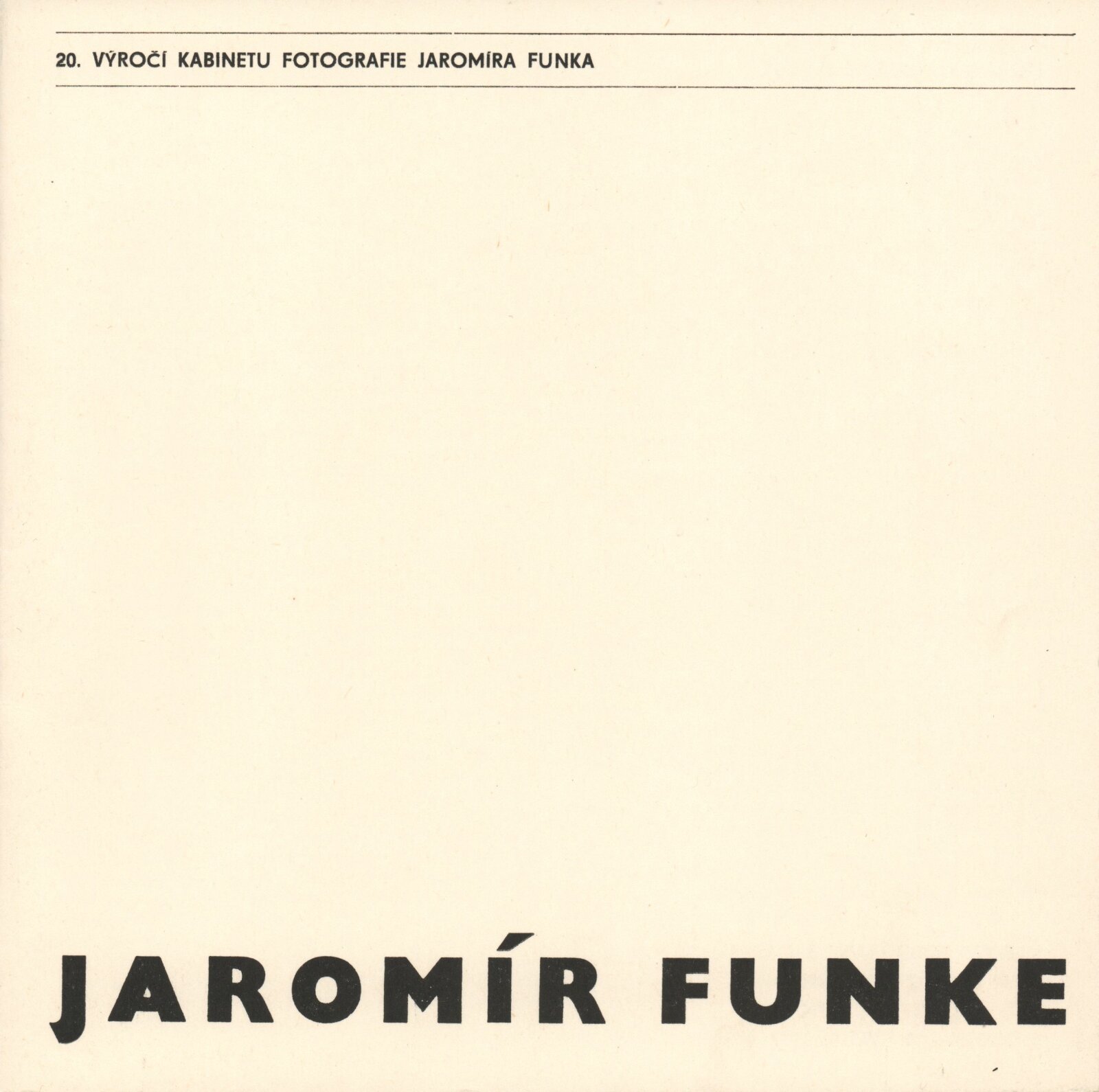 Jaromír Funke. 20. výročí Kabinetu fotografie Jaromíra Funka: Kabinet fotografie J. Funka, 170. výstava, Dům pánů z Kunštátu 6. 4. – 4. 5. 1979 / Texty Nina Dvořáková, Antonín Dufek, Jaromír Funke. - Brno: DUmB, - 36 s., obr.+ Seznam vystavených prací 2 s. Obsahuje dějiny kabinetu a seznam jeho výstav 1958 – Soupis publikační činnosti J. Funka. DPK 699; MZK; MG