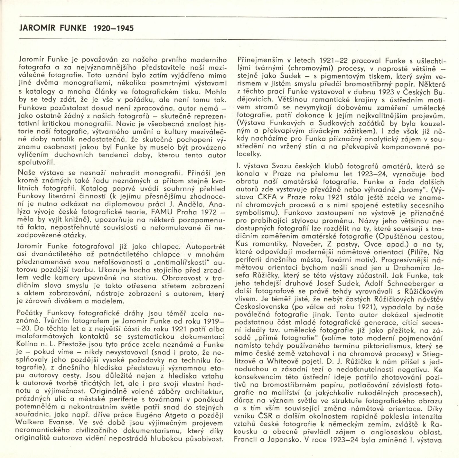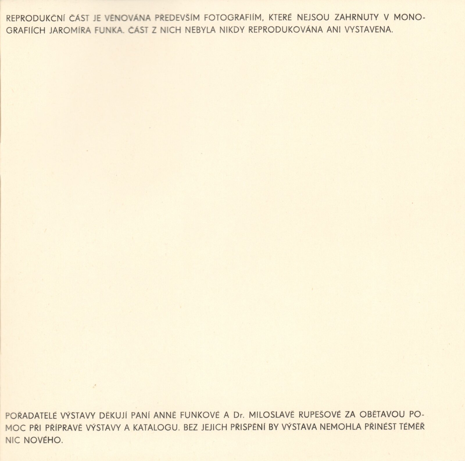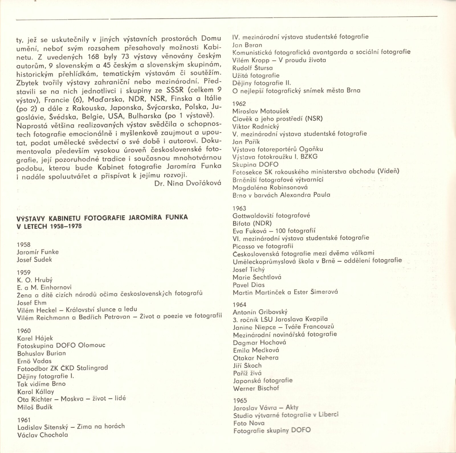Jaromír Funke. 20. výročí Kabinetu fotografie Jaromíra Funka: Kabinet fotografie J. Funka, 170. výstava, Dům pánů z Kunštátu 6. 4. – 4. 5. 1979 / Texty Nina Dvořáková, Antonín Dufek, Jaromír Funke. - Brno: DUmB, - 36 s., obr.+ Seznam vystavených prací 2 s. Obsahuje dějiny kabinetu a seznam jeho výstav 1958 – Soupis publikační činnosti J. Funka. DPK 699; MZK; MG