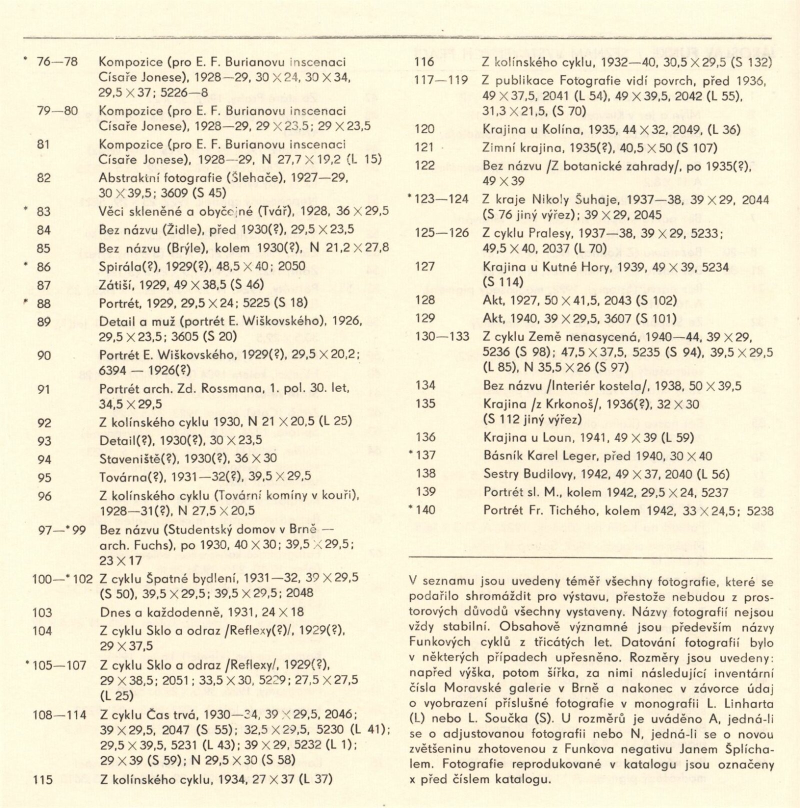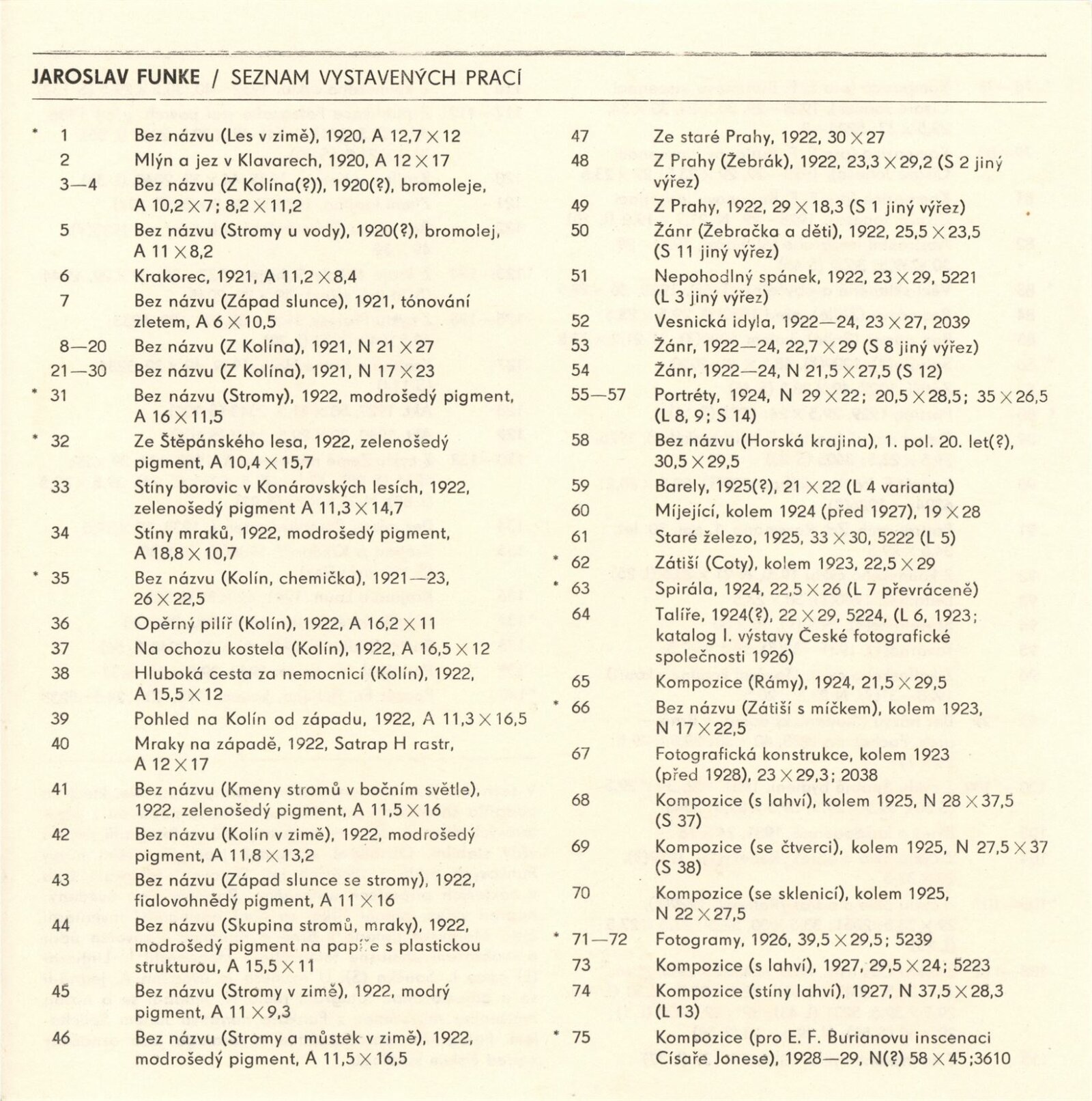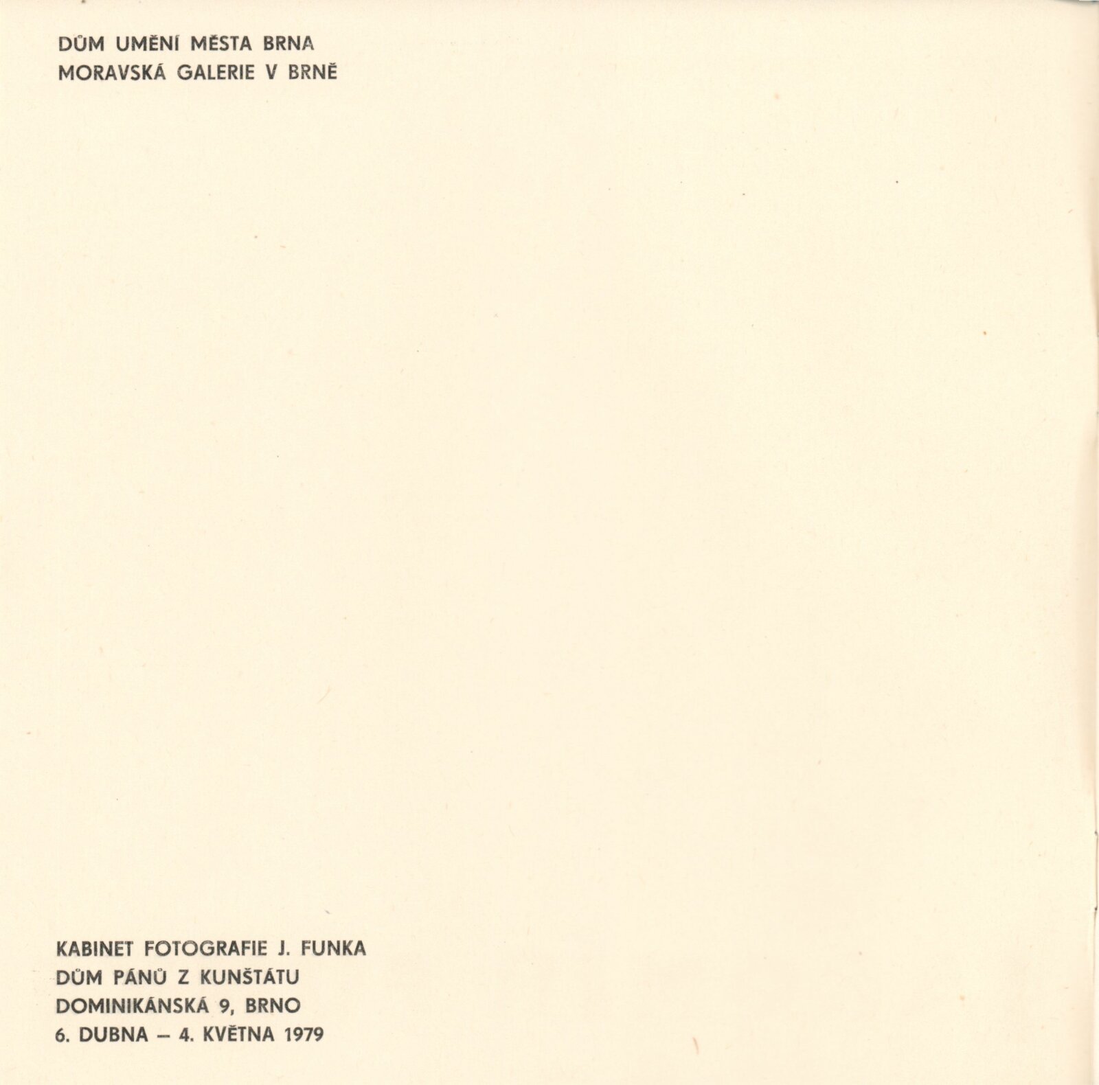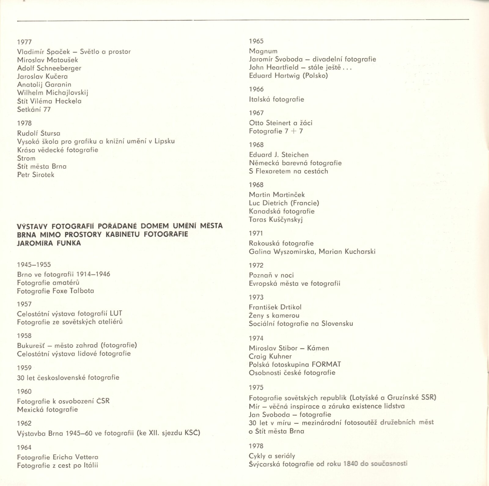 Jaromír Funke. 20. výročí Kabinetu fotografie Jaromíra Funka: Kabinet fotografie J. Funka, 170. výstava, Dům pánů z Kunštátu 6. 4. – 4. 5. 1979 / Texty Nina Dvořáková, Antonín Dufek, Jaromír Funke. - Brno: DUmB, - 36 s., obr.+ Seznam vystavených prací 2 s. Obsahuje dějiny kabinetu a seznam jeho výstav 1958 – Soupis publikační činnosti J. Funka. DPK 699; MZK; MG