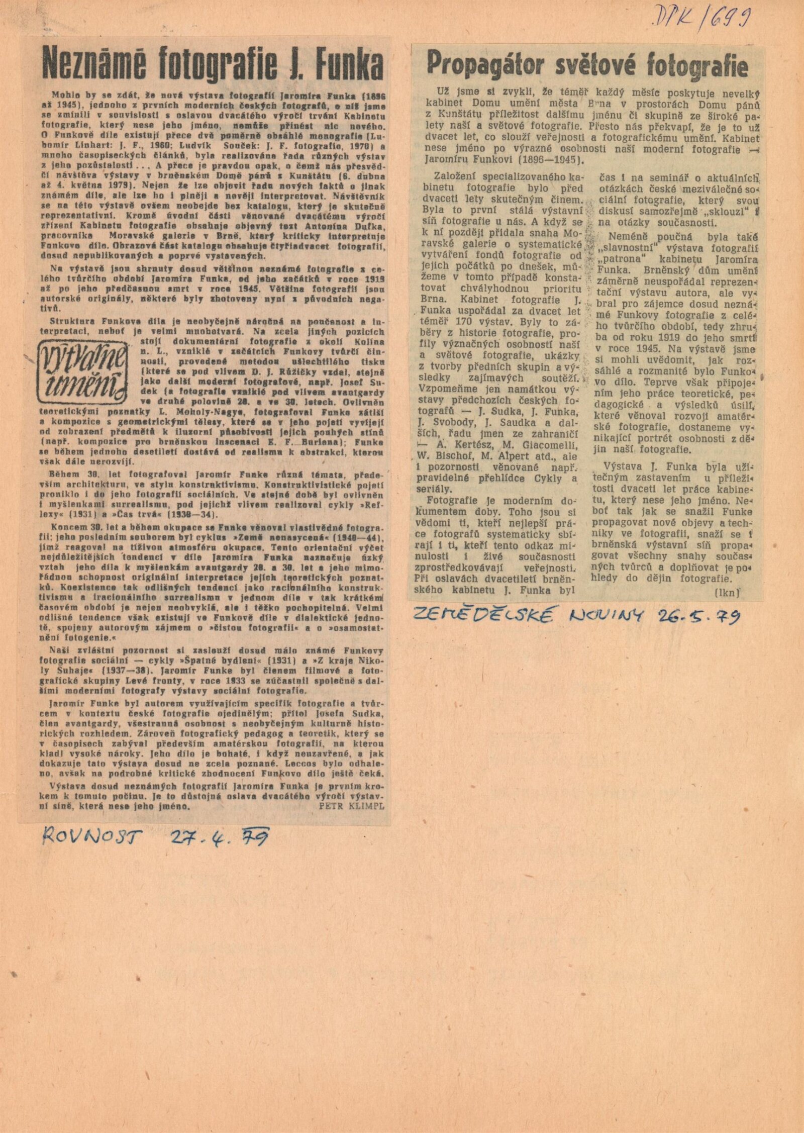 společná pozvánka pro DPK 699 a 700, katalog, reprodukce fotografií, strojopis publikační činnosti Jaromíra Funka, soupis výstav v Kabinetu fotografie mezi lety 1958–1978, seznamy vystavených fotografií, báseň Guillauma Apollinaira v překladu Adolfa Kroupy, popisky k fotografiím, korespondence – výběr (Anna Funková), žádost o povolení výstavy, revers, recenze v tisku
