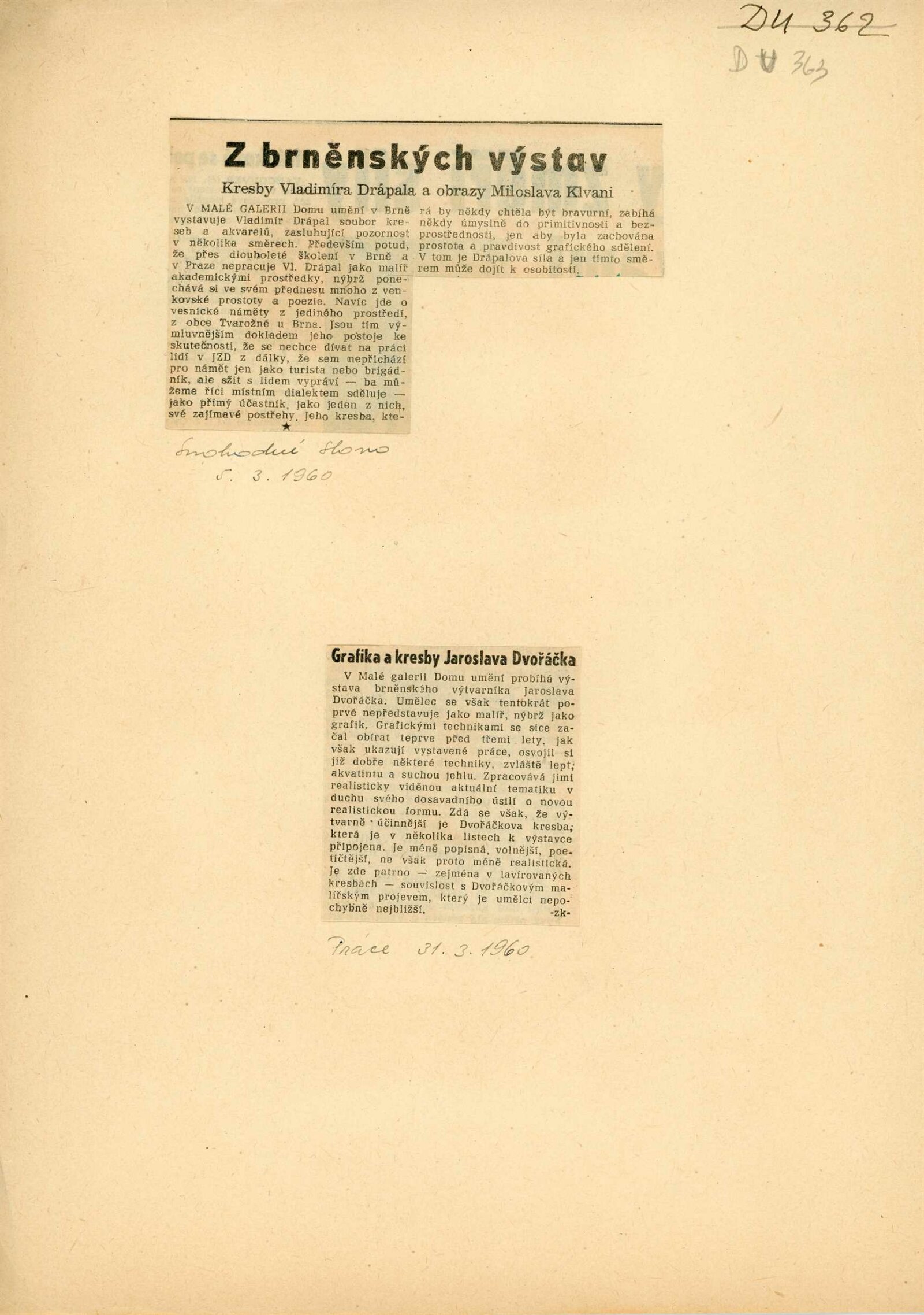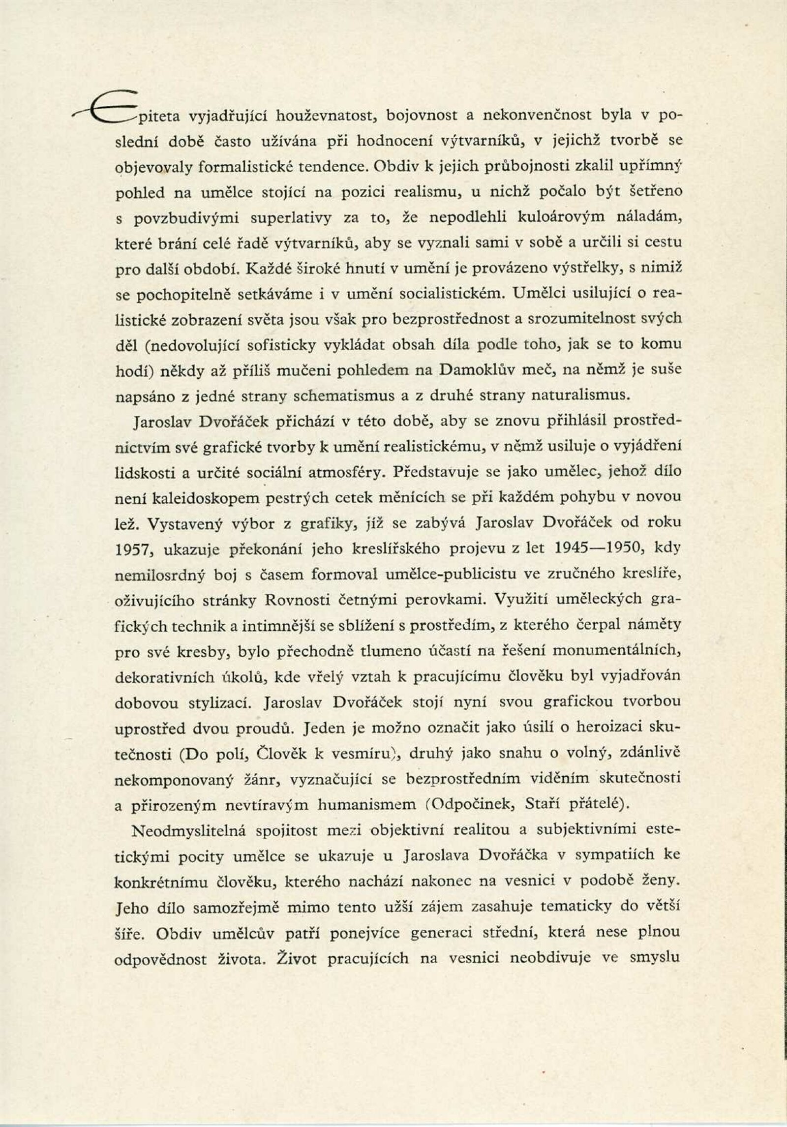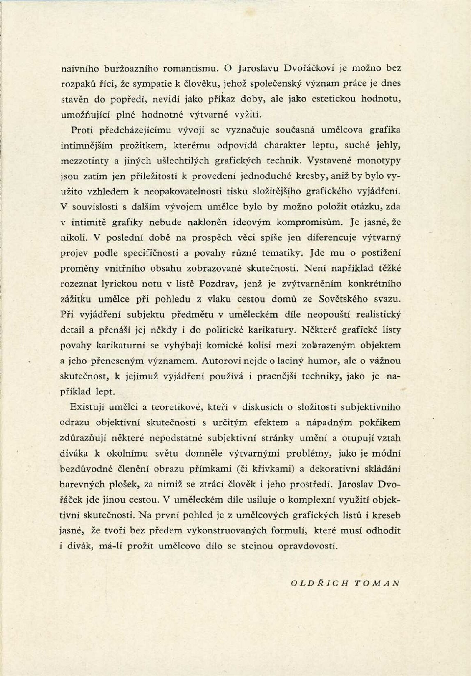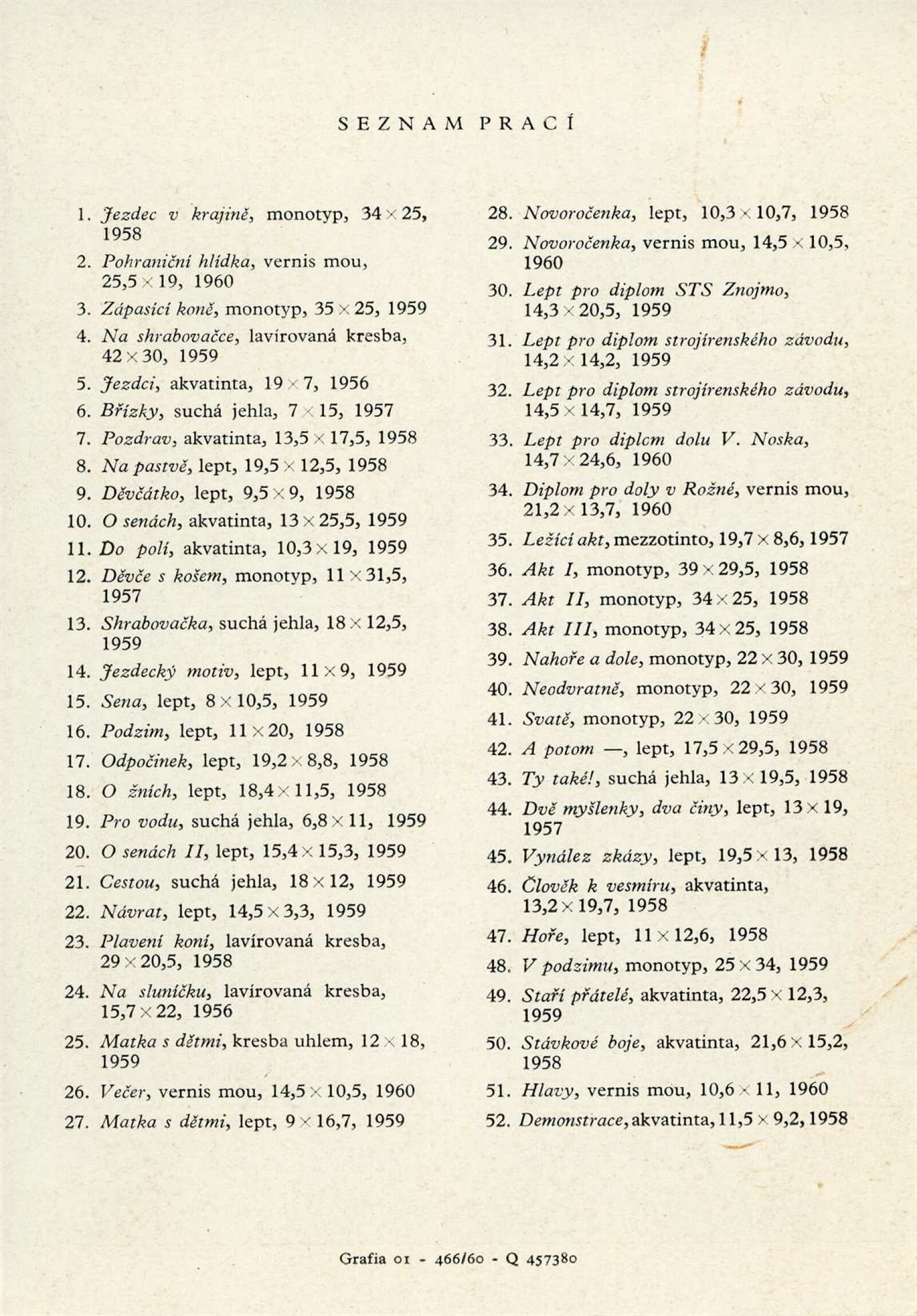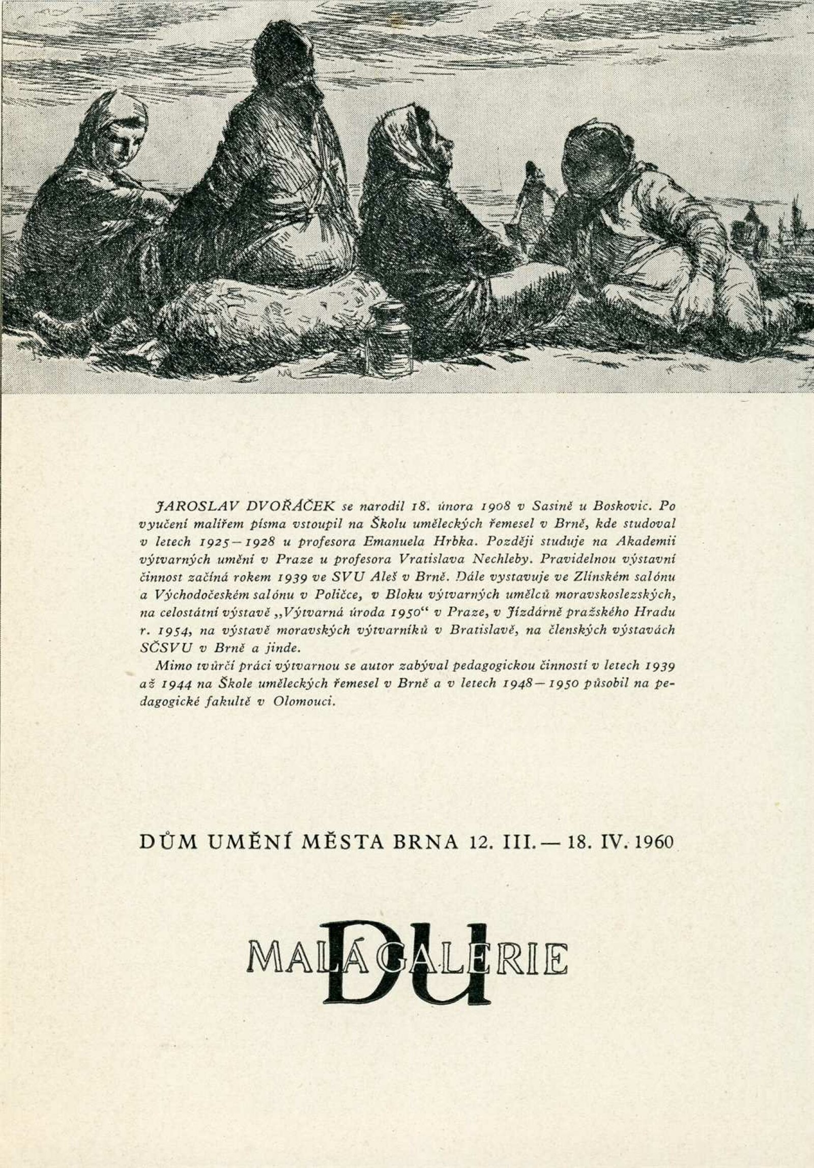 Jaroslav Dvořáček. Grafika z let 1957–1959: Dům umění, Malá galerie, 12. 3. – 18. 4. 1960 / Text: Oldřich Toman. – Brno: DUmB, 1960. – skládačka, 6 s., obr., DU 363. – MZK; MG; MMB