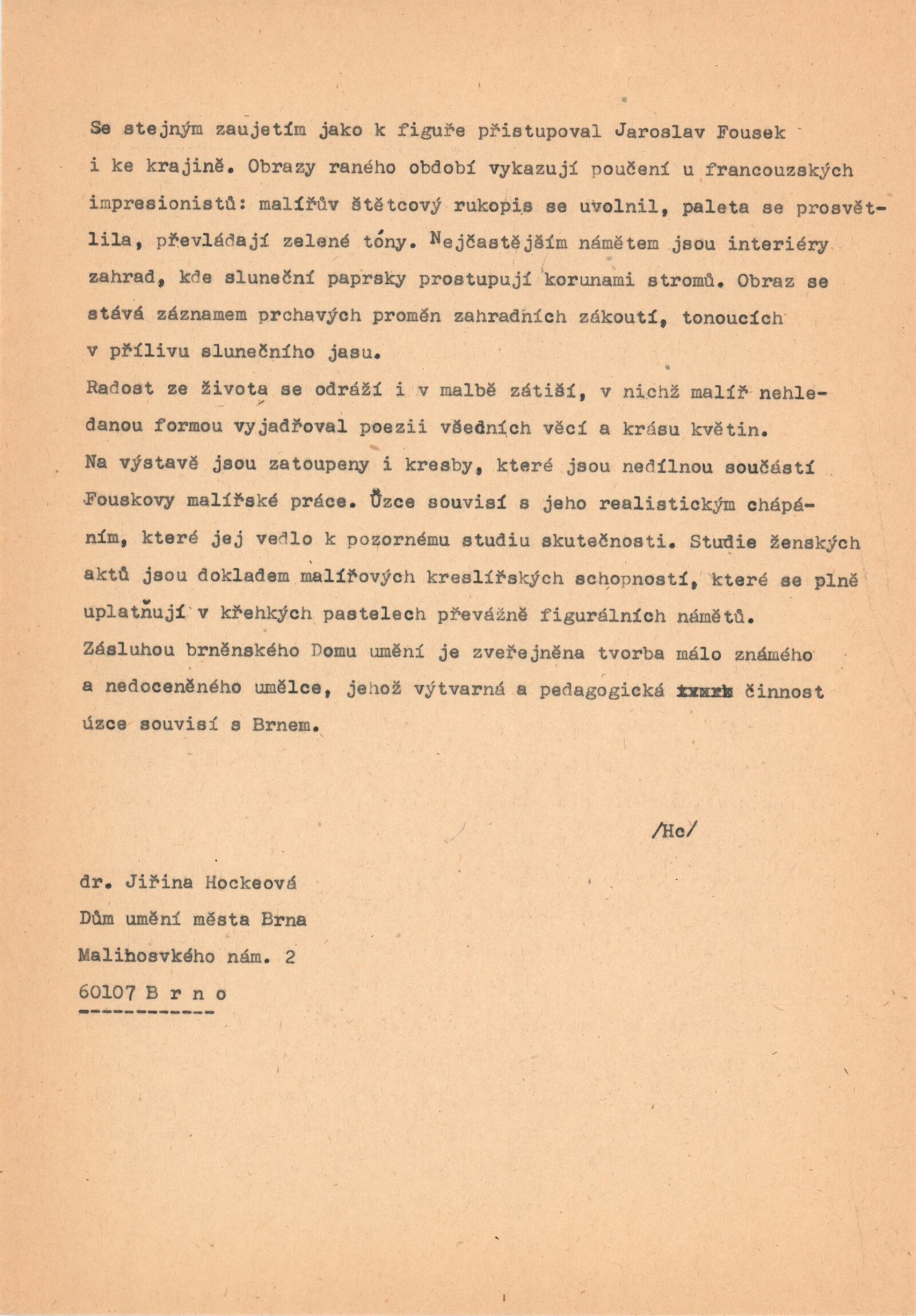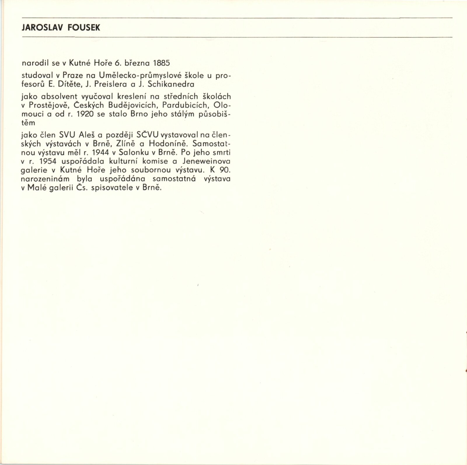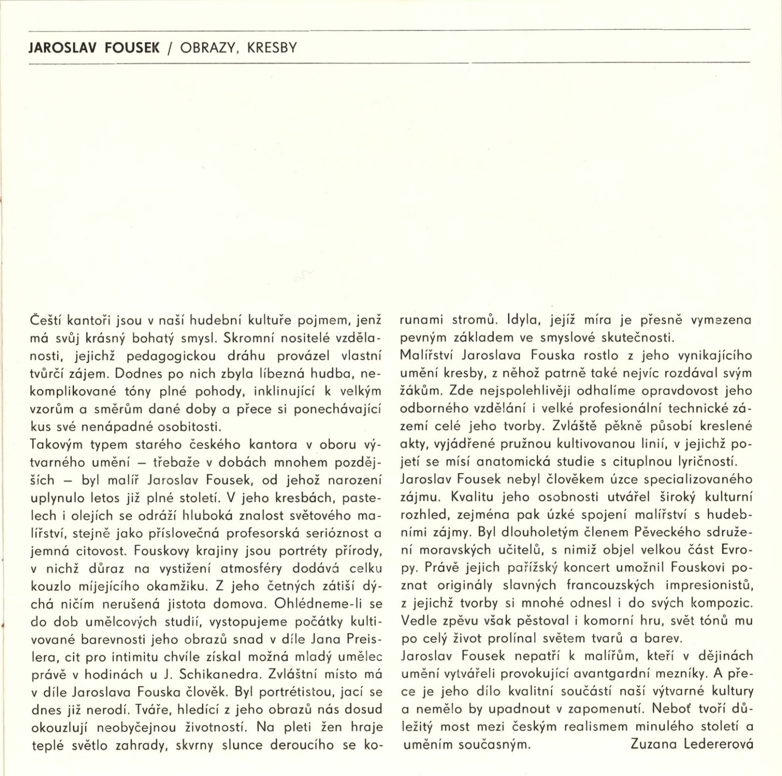Jaroslav Fousek. Obrazy, kresby: Dům umění / Dům pánů z Kunštátu, 25. 6. – 21. 7. 1985 / Text: Zuzana Ledererová. – Brno: DUmB, 1985. – 8 s., obr., seznam vystavených prací 2 s., životopis, DPK 849. – MZK; MG; MMB