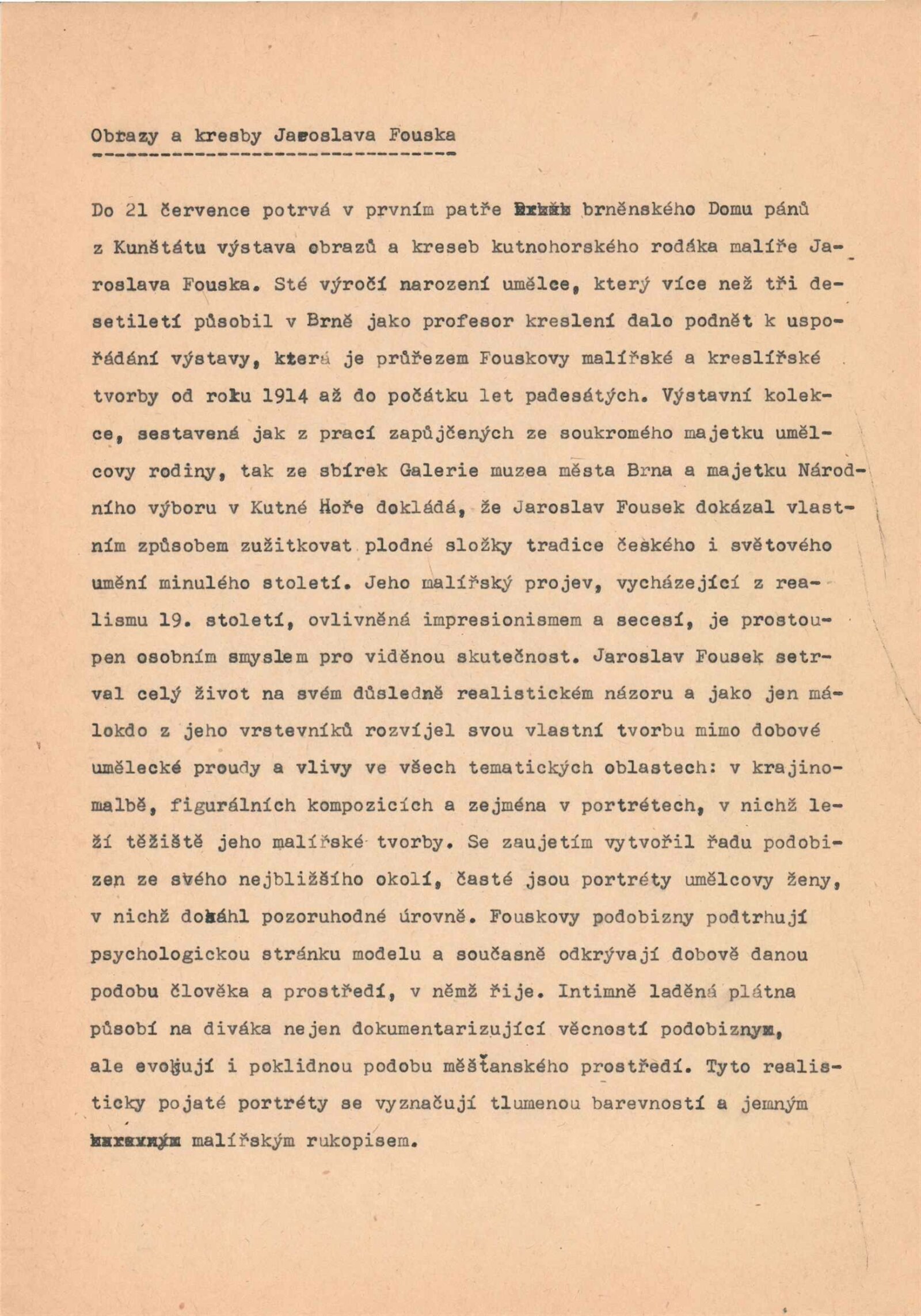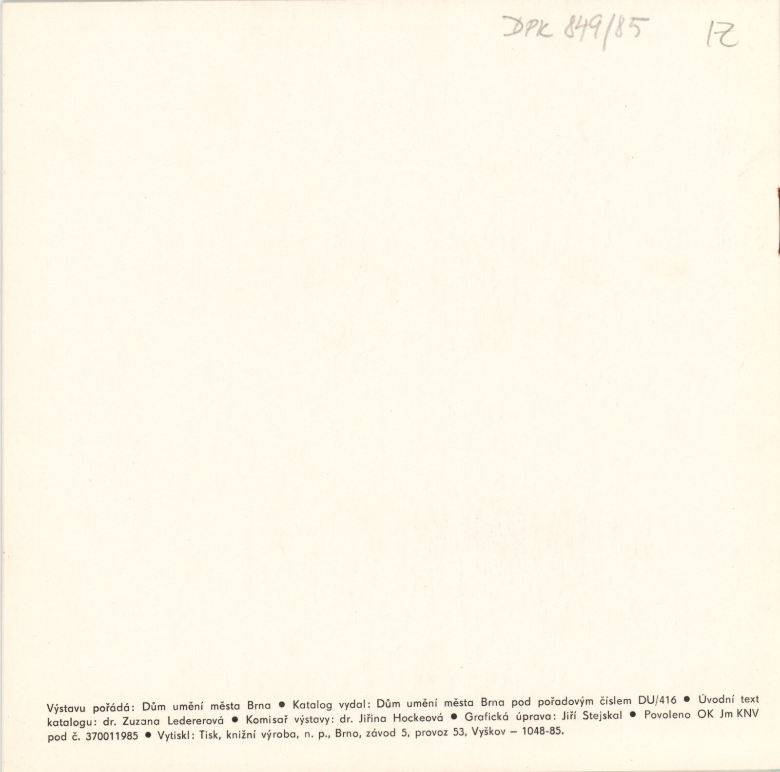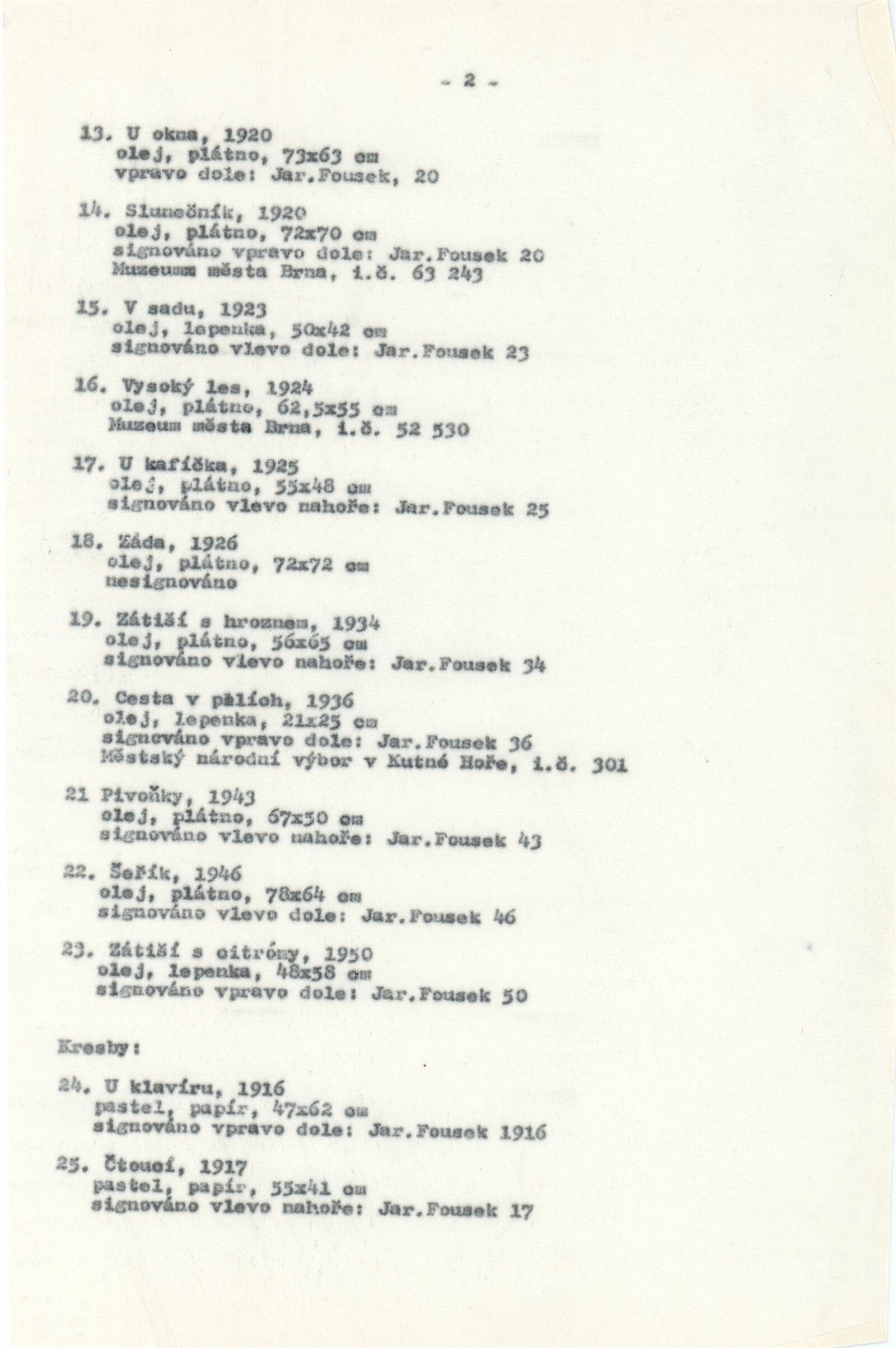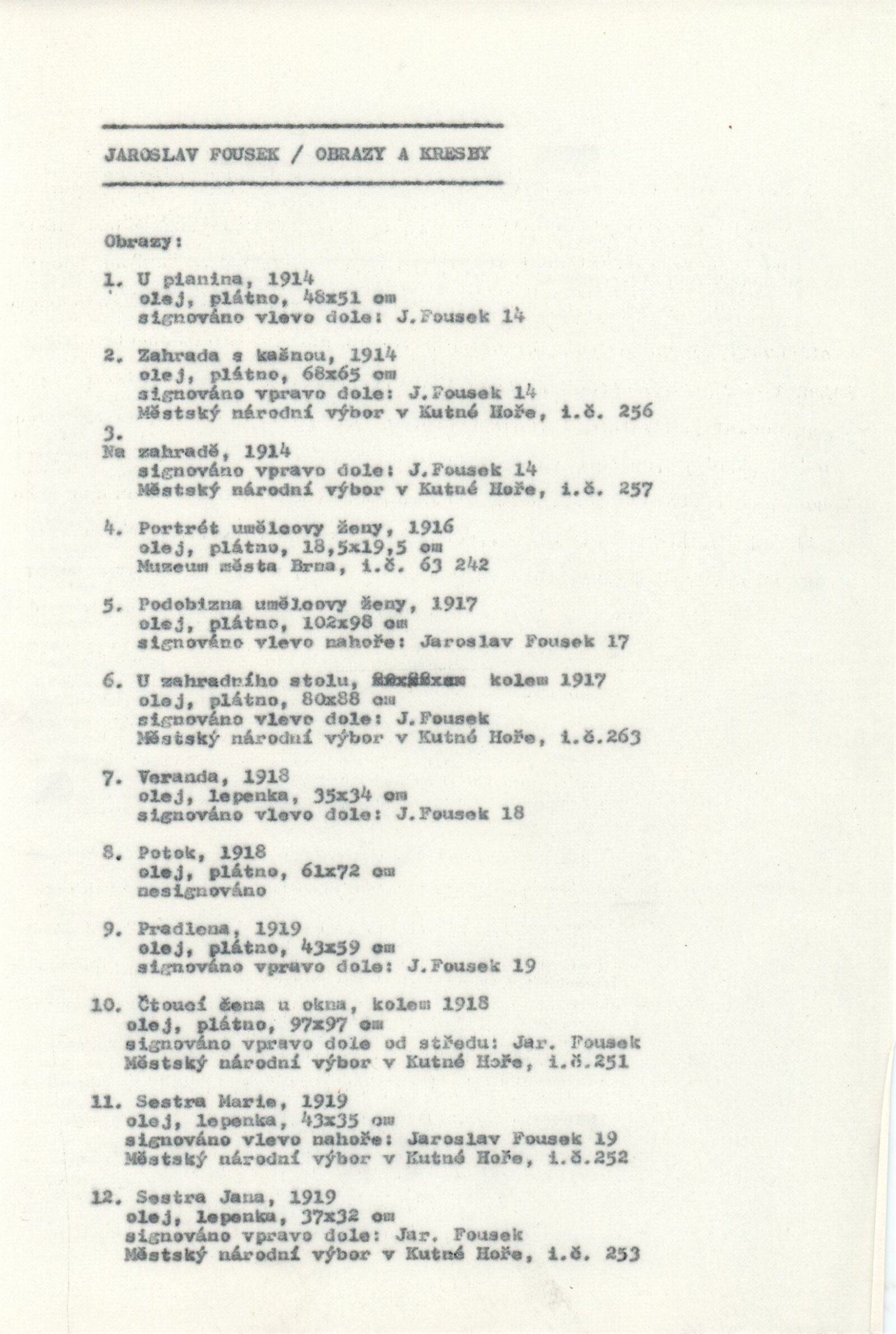 Jaroslav Fousek. Obrazy, kresby: Dům umění / Dům pánů z Kunštátu, 25. 6. – 21. 7. 1985 / Text: Zuzana Ledererová. – Brno: DUmB, 1985. – 8 s., obr., seznam vystavených prací 2 s., životopis, DPK 849. – MZK; MG; MMB