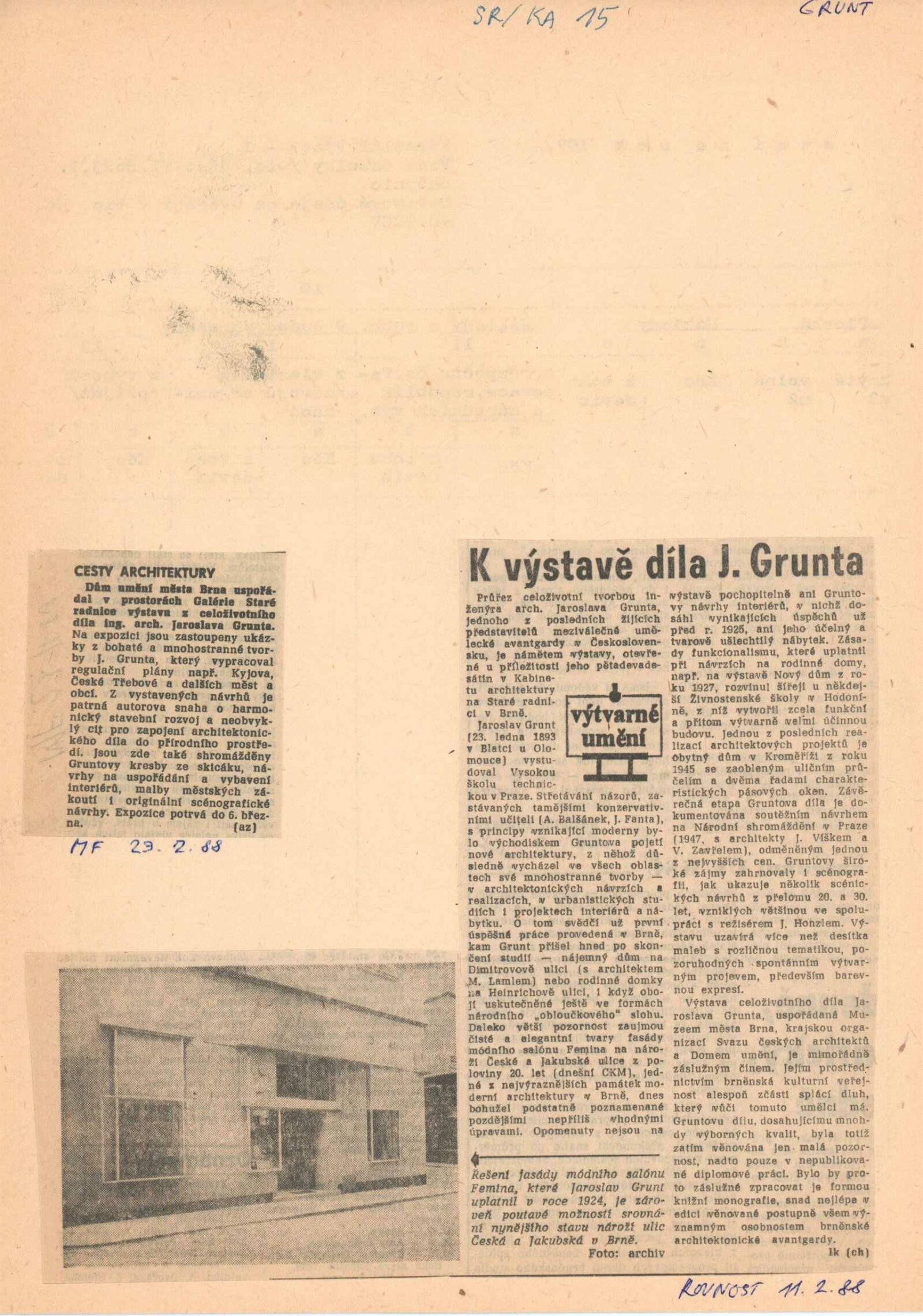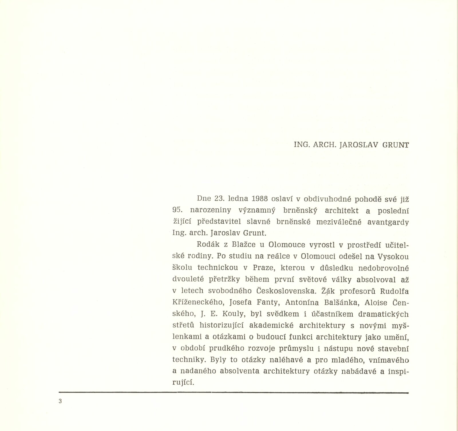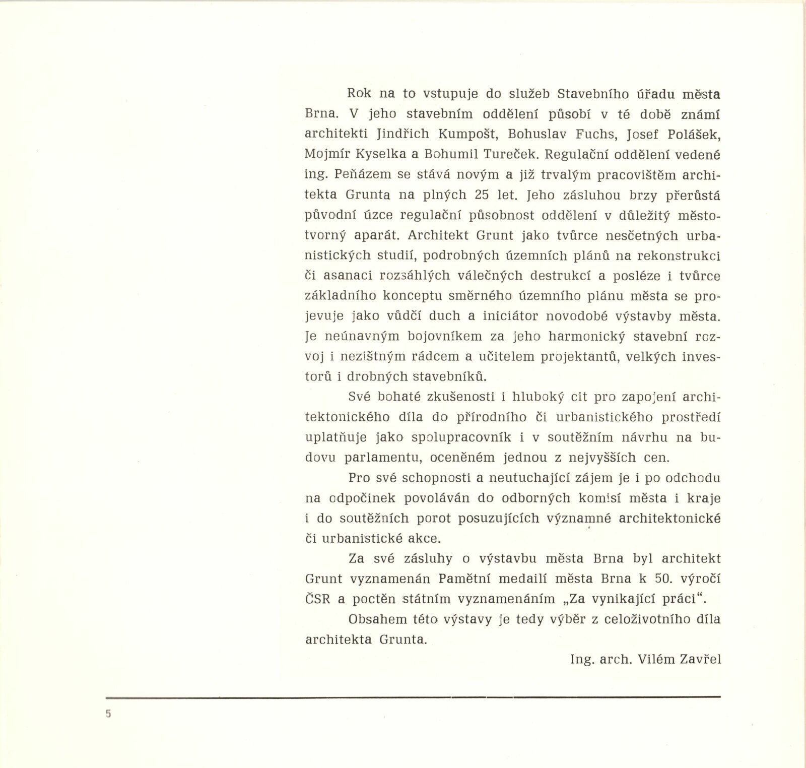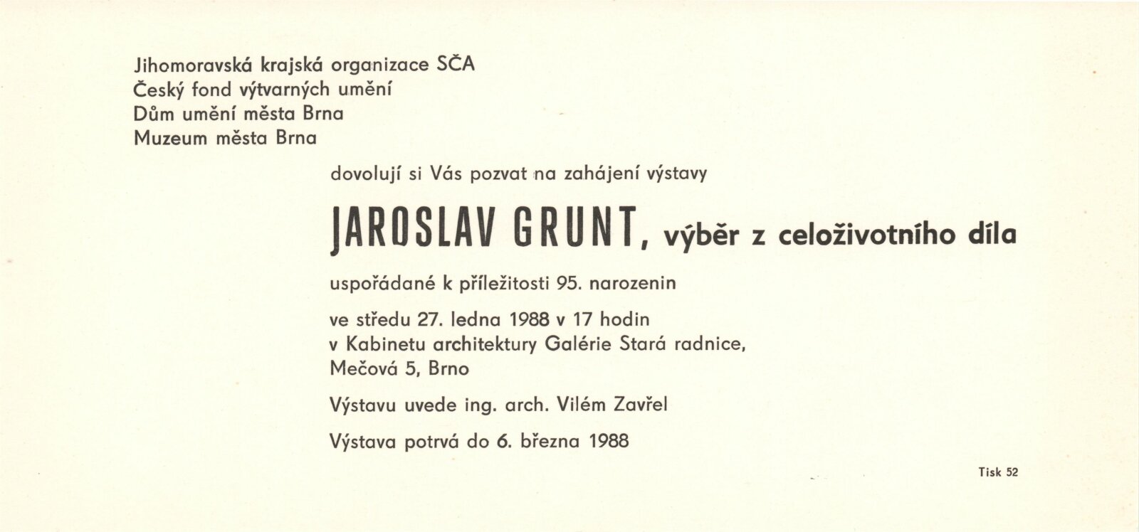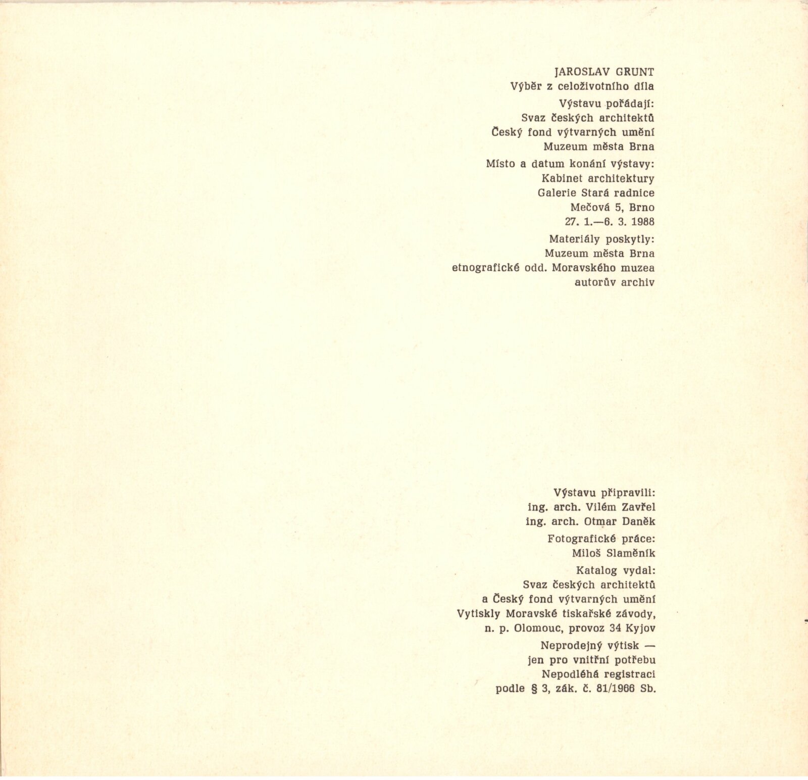 Jaroslav Grunt. Výběr z celoživotního díla: Galerie Stará radnice, Kabinet architektury, 27. 1. – 6. 3. 1988 / Text: Vilém Zavřel. – Brno: Svaz českých architektů, 1988. – 16 s., obr., GSR 15