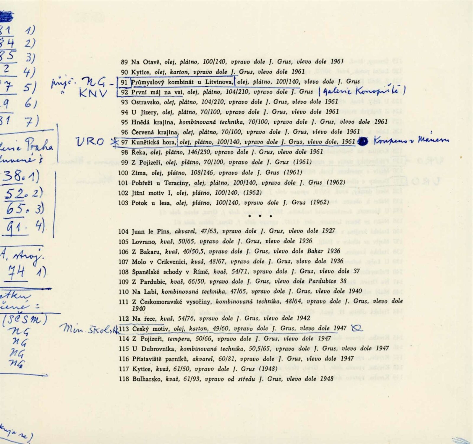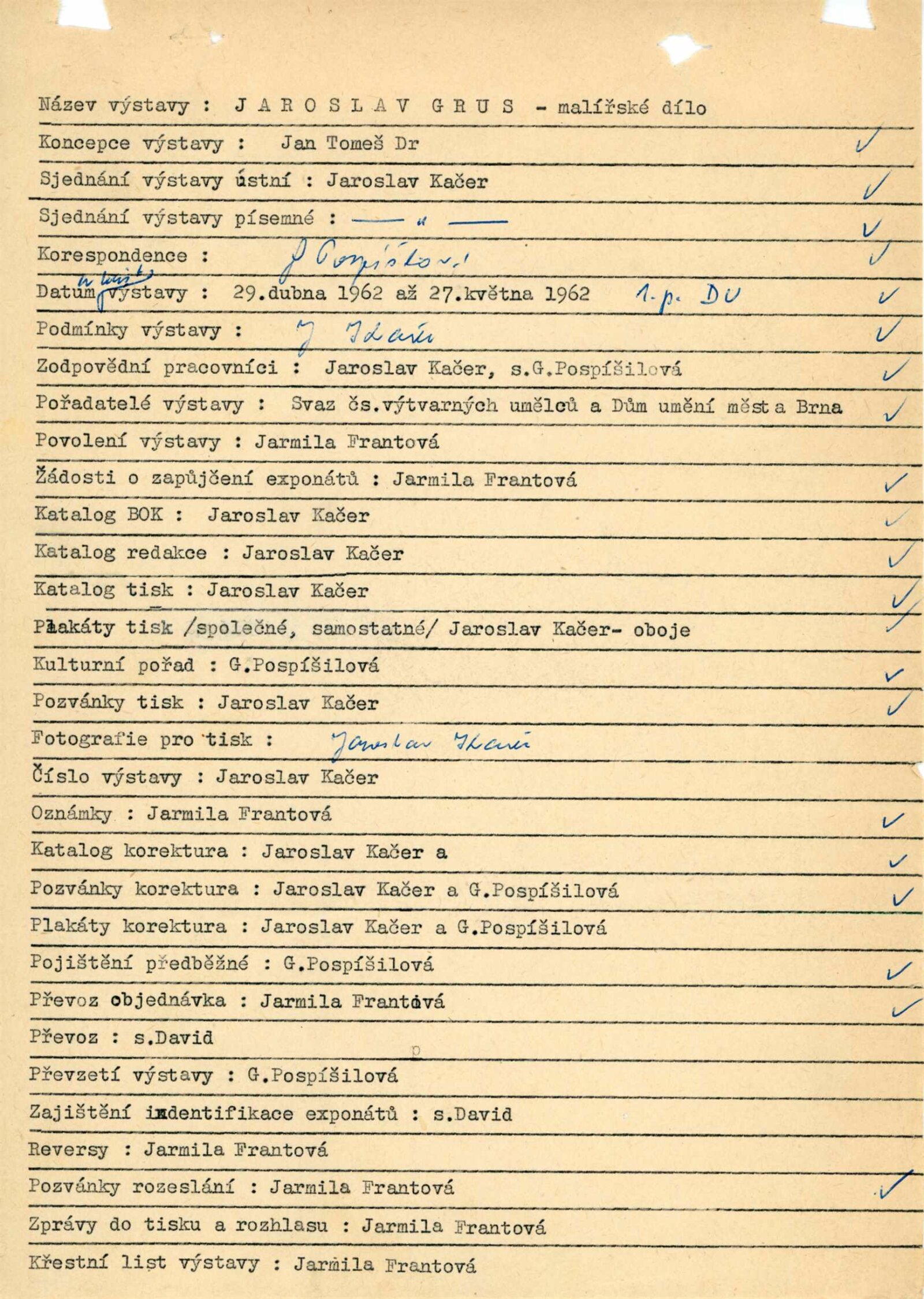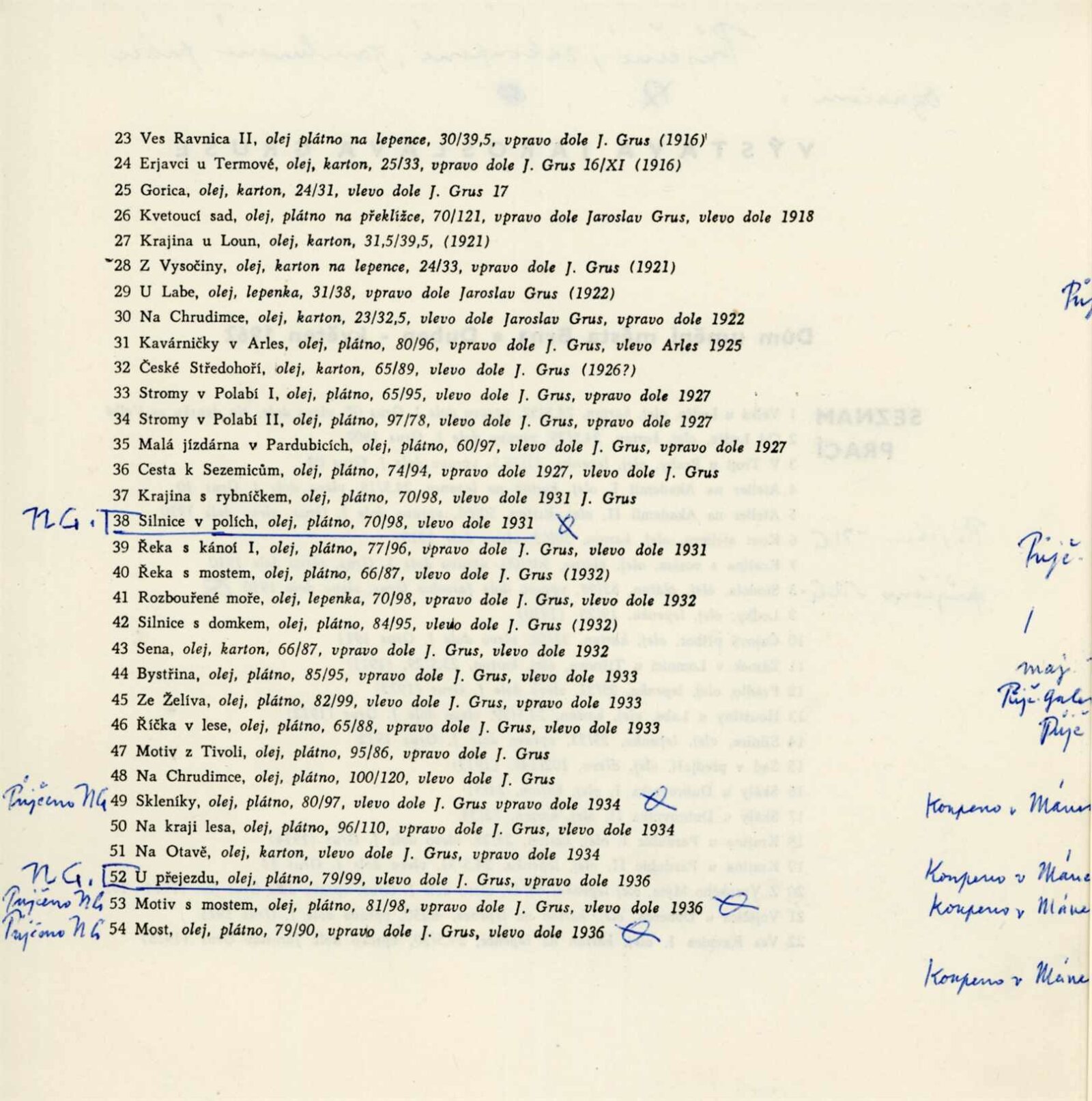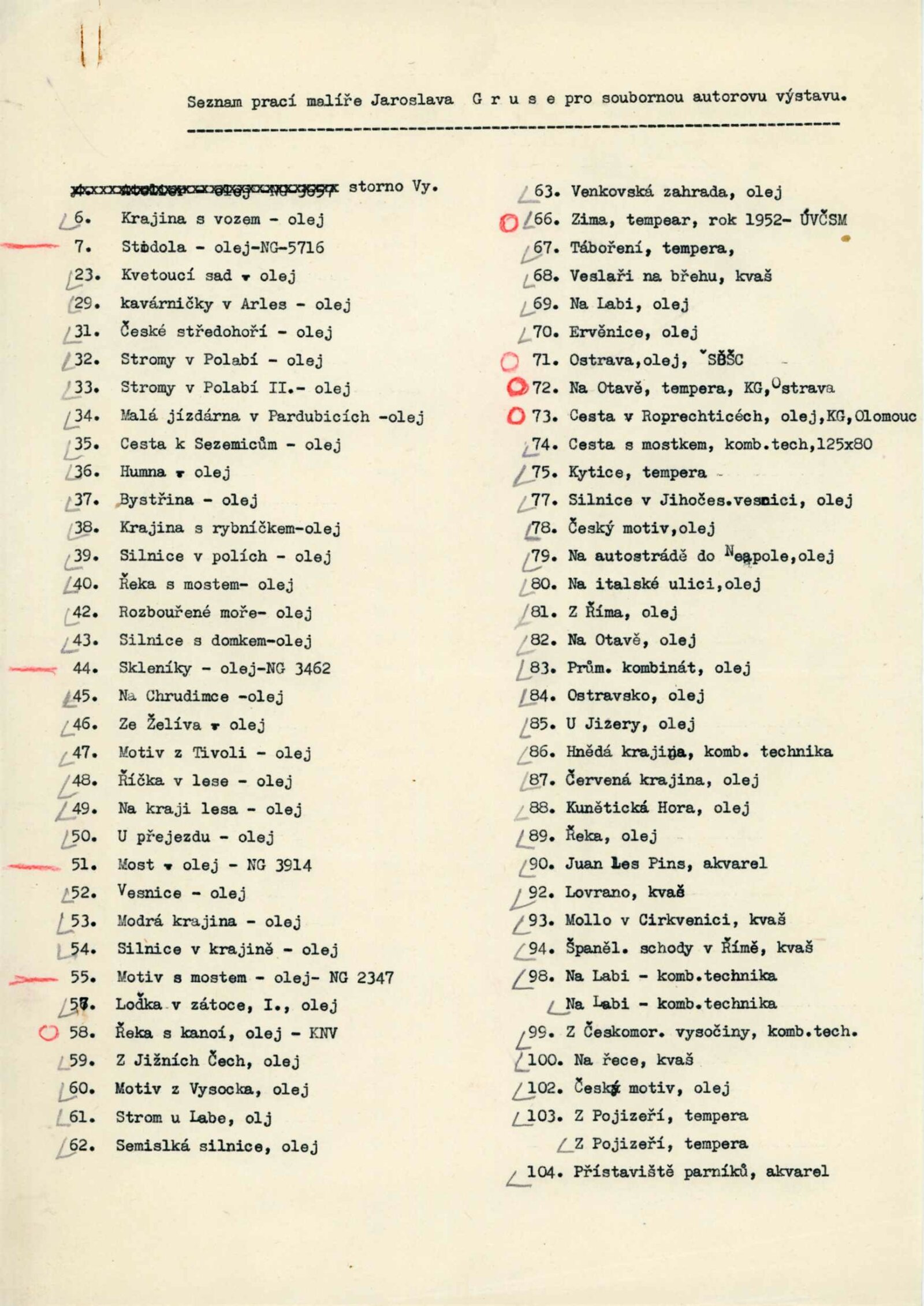 pozvánka, katalog, list k výstavě, podmínky uspořádání výstavy, seznam prací, fotografie děl, korespondence (s Jaroslavem Grusem, s Janem Tomešem, GU Karlovy Vary o převzetí výstavy), reverzy, pozvánka z Mánesa