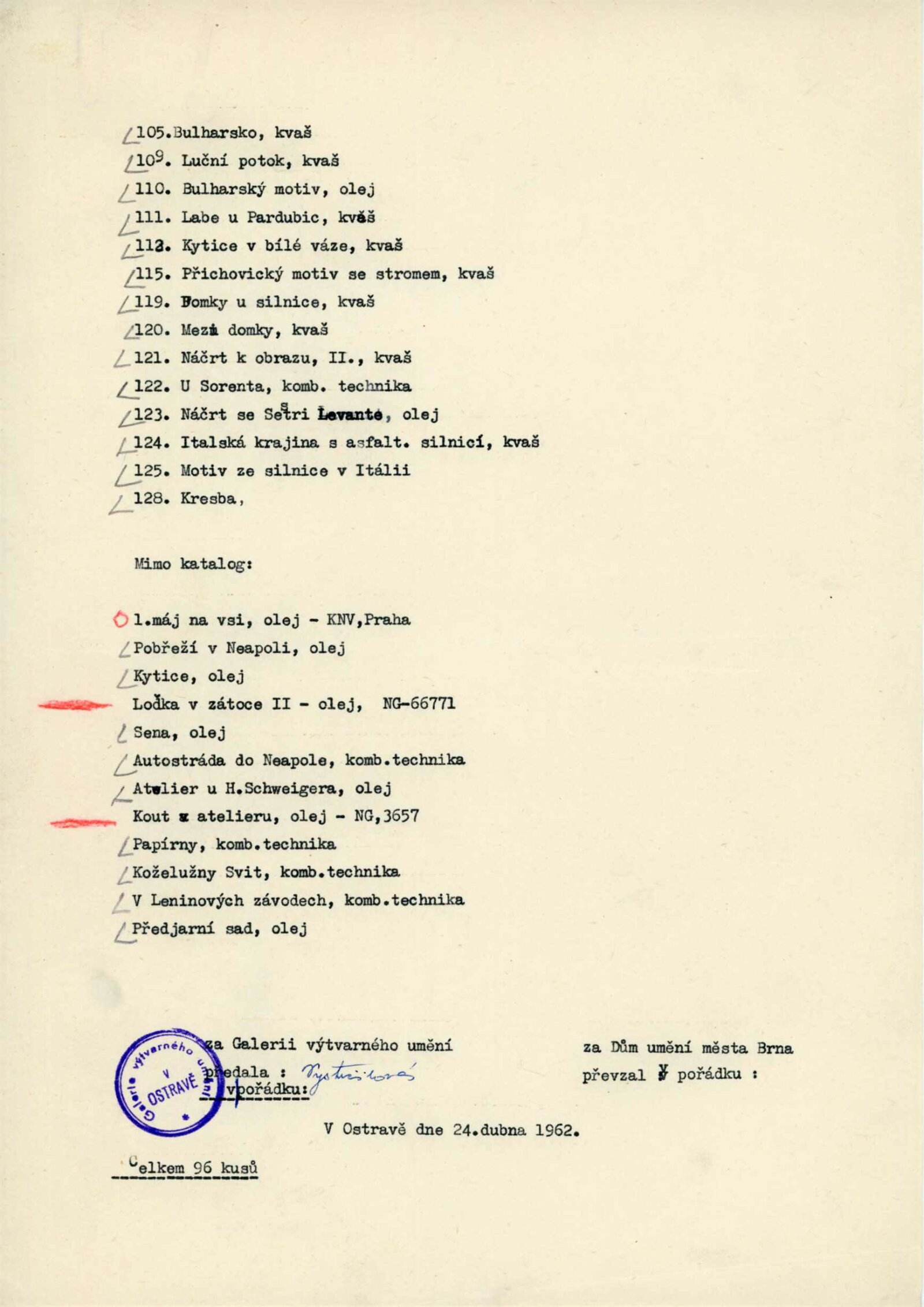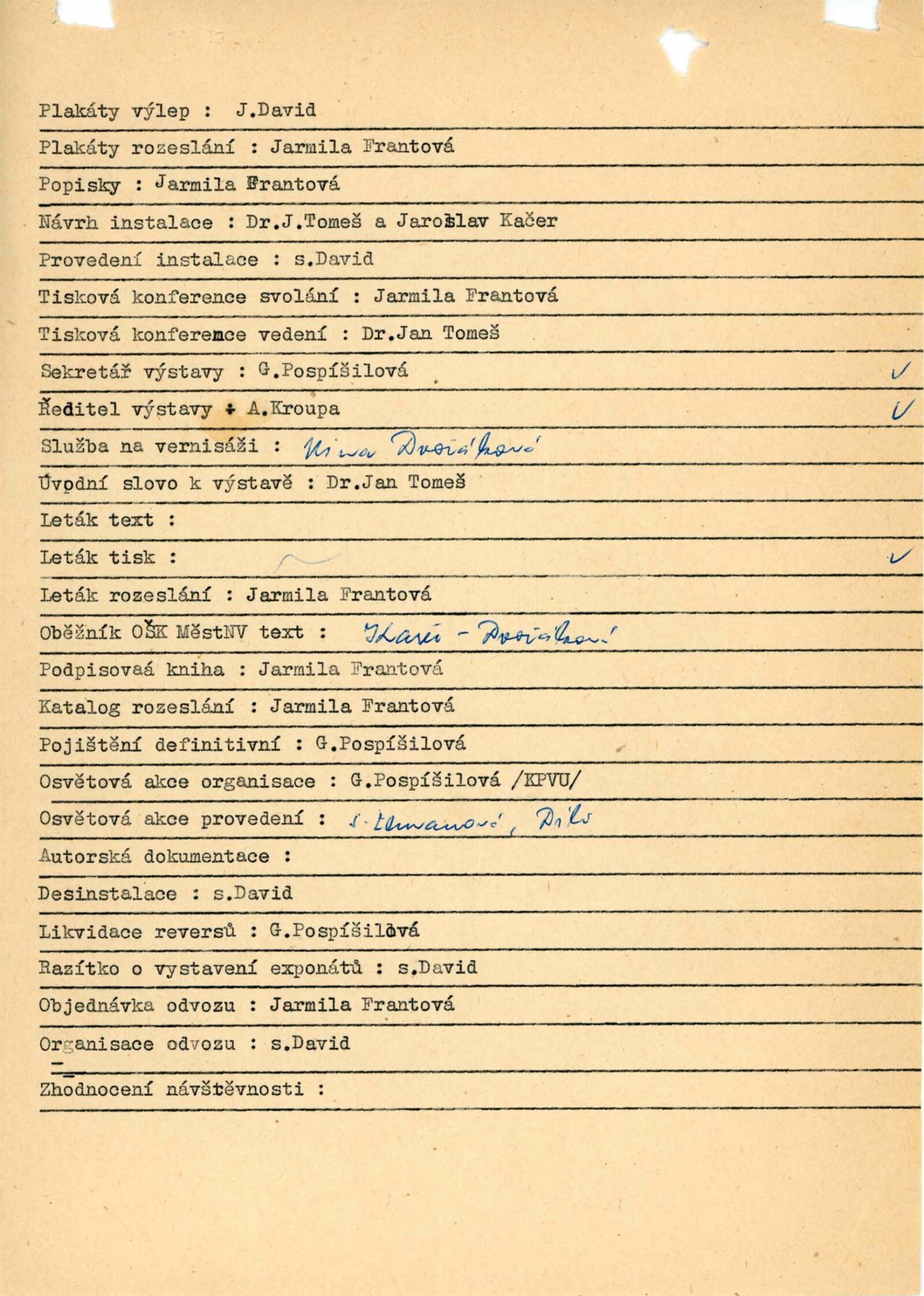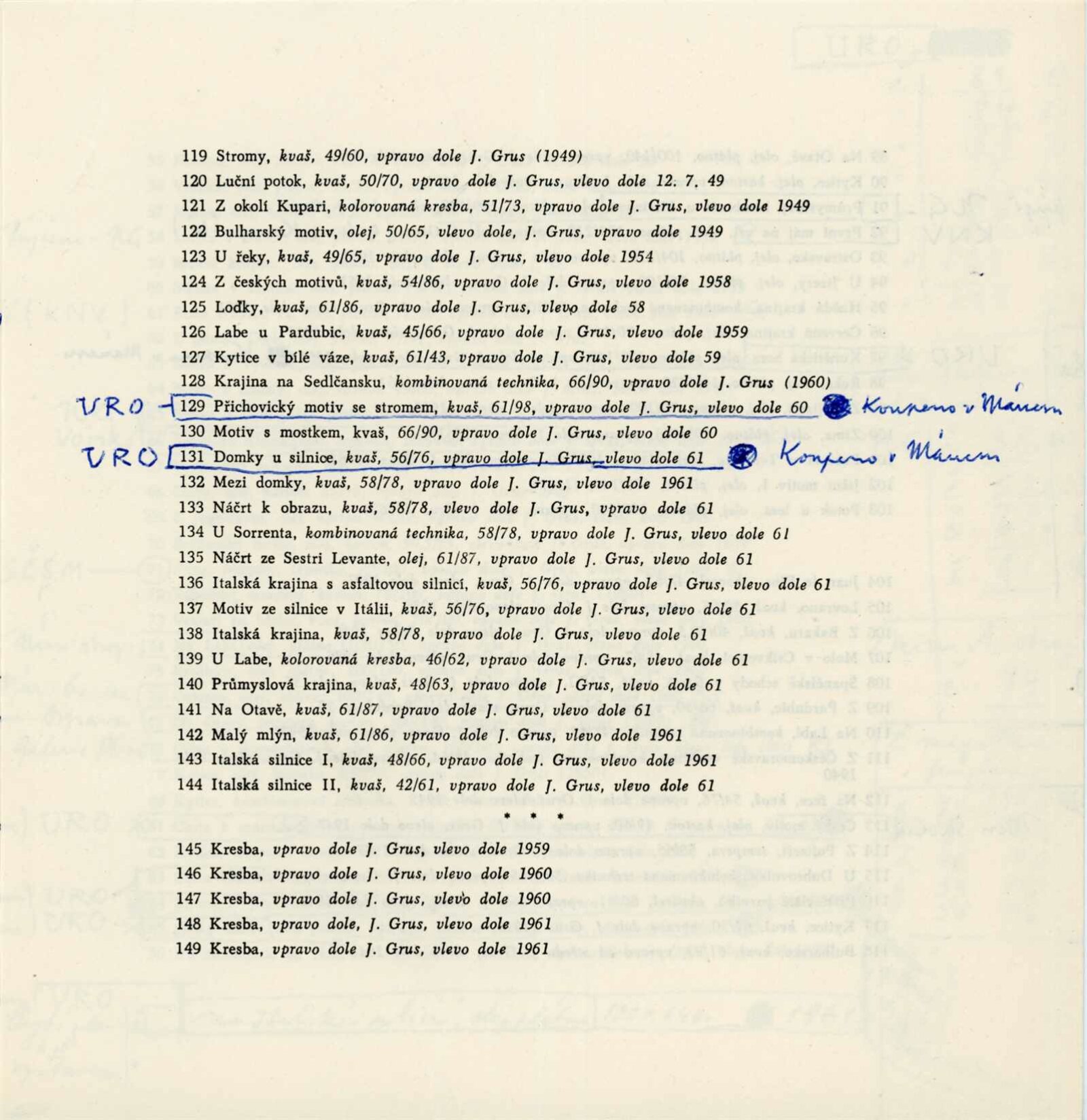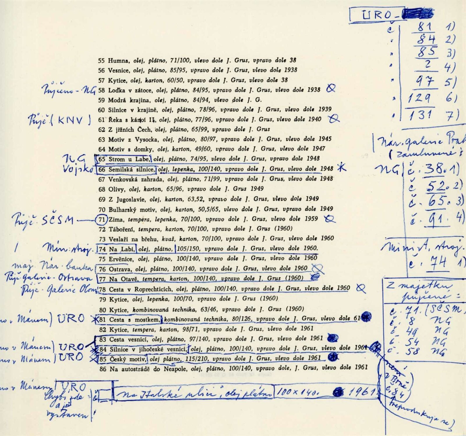 pozvánka, katalog, list k výstavě, podmínky uspořádání výstavy, seznam prací, fotografie děl, korespondence (s Jaroslavem Grusem, s Janem Tomešem, GU Karlovy Vary o převzetí výstavy), reverzy, pozvánka z Mánesa