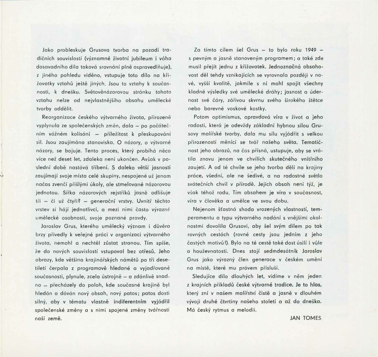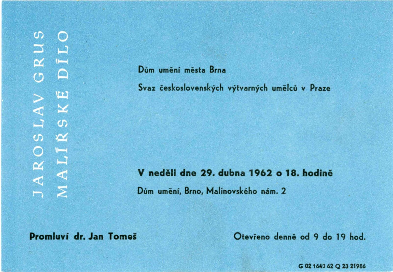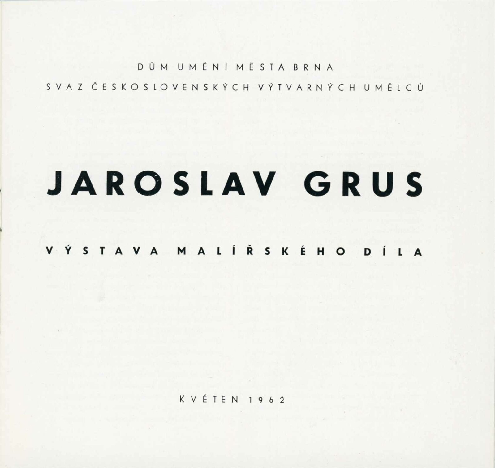 Jaroslav Grus. Výstava malířského díla: Dům umění města Brna, 1. patro, 29. 4. – 27. 5. 1962 / Text: Jan Tomeš. – Brno: DUmB, 1962. – 14 s., obr., seznam prací, skládačka 6 s., DU 412. – MG; MMB
