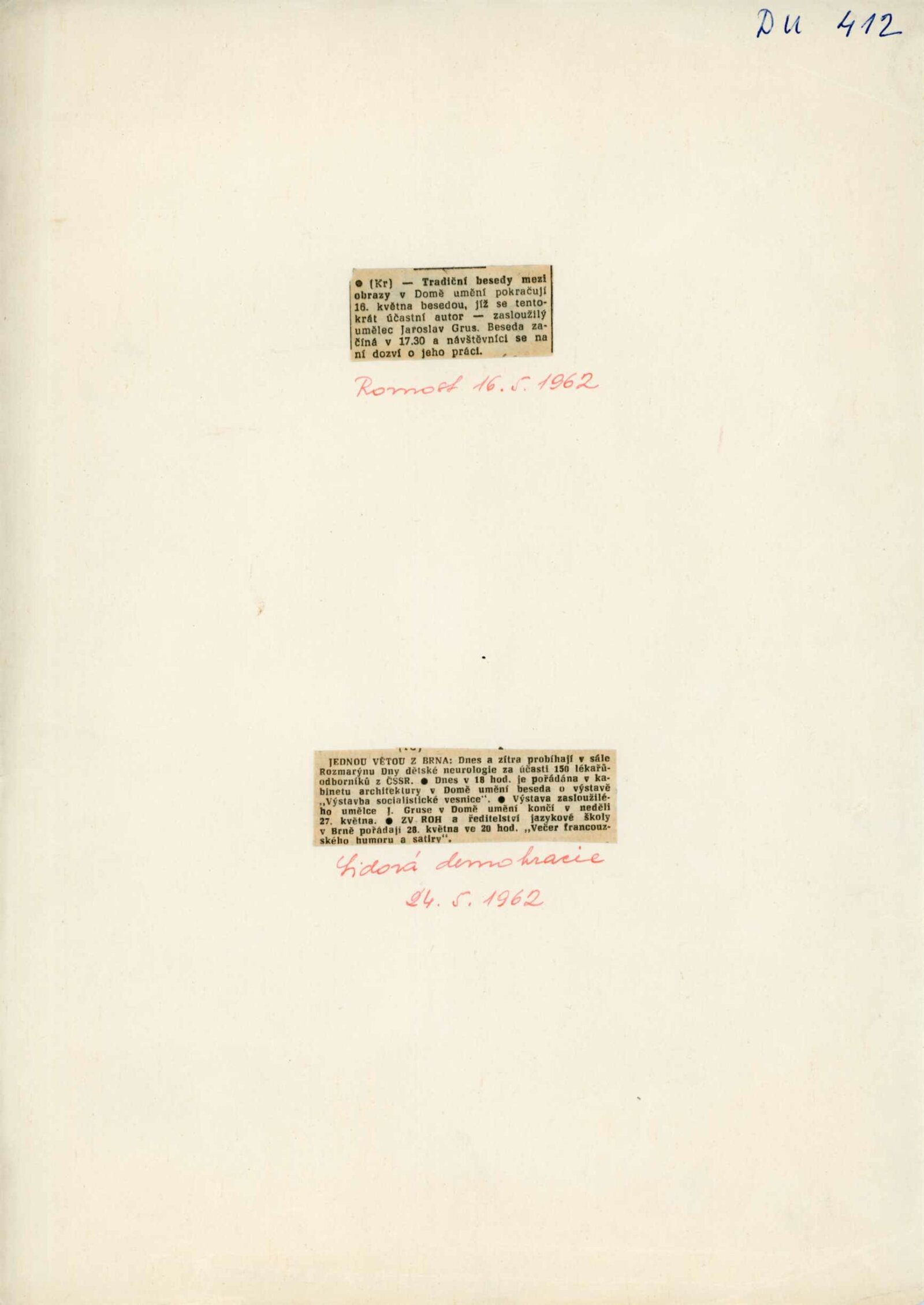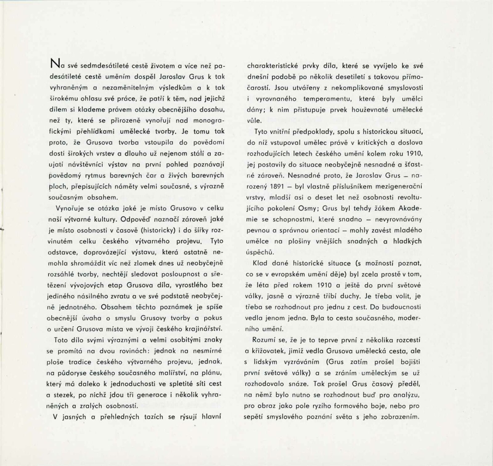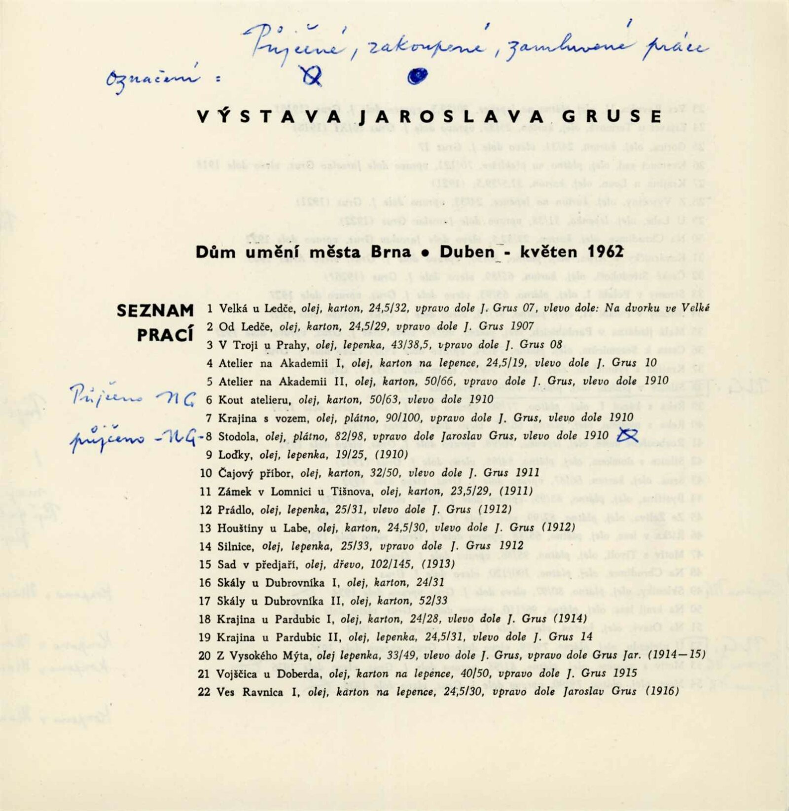 Jaroslav Grus. Výstava malířského díla: Dům umění města Brna, 1. patro, 29. 4. – 27. 5. 1962 / Text: Jan Tomeš. – Brno: DUmB, 1962. – 14 s., obr., seznam prací, skládačka 6 s., DU 412. – MG; MMB