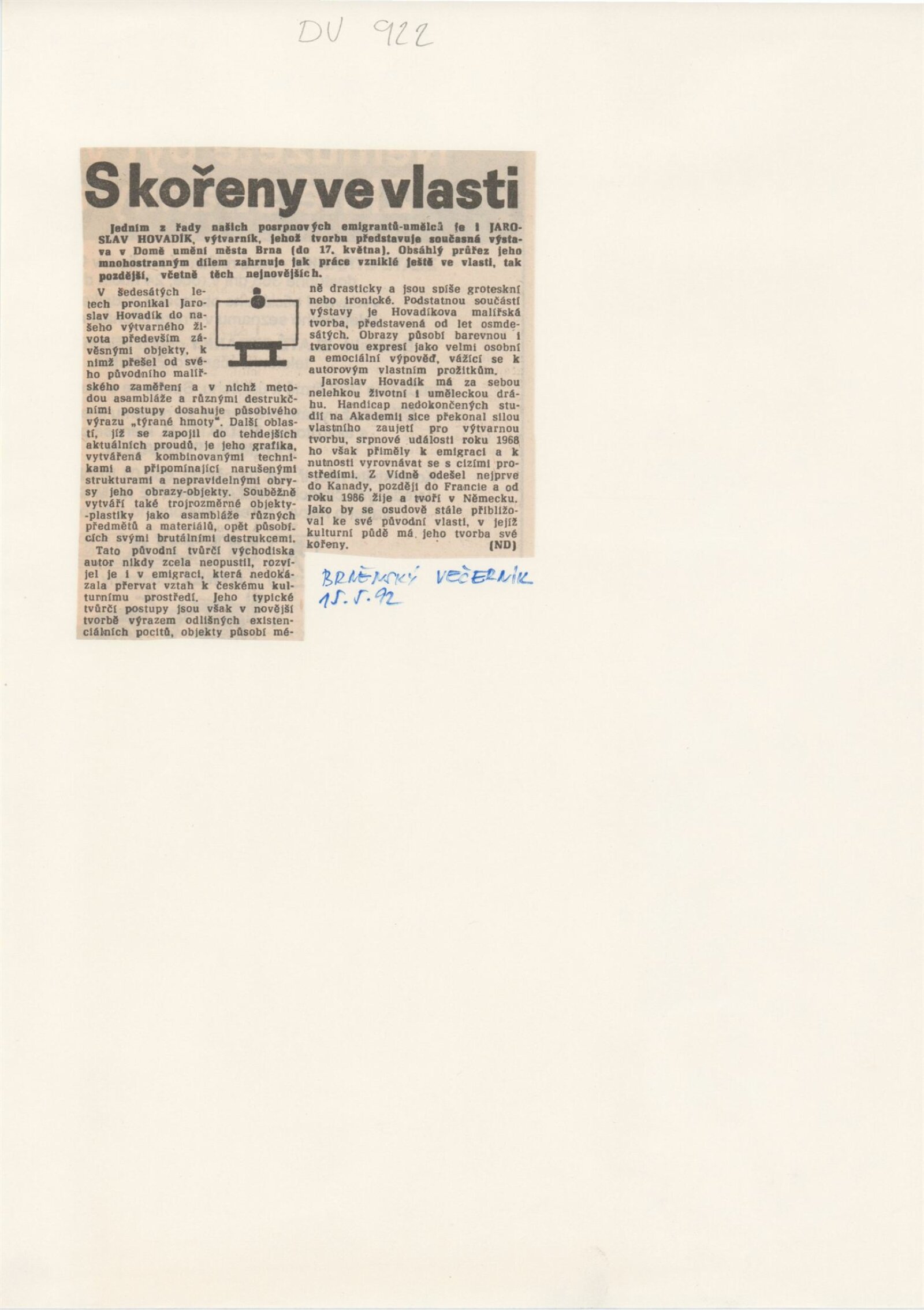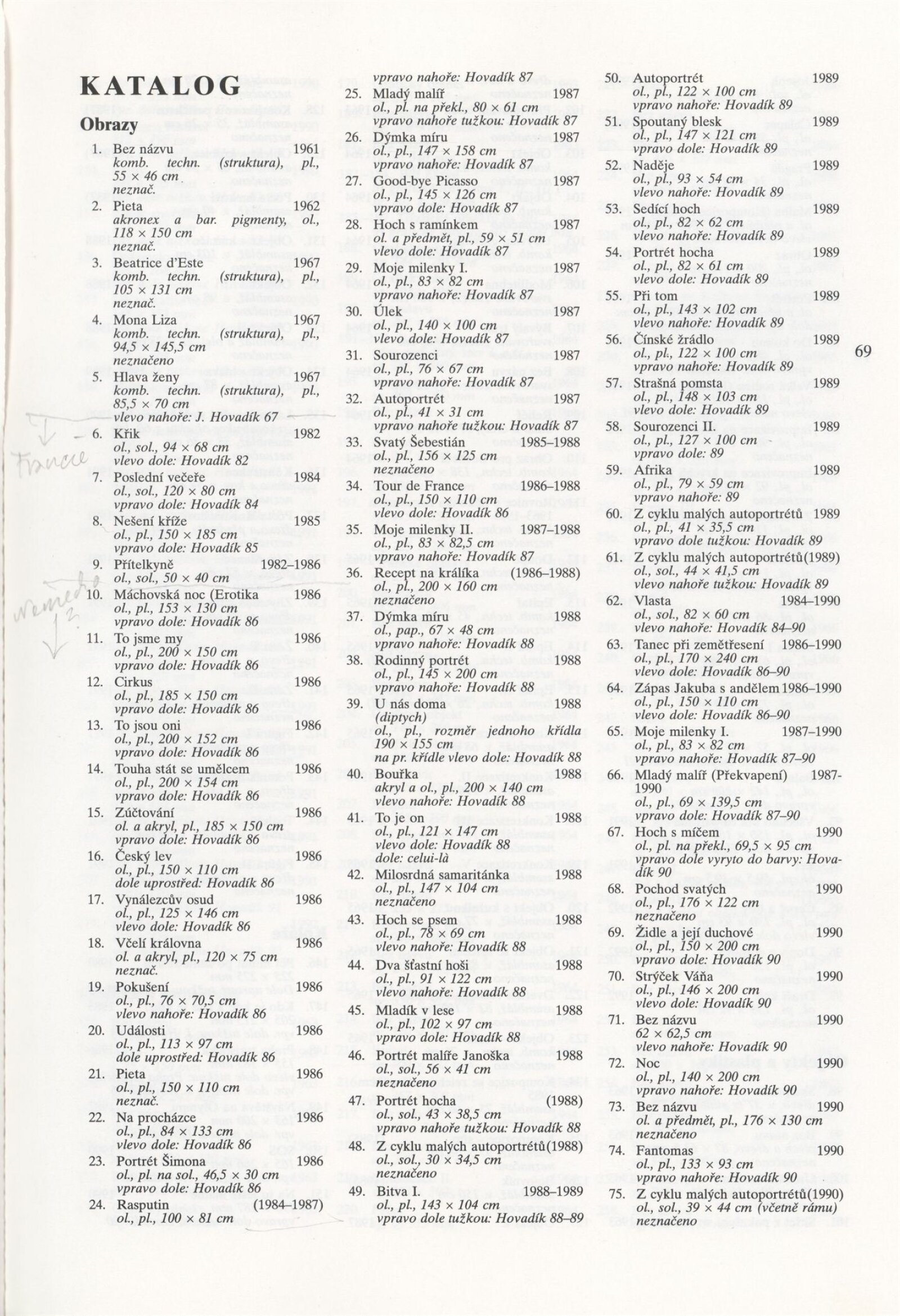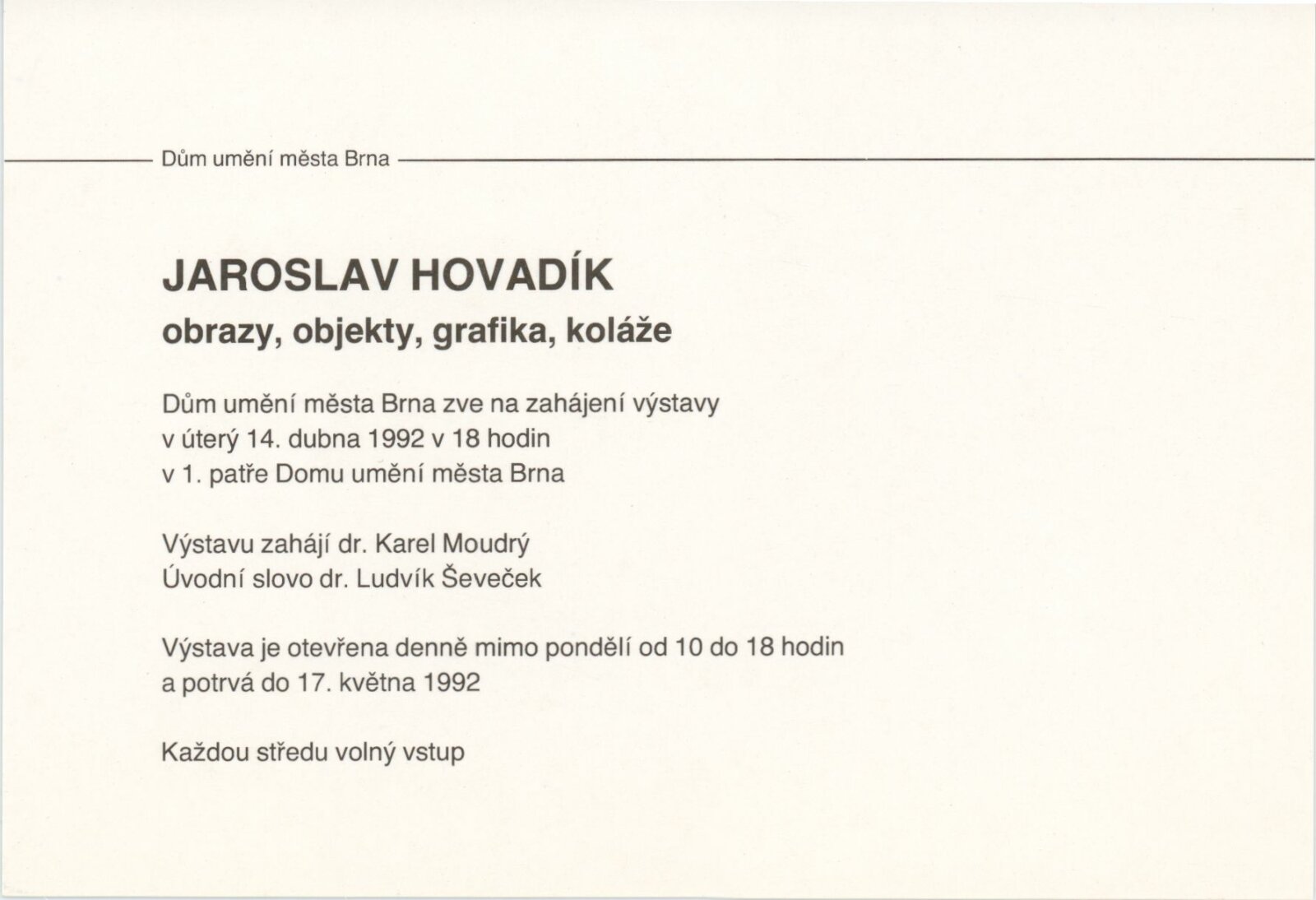 Jaroslav Hovadík. Obrazy, objekty, grafika, koláže: Dům umění města Brna, 14. 4. – 17. 5. 1992 / Text Ludvík Ševeček. – Zlín: Státní galerie, 1992. – 72 s., obr., portrét, životní data, výstavy, zastoupení ve sbírkách, ceny, bibliografie, DU 922