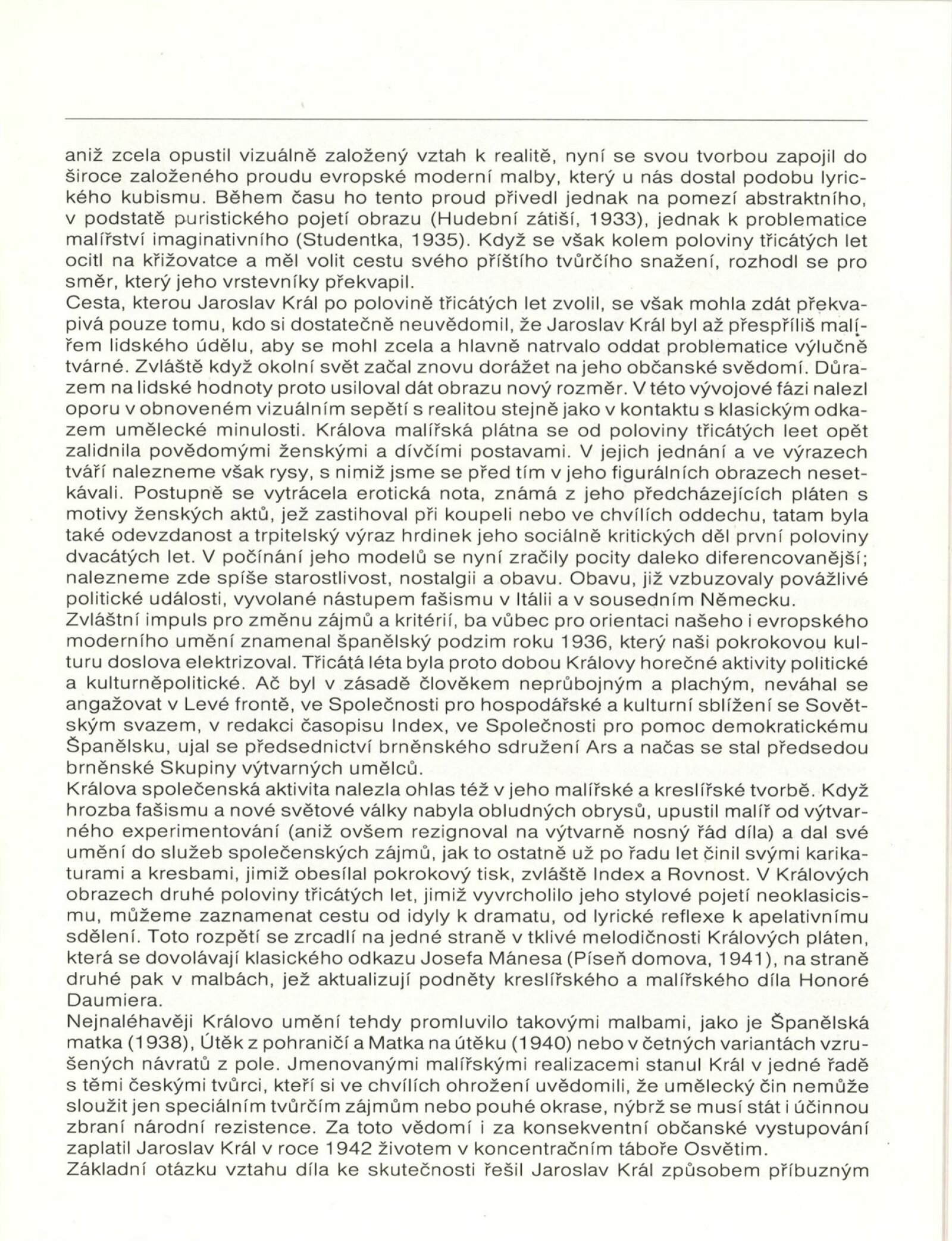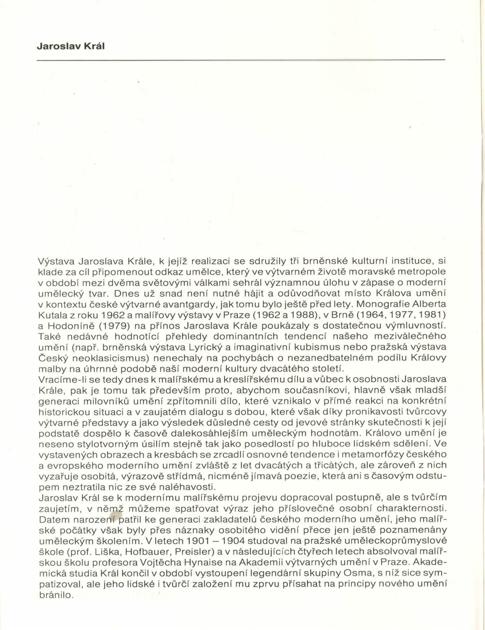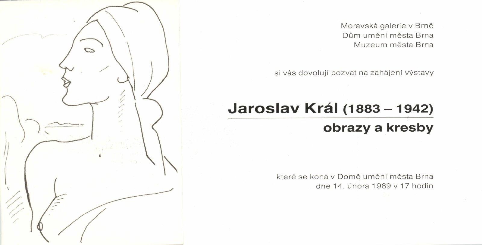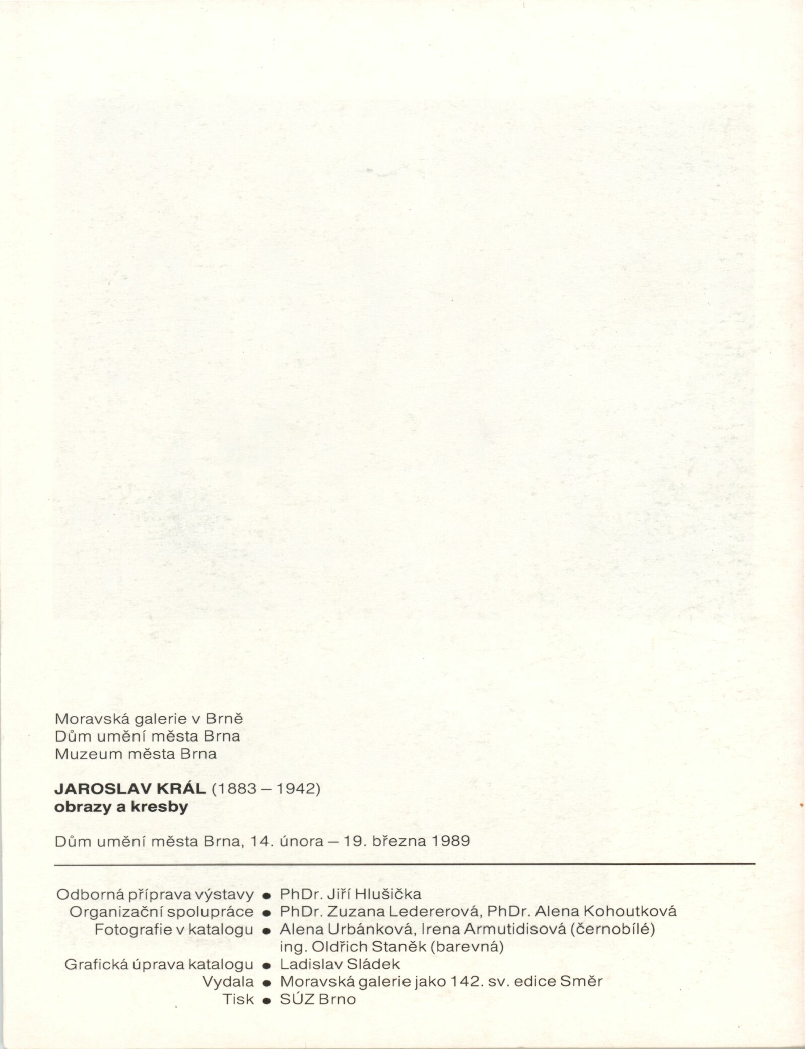 Jaroslav Král (1883–1942). Obrazy a kresby: Dům umění města Brna, 1. patro, 14. 2. – 19. 3. 1989 / Text: Jiří Hlušička. – Brno: Moravská galerie, 1989. – [38] s., obr., životní data, výstavy, bibliografie, DU 863. – MZK; MG; MMB