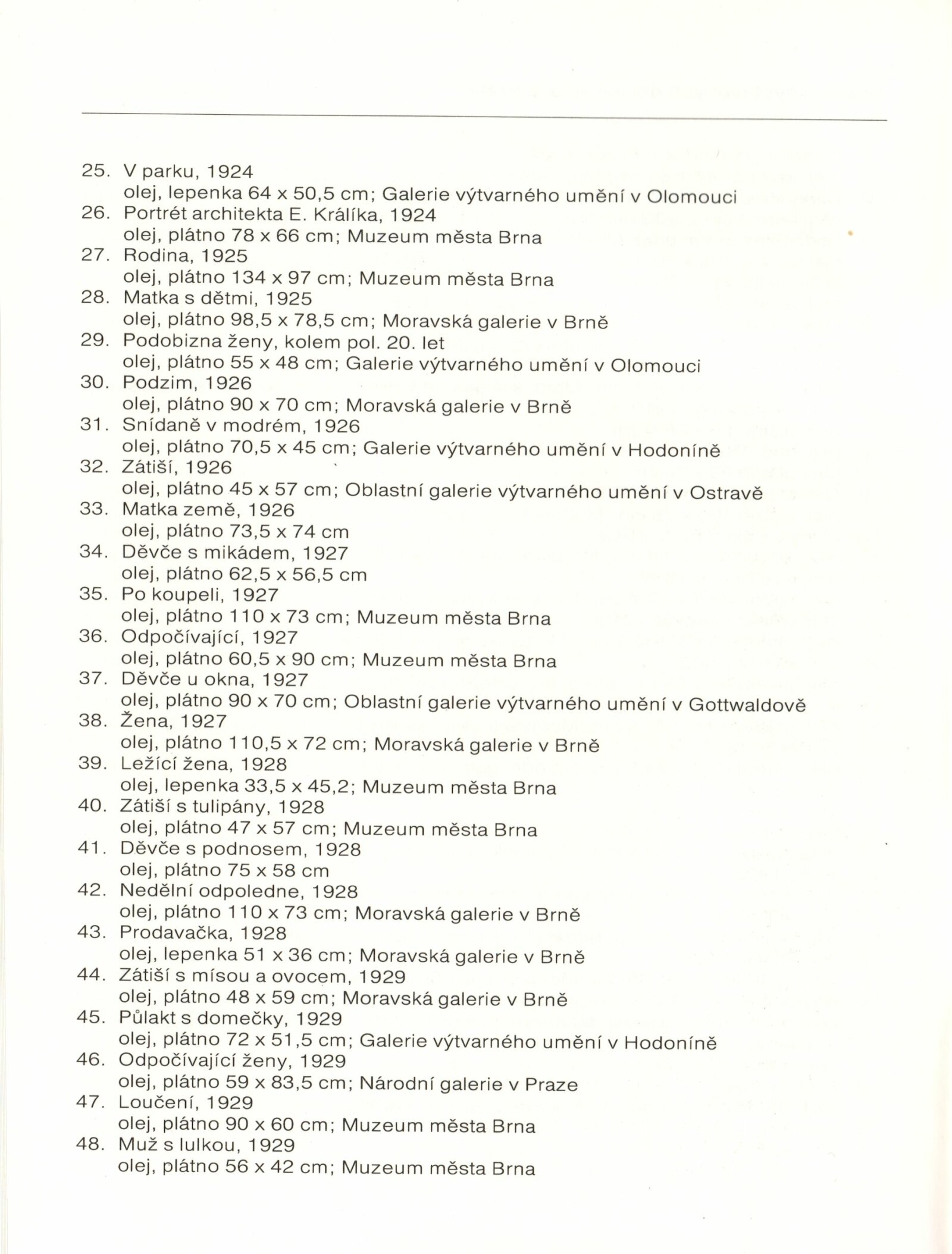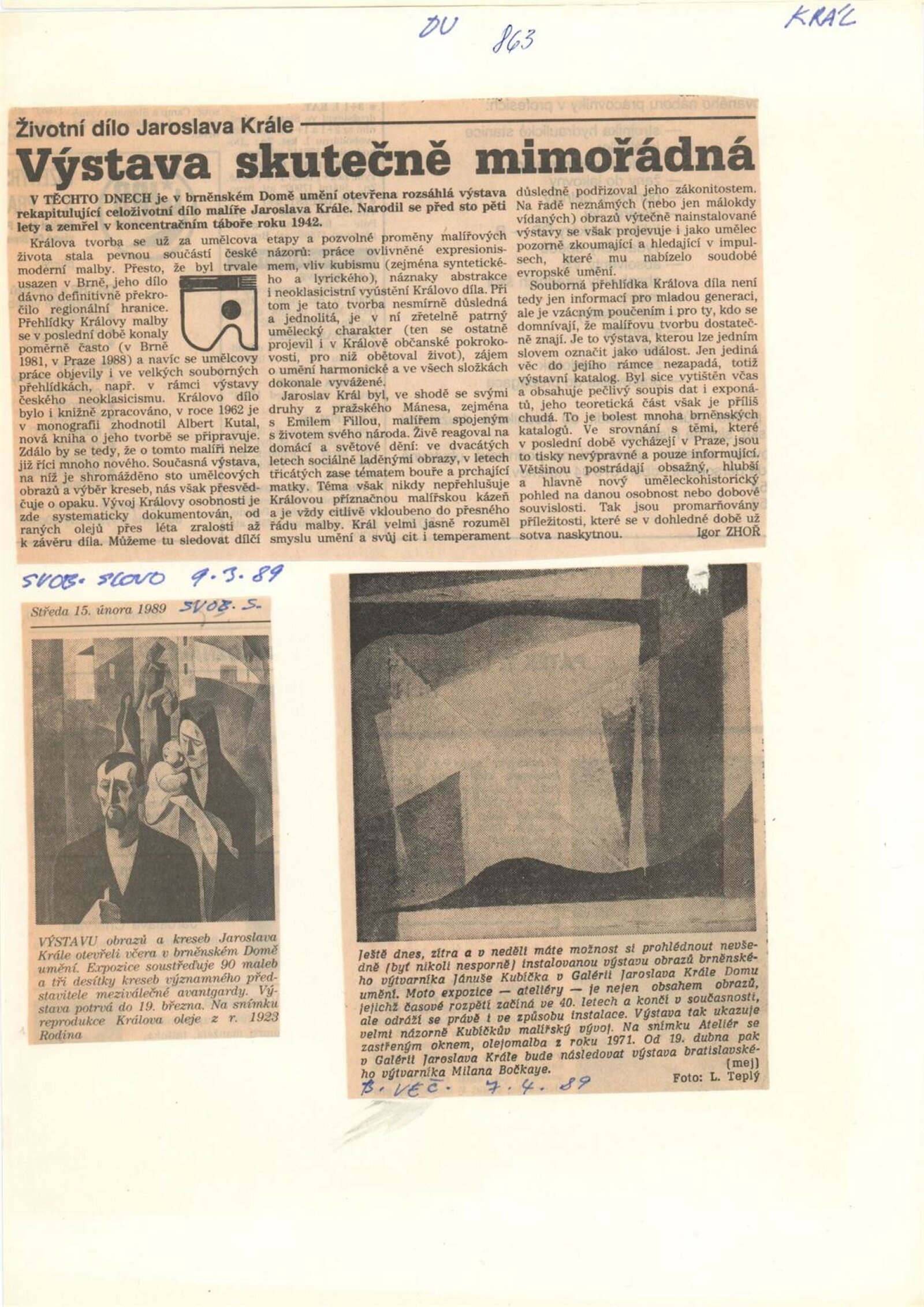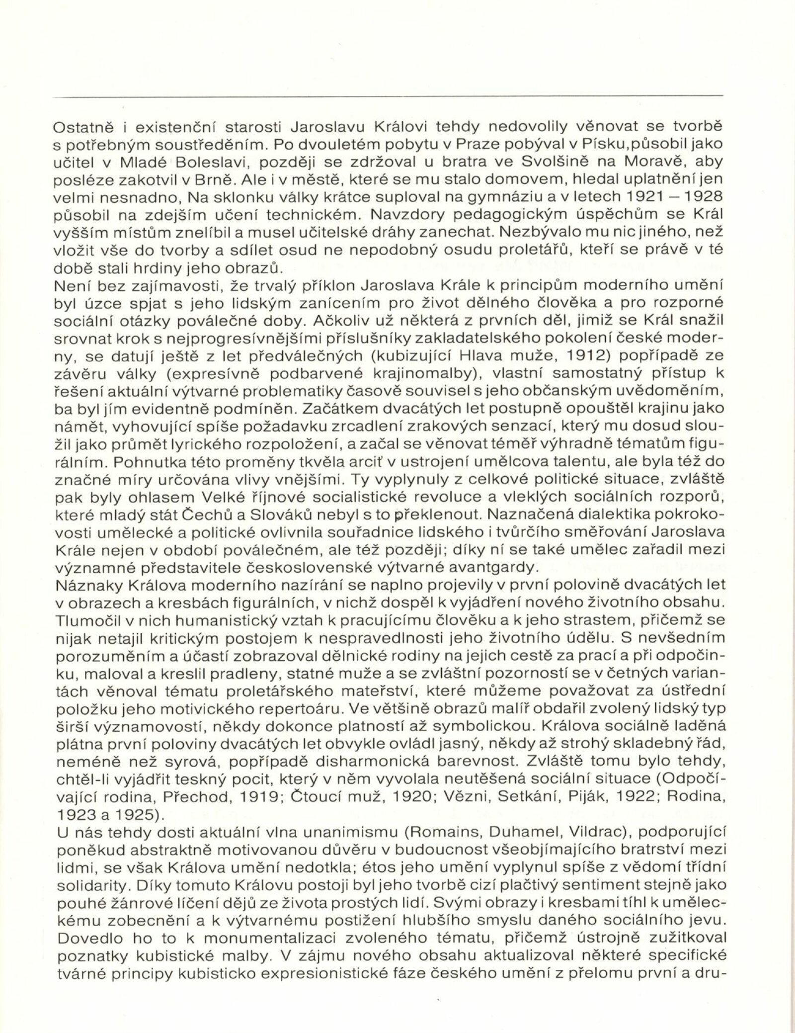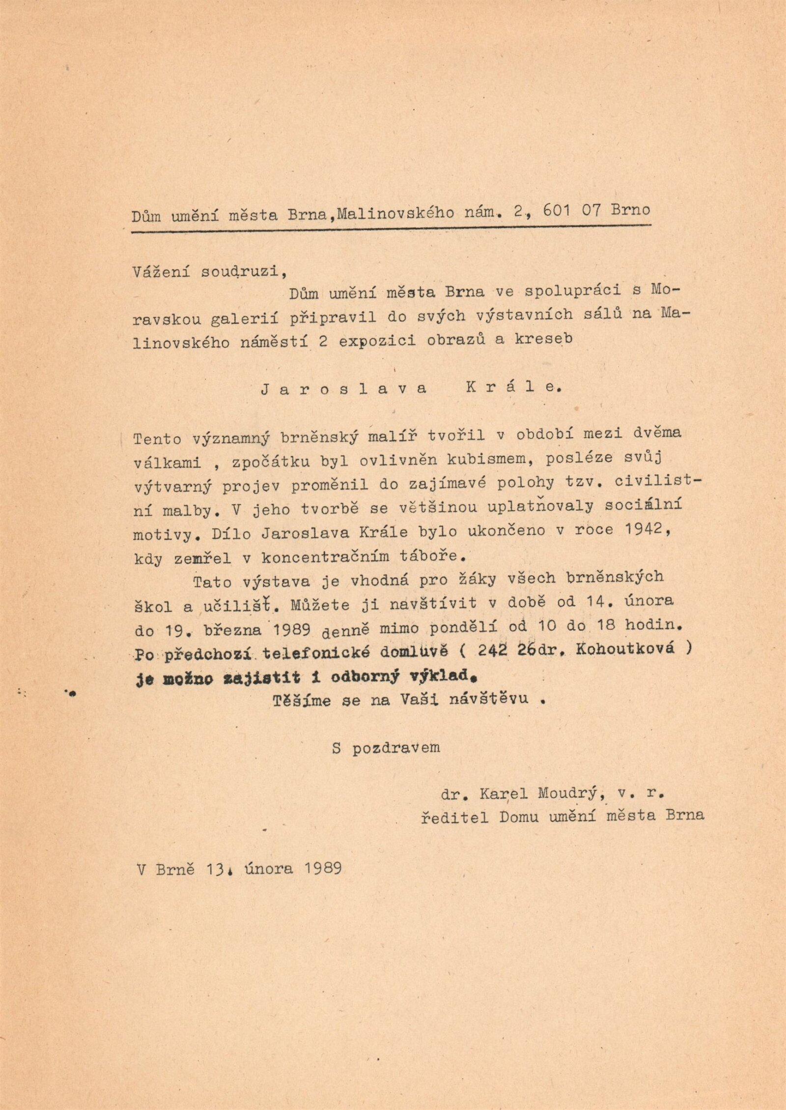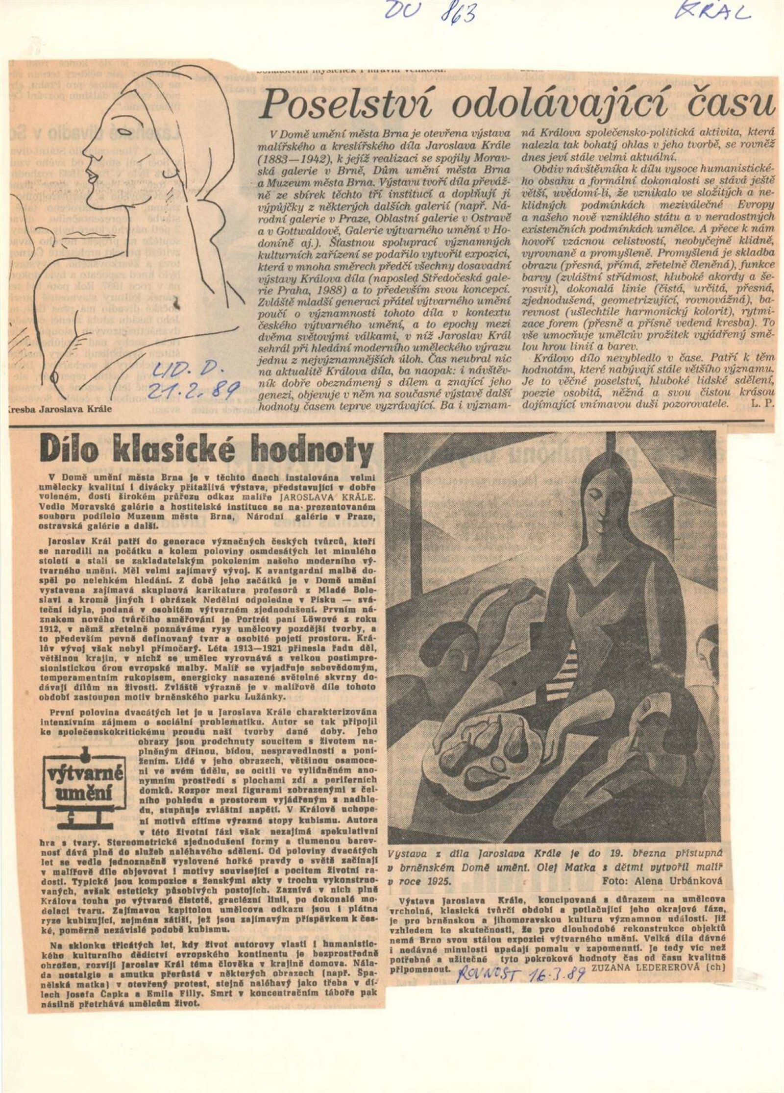 Jaroslav Král (1883–1942). Obrazy a kresby: Dům umění města Brna, 1. patro, 14. 2. – 19. 3. 1989 / Text: Jiří Hlušička. – Brno: Moravská galerie, 1989. – [38] s., obr., životní data, výstavy, bibliografie, DU 863. – MZK; MG; MMB