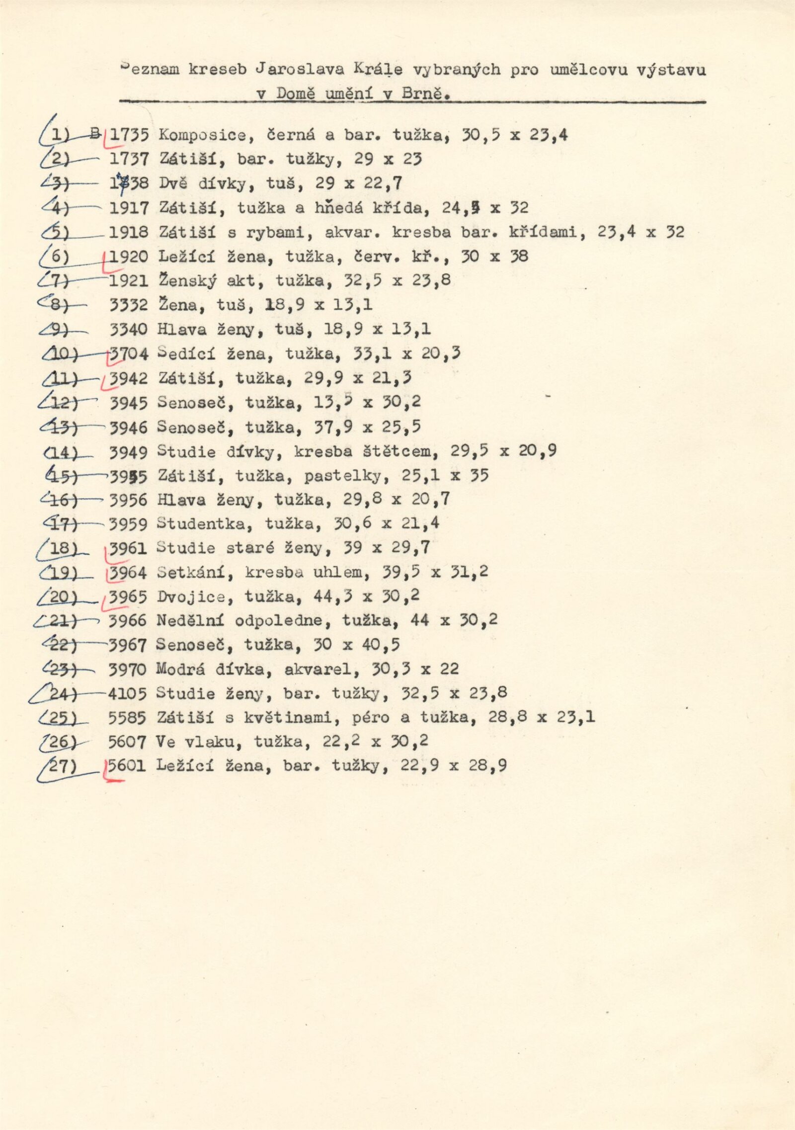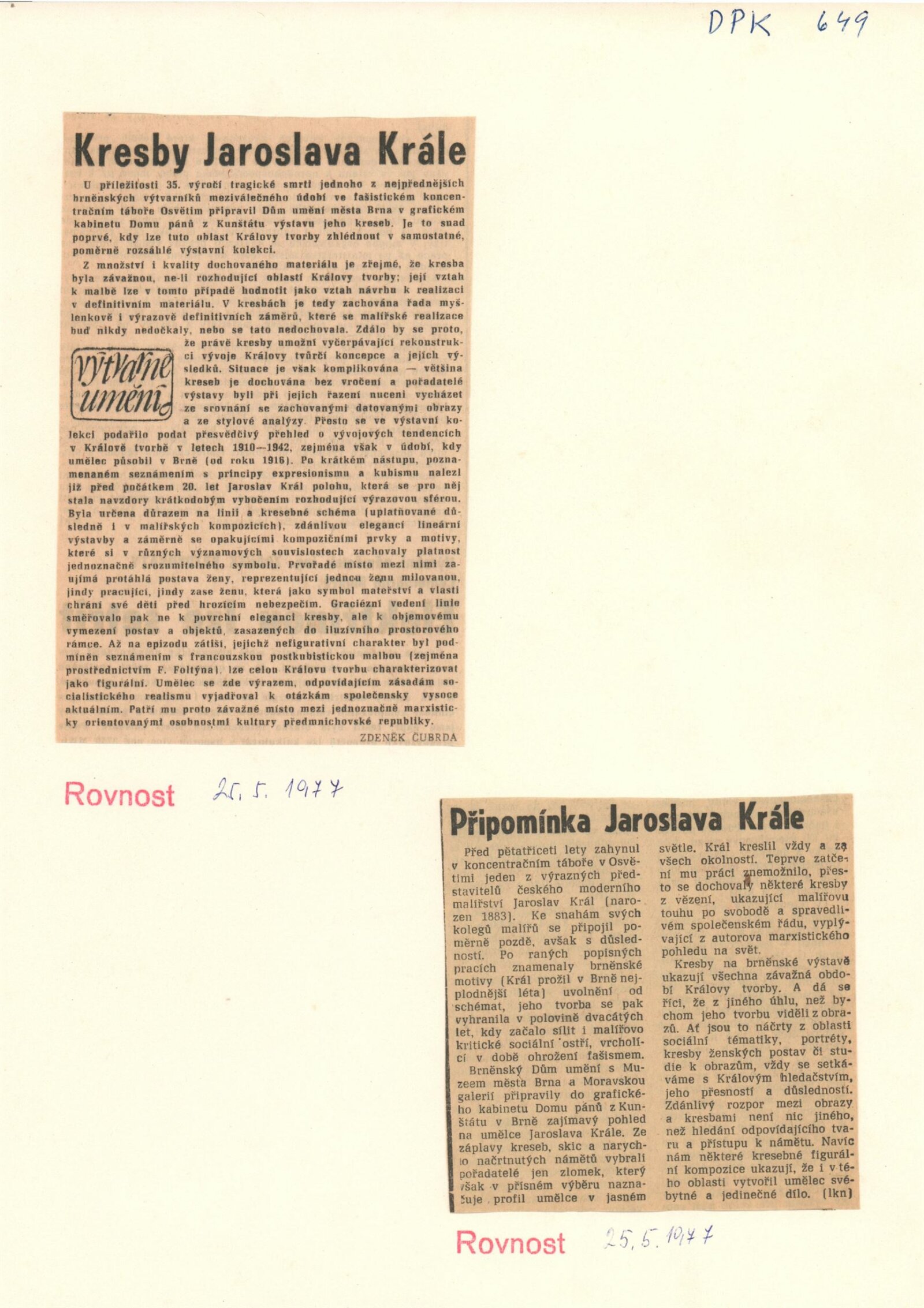 Jaroslav Král. Kresby. K 35. výročí umělcovy smrti v Osvětimi: Dům umění / Dům pánů z Kunštátu, Kabinet grafiky, 15. 4. – 22. 5. 1977 / Text: Jiří Valoch. – Brno: DUmB, 1977. – 24 s., obr., životní data, neobsahuje seznam vystavených prací, DPK 649. – MZK; MG; MMB