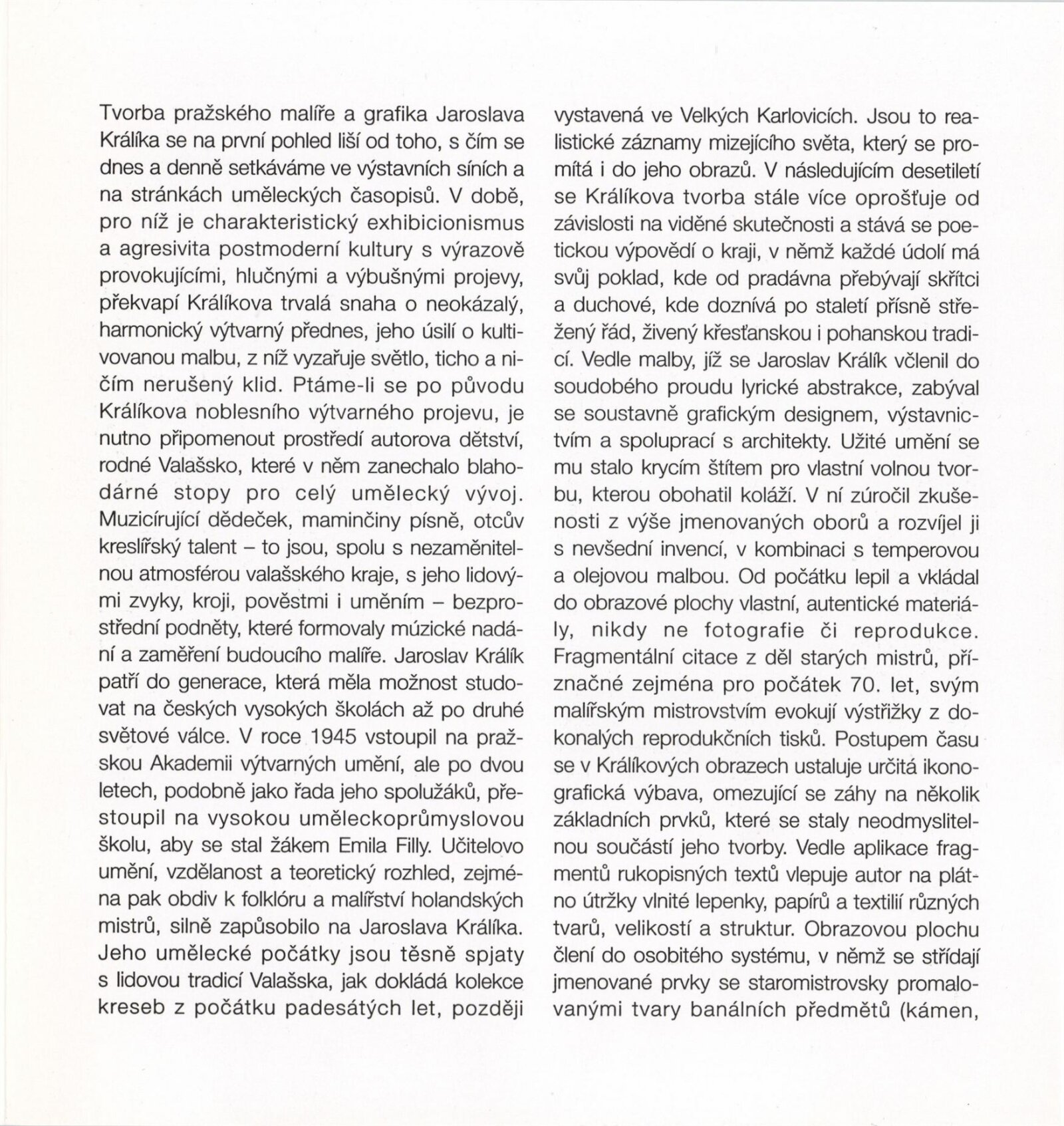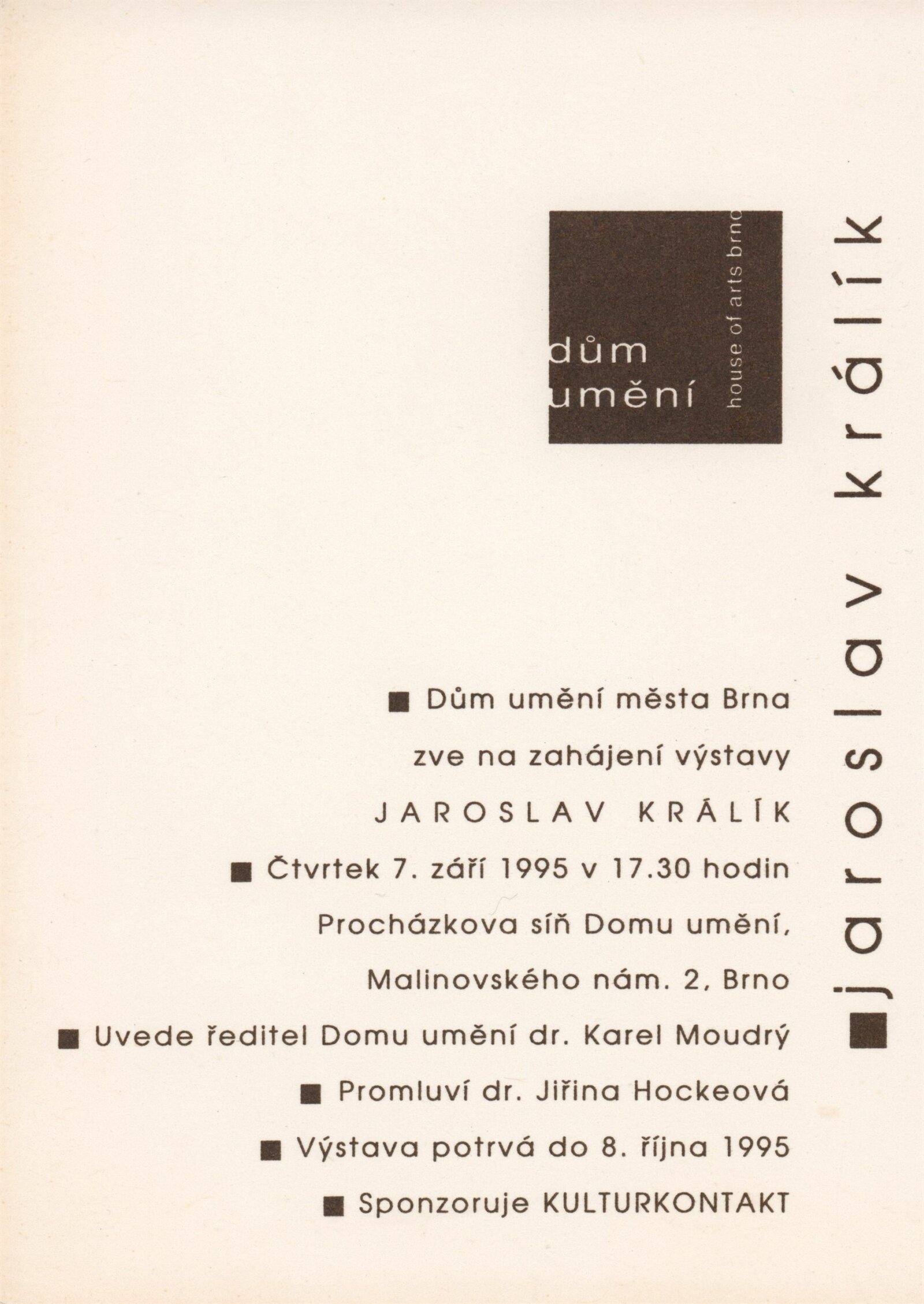 Jaroslav Králík: Procházkova síň Domu umění 7. 9. – 8. 10. 1995 / Text Jiřina Hockeová. - Brno: DUmB, - 1 skládačka (6 s., obr.) + Seznam vystavených prací [1] s. DU 1004