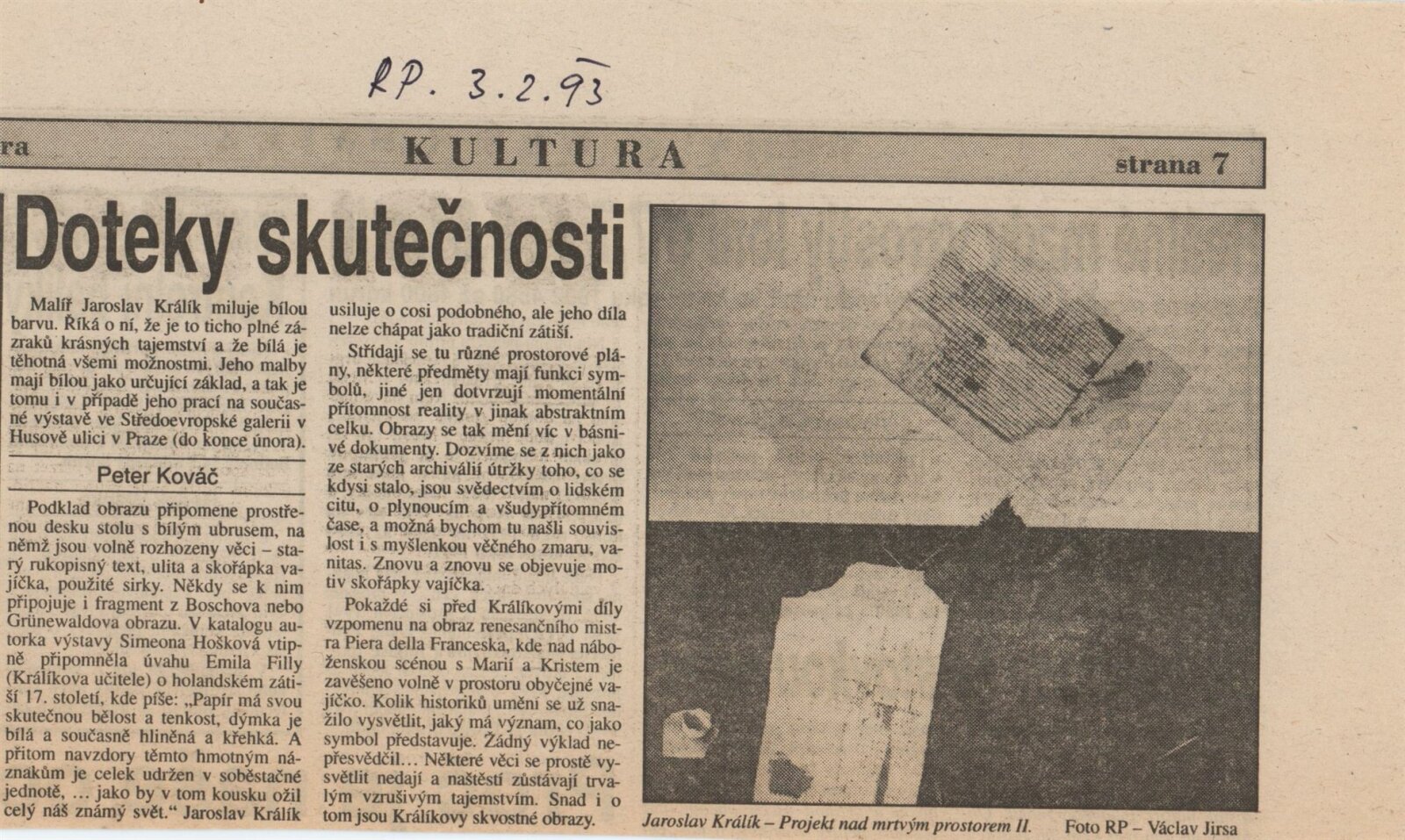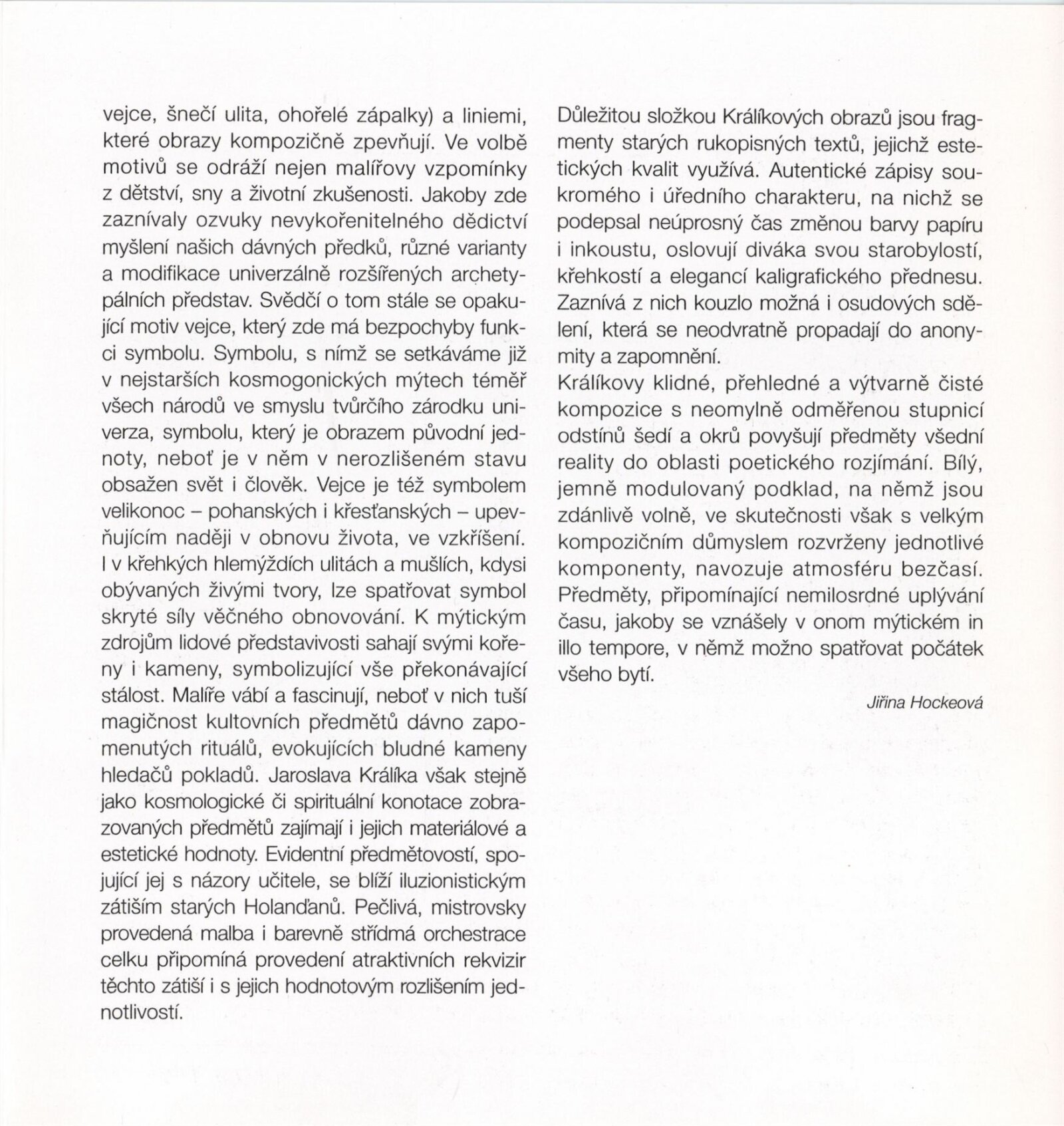 pozvánka, katalog, pozvánka strojopis, fotografie výstavy a díla, seznam vystavených děl, pojistný seznam, korespondence J. Králík + J. Hockeová, recenze v tisku, poznámky