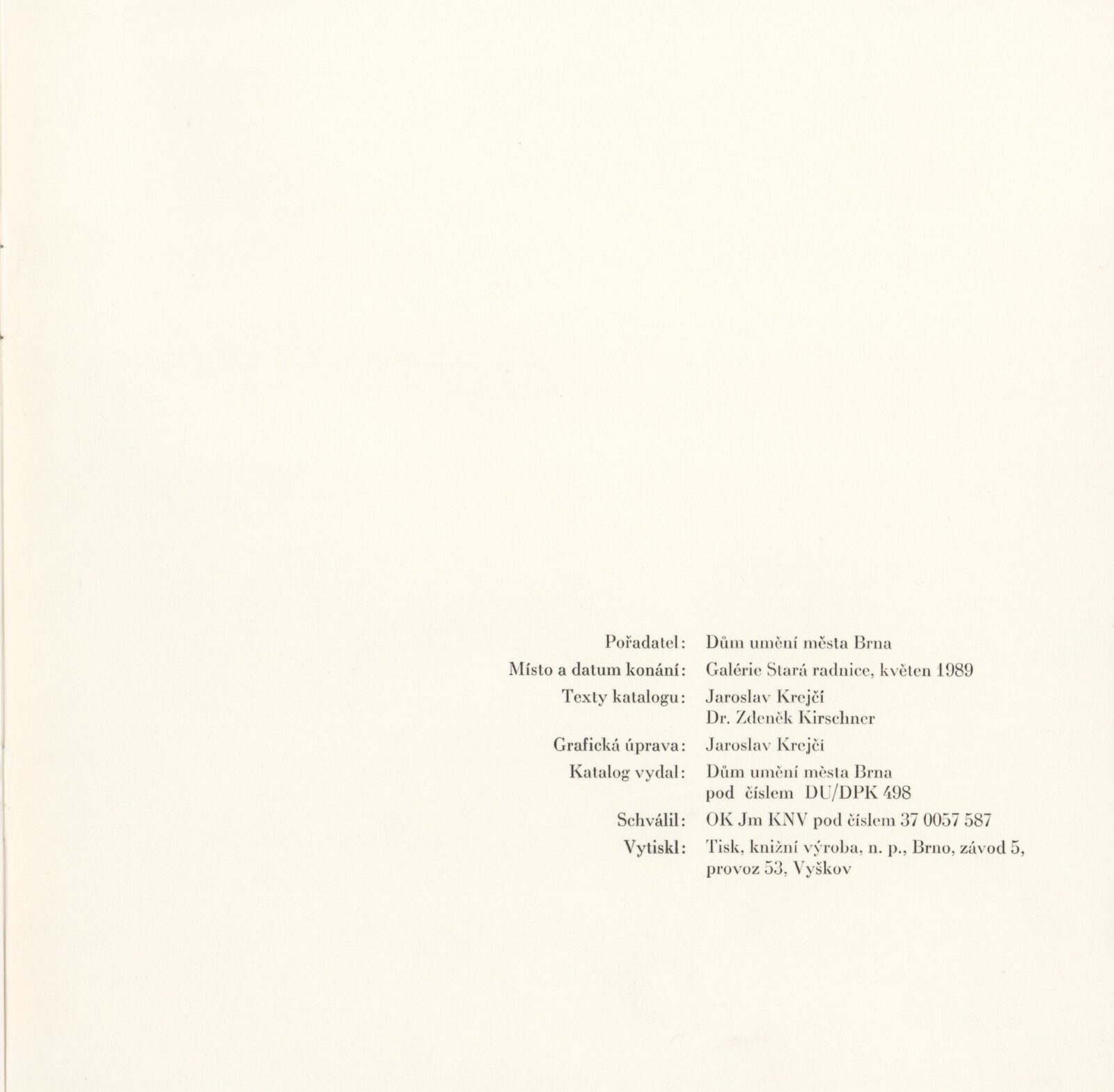 Setkání s Bedřichem Stefanem, Ladislavem Peškem, Danou Medřickou, Jaroslavem Seifertem, Bohuslavem Reynkem, Zdenkem Seydlem, Janem Sládkem a Janem Zrzavým. Fotografie Jaroslava Krejčího: Galerie Stará radnice, 2. patro, [25. 4.] 5. – 4. 6. 1989 / Texty: autor, Zdeněk Kirschner. – Brno: DUmB, 1989. – [12] s., obr., životopis, výstavy, GSR 46. – MZK; MG