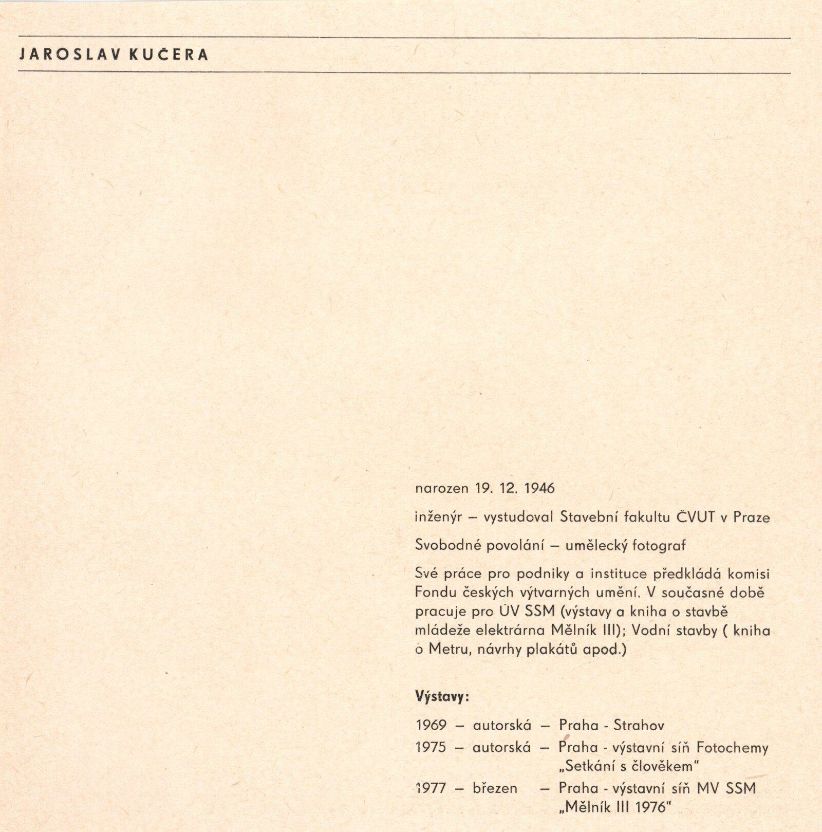 pozvánka, katalogy, katalog výstavy Setkání s člověkem (12. 3. – 29. 3. 1975, Praha, Výstavní síň N. P. Fotochema), seznam vystavených děl, negativy děl, úvodní slovo, korespondence, žádost o výstavu a povolení tisku katalogu, doporučení, žádost o povolení výstavy, recenze v tisku