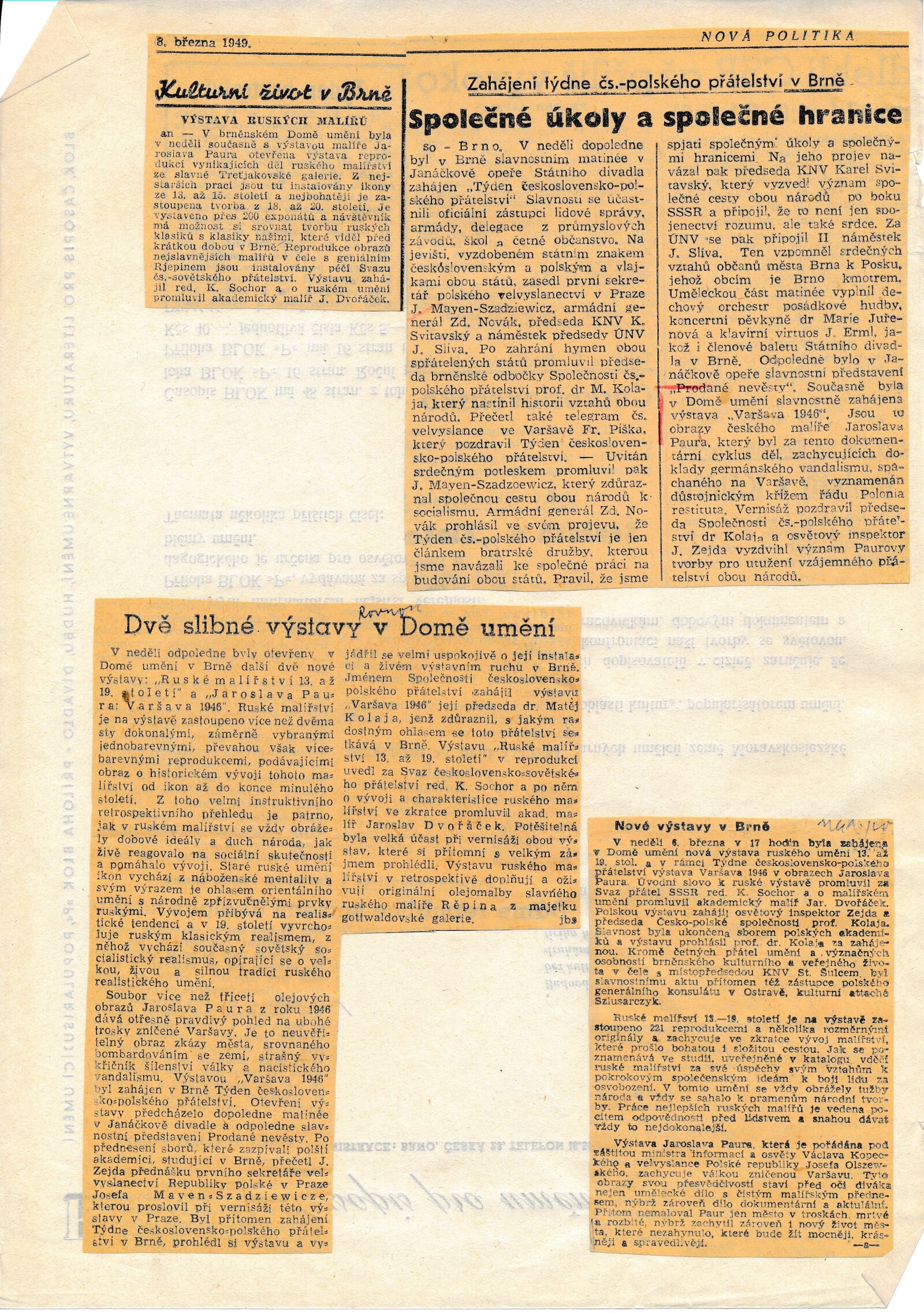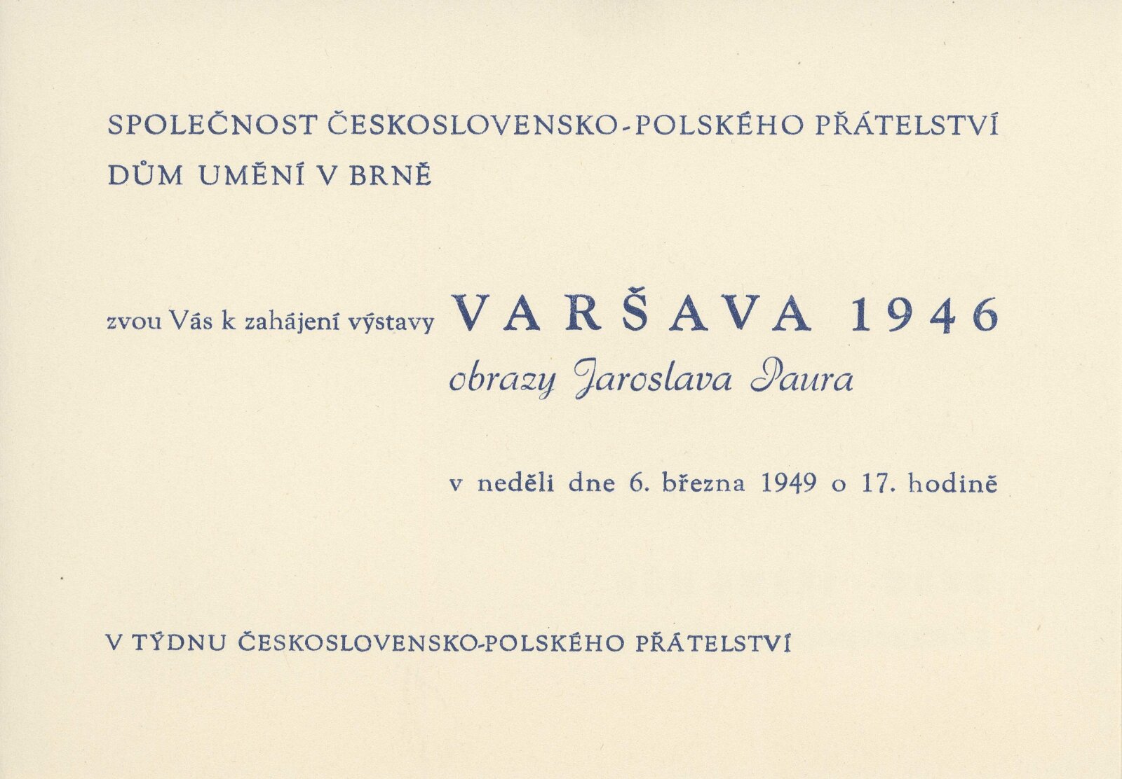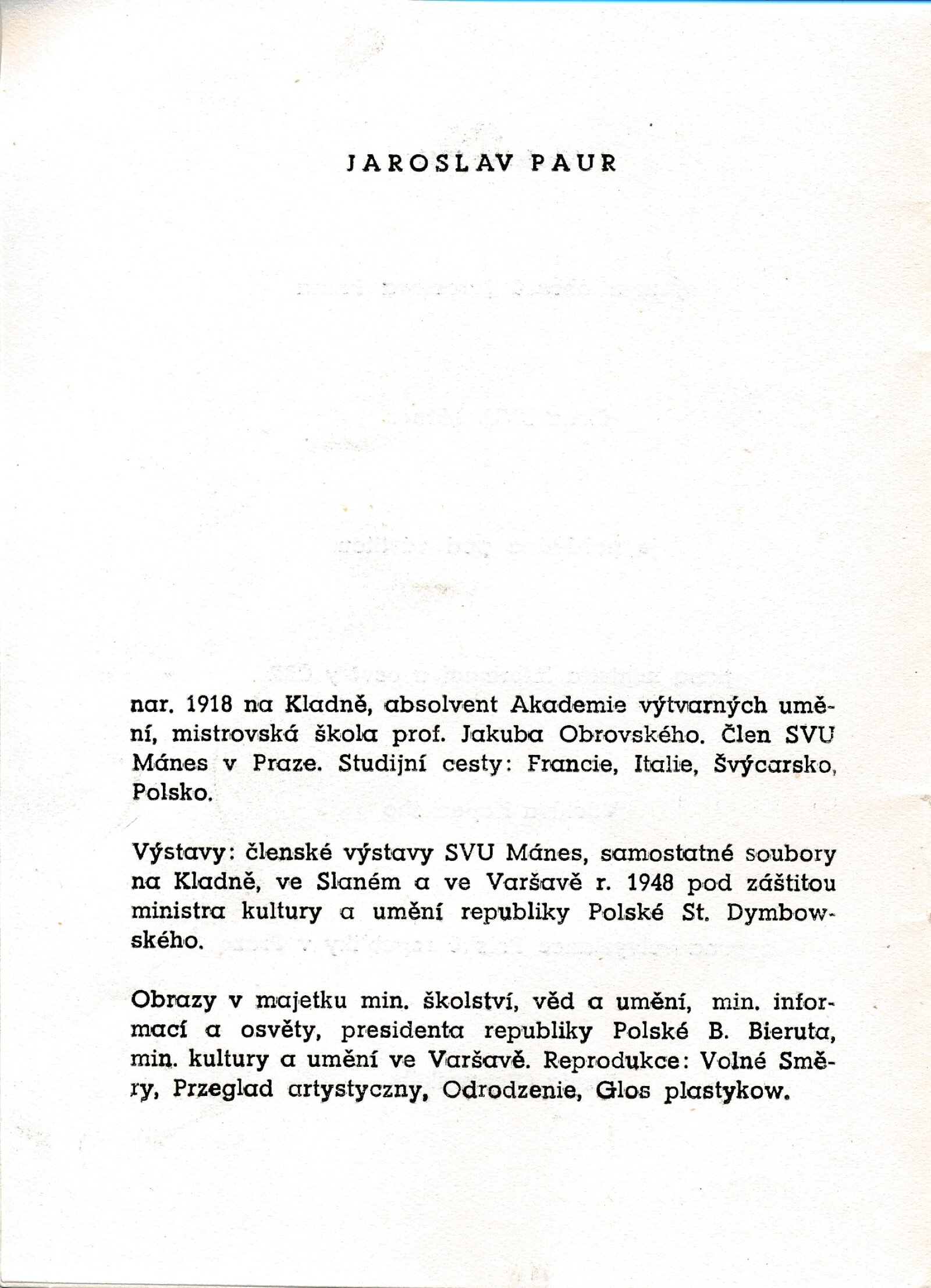 Katalog výstav Domu umění, pořádaných 3. 3. – 27. 3. 1949 / Obsahuje výstavy: Reprodukce ruského malířství 13.–19. století. 96. výstava, Jaroslav Paur: Varšava 1946. 97. výstava, Současné rakouské umění. 98. výstava, Švýcarský plakát. 99. výstava / Brno: Dům umění, 1948. – 11 s., DU 96–99. – Kubíček 7638; MZK; MG Jaroslav Paur. Varšava 1946: Dům umění v Brně 3. 3. – 27. 3. 1949 / Převzatý katalog. Varšava 1946: Výstava obrazů Jaroslava Paura. 421. výstava Topičova salonu, 14. 1. – 6. 2. 1949 / Text: František Rachlík. – Praha: Topičův salon, 1949. – 16 s., seznam vystavených obrazů, báseň Jerzy Lan, DU 97. – MG