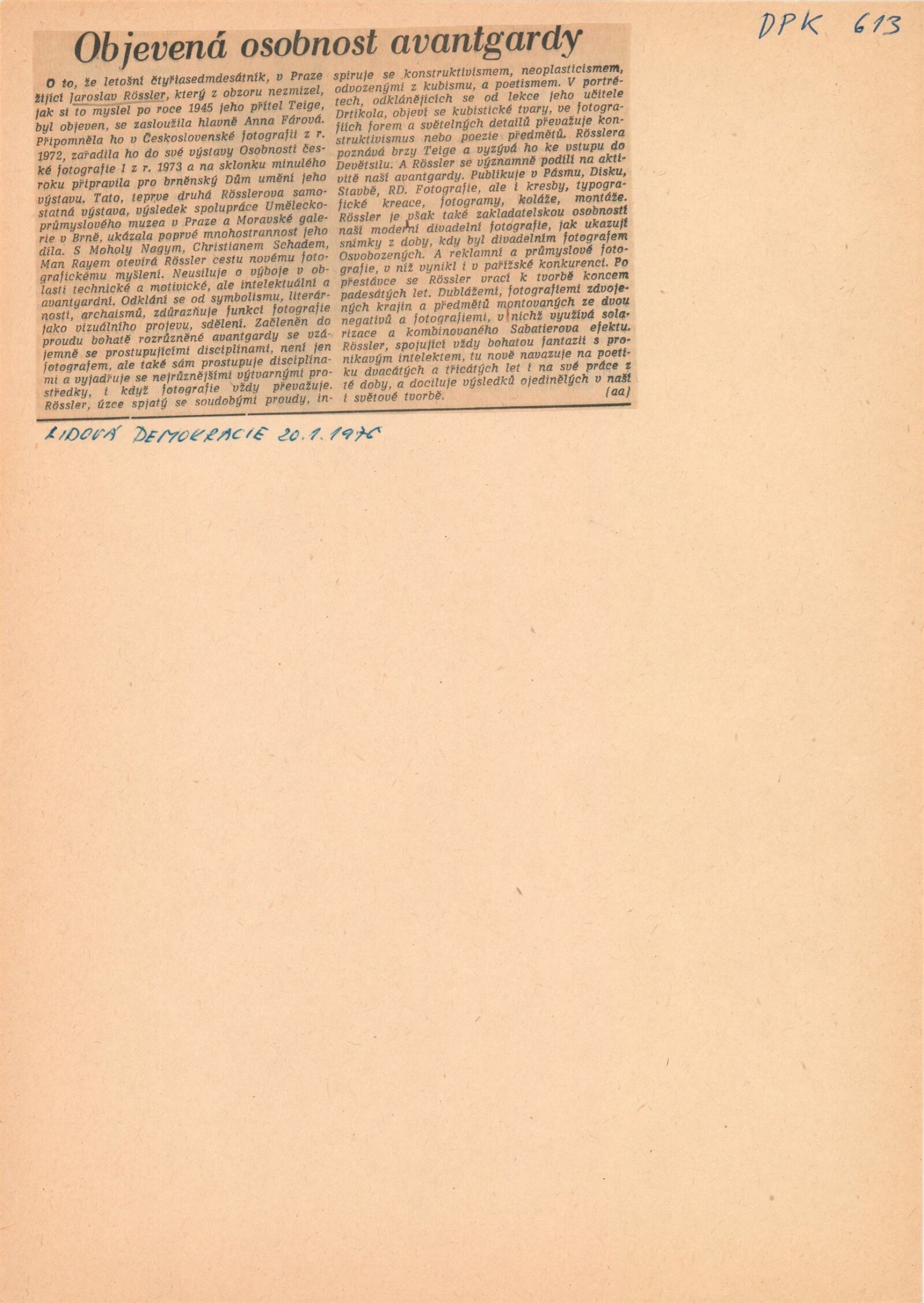 společná pozvánka pro DPK 613 a 614, katalog, strojopis, fotografie instalace, seznam prací v majetku UMPRUM v Praze, hospodářská smlouva (DU a UMPRUM v Praze), korespondence (Jaroslav Rössler, Anna Fárová, UMPRUM v Praze), recenze v tisku