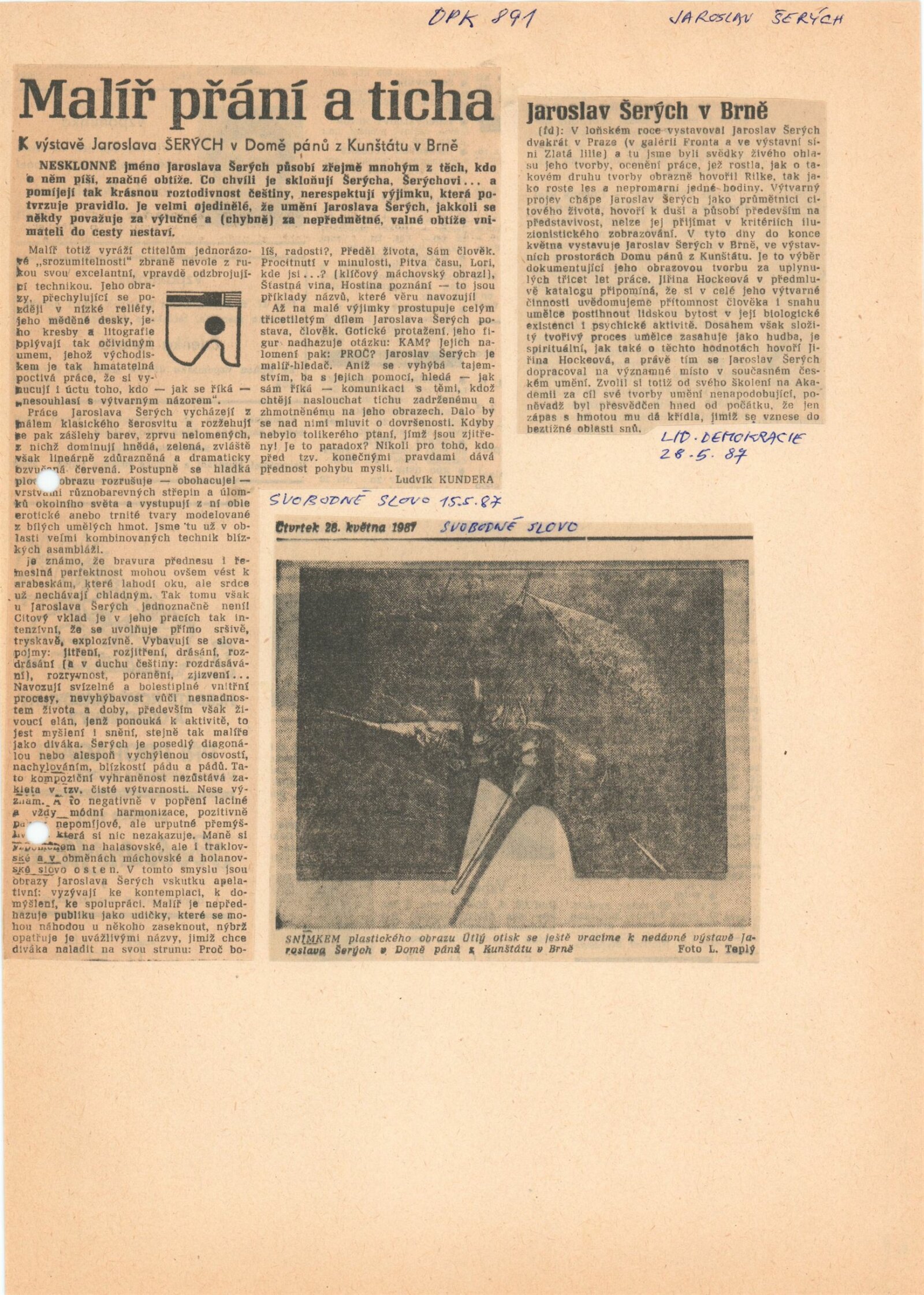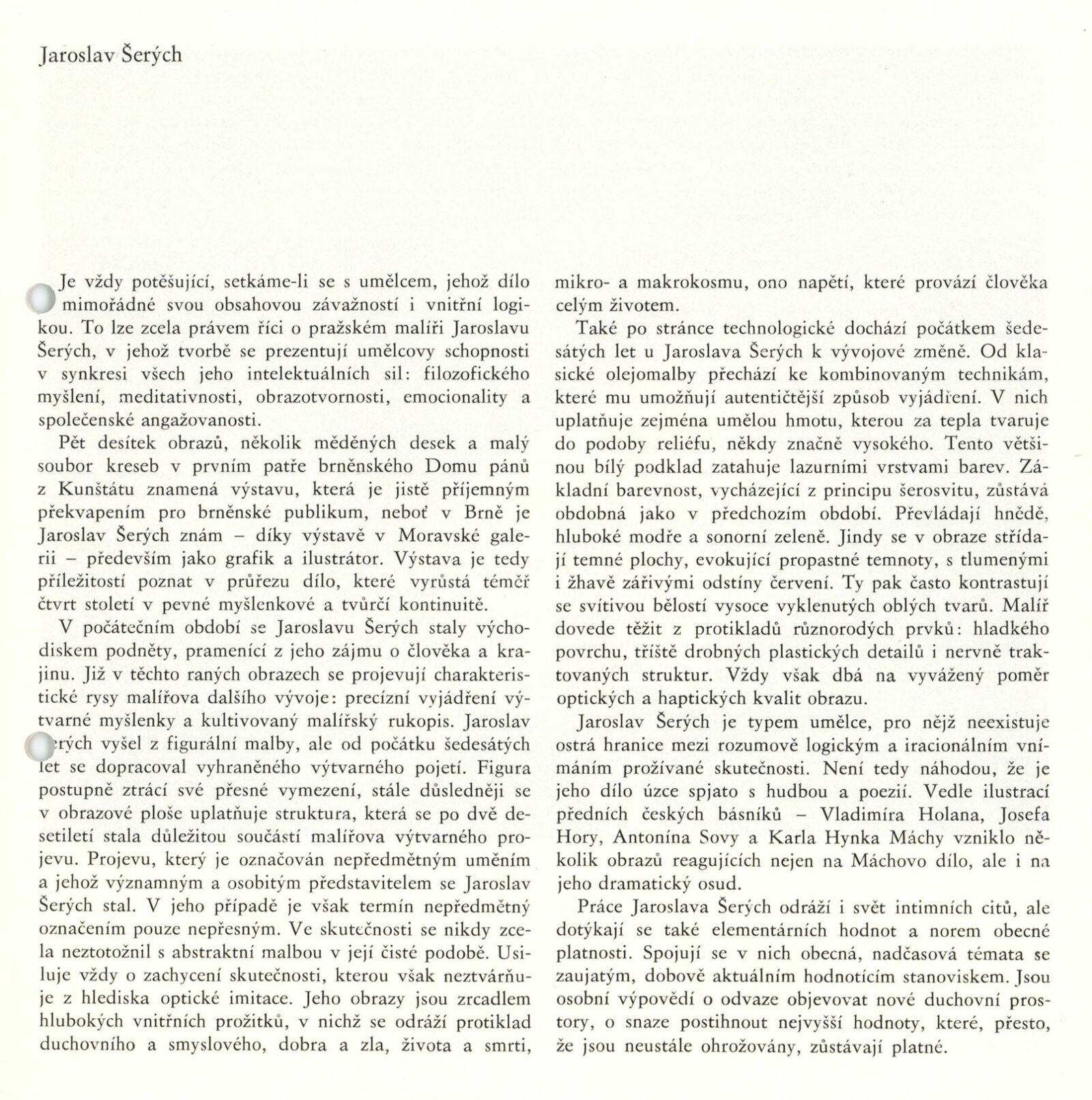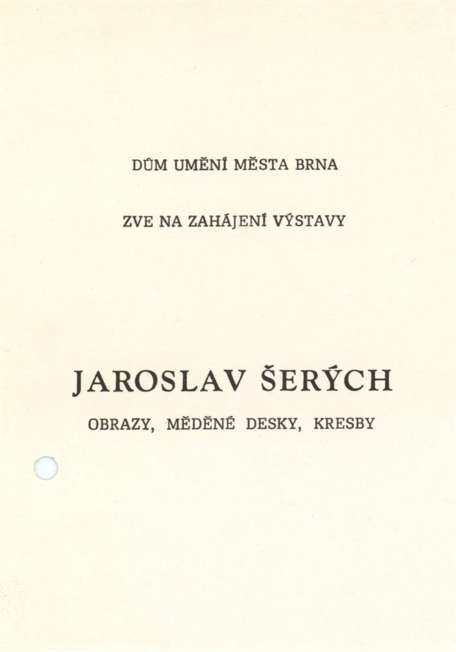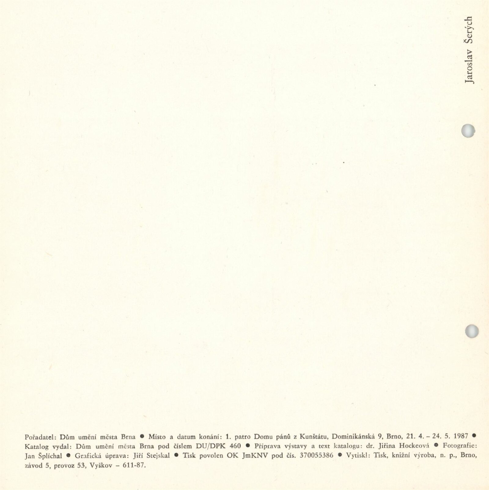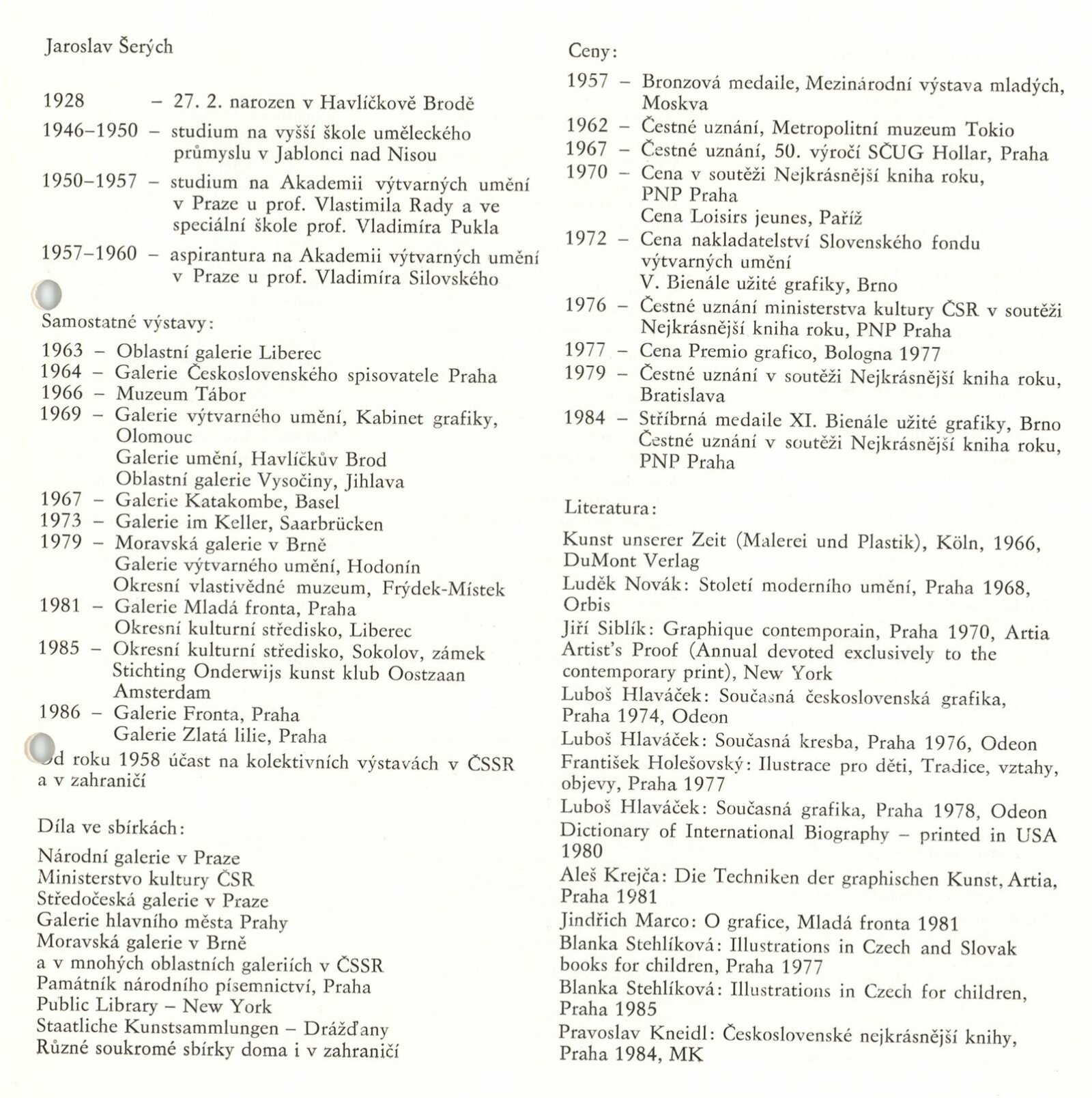 Jaroslav Šerých: Dům umění / Dům pánů z Kunštátu, 21. 4. – 24. 5. 1987 / Text: Jiřina Hockeová. – Brno: DUmB, 1987. – [17 ] s., obr., životní data, výstavy, díla ve sbírkách, ceny, bibliografie, DPK 891. – MZK; MG; MMB