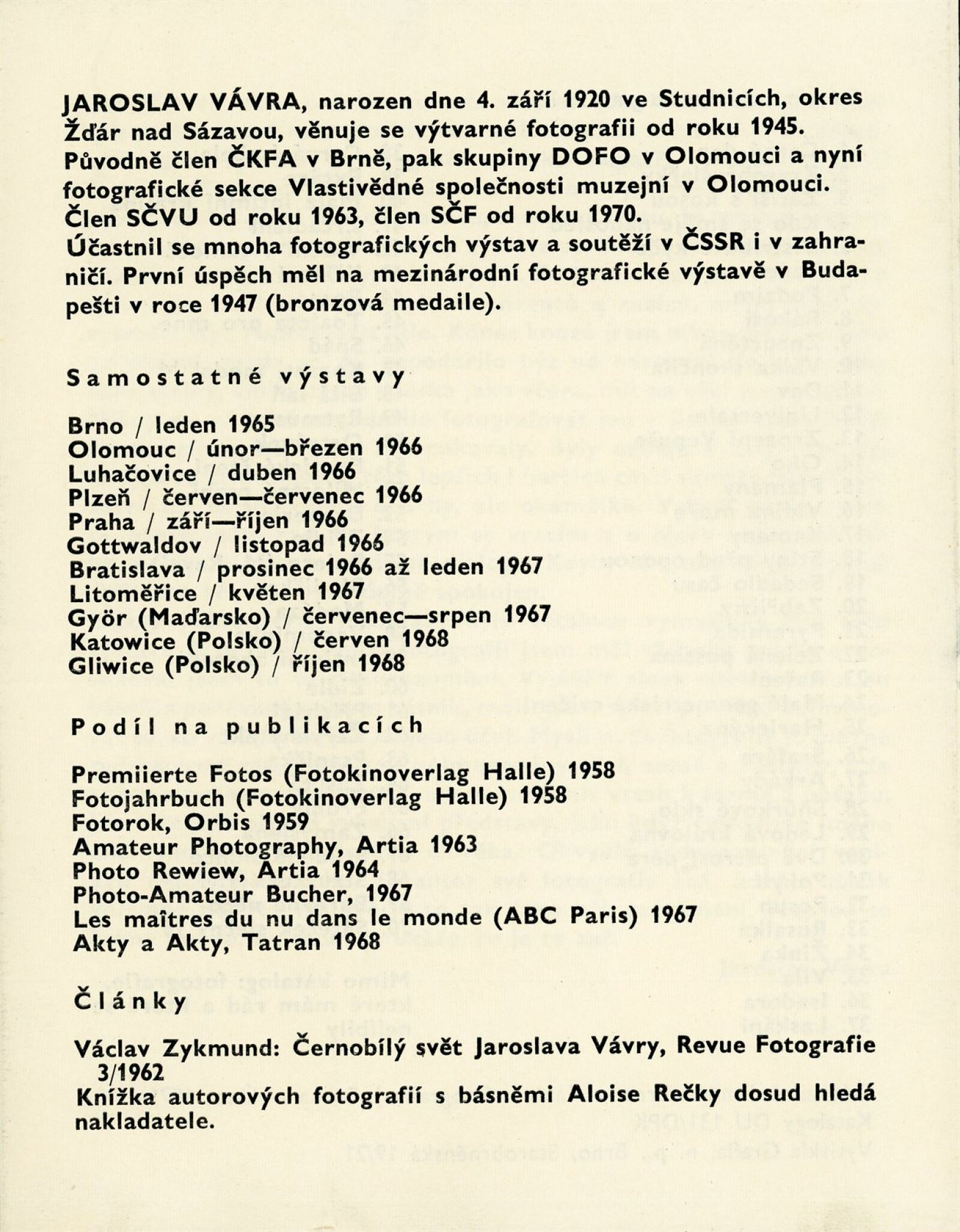 Jaroslav Vávra. 1920. – fotografie: Dům umění města Brna / Dům pánů z Kunštátu, 110. výstava Kabinetu fotografie Jaromíra Funka, 5. 2. – 28. 2. 1971 / Text: autor. – Brno: DUmB, 1971. – 4 s., 8 s., obr., životní data, výstavy, podíl na publikacích, DPK 459. – MZK; MG; MMB