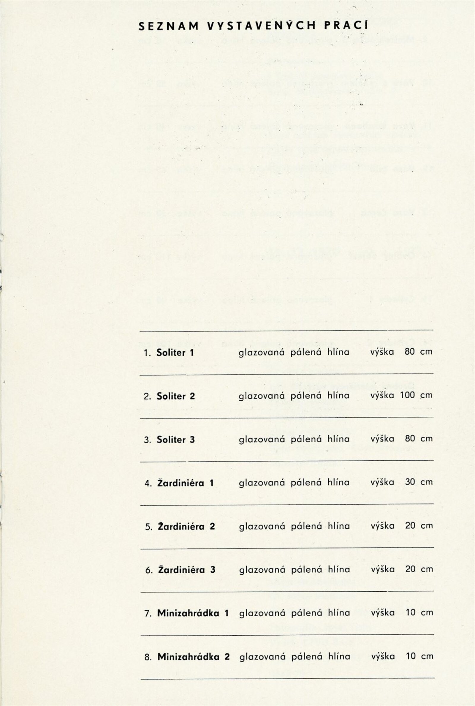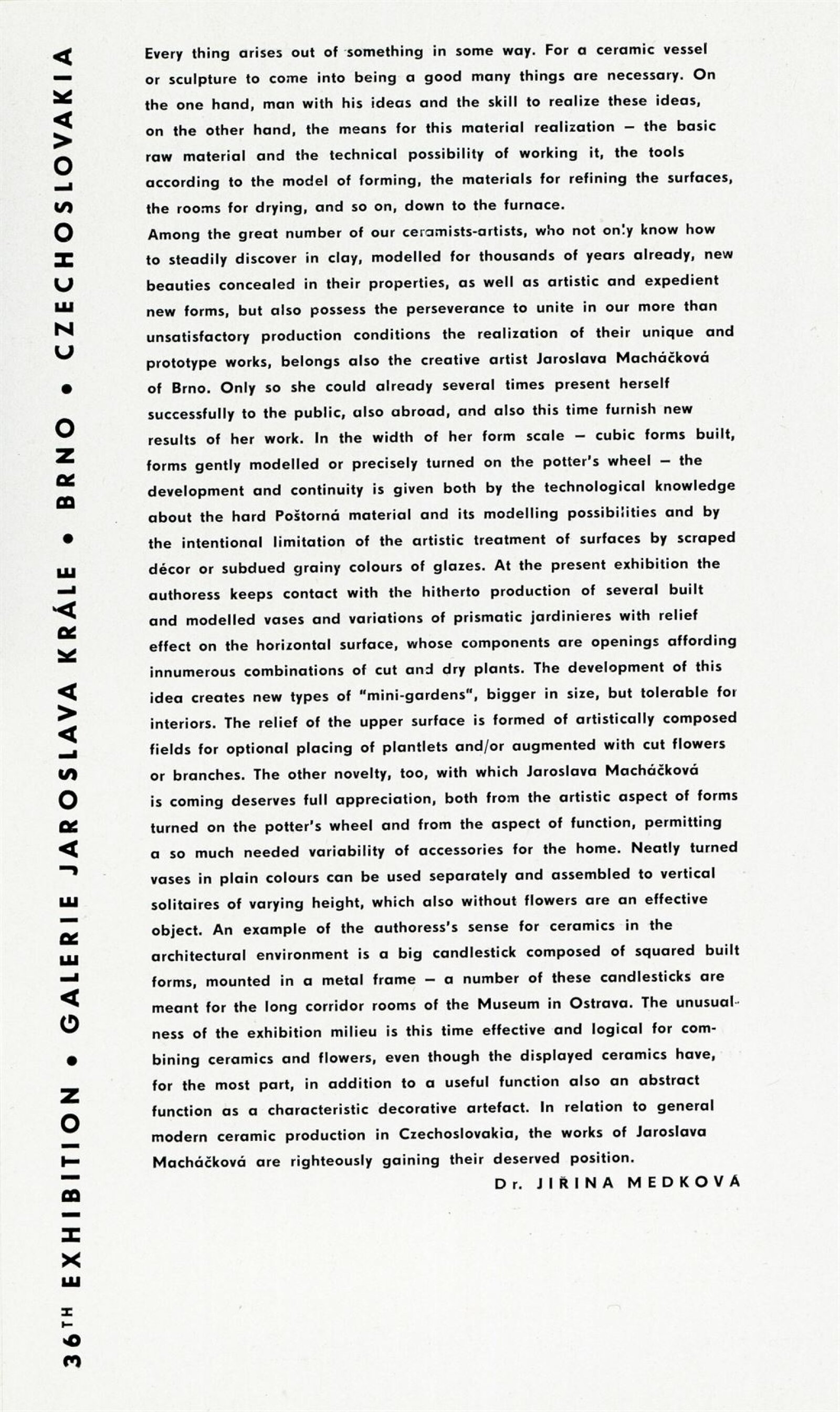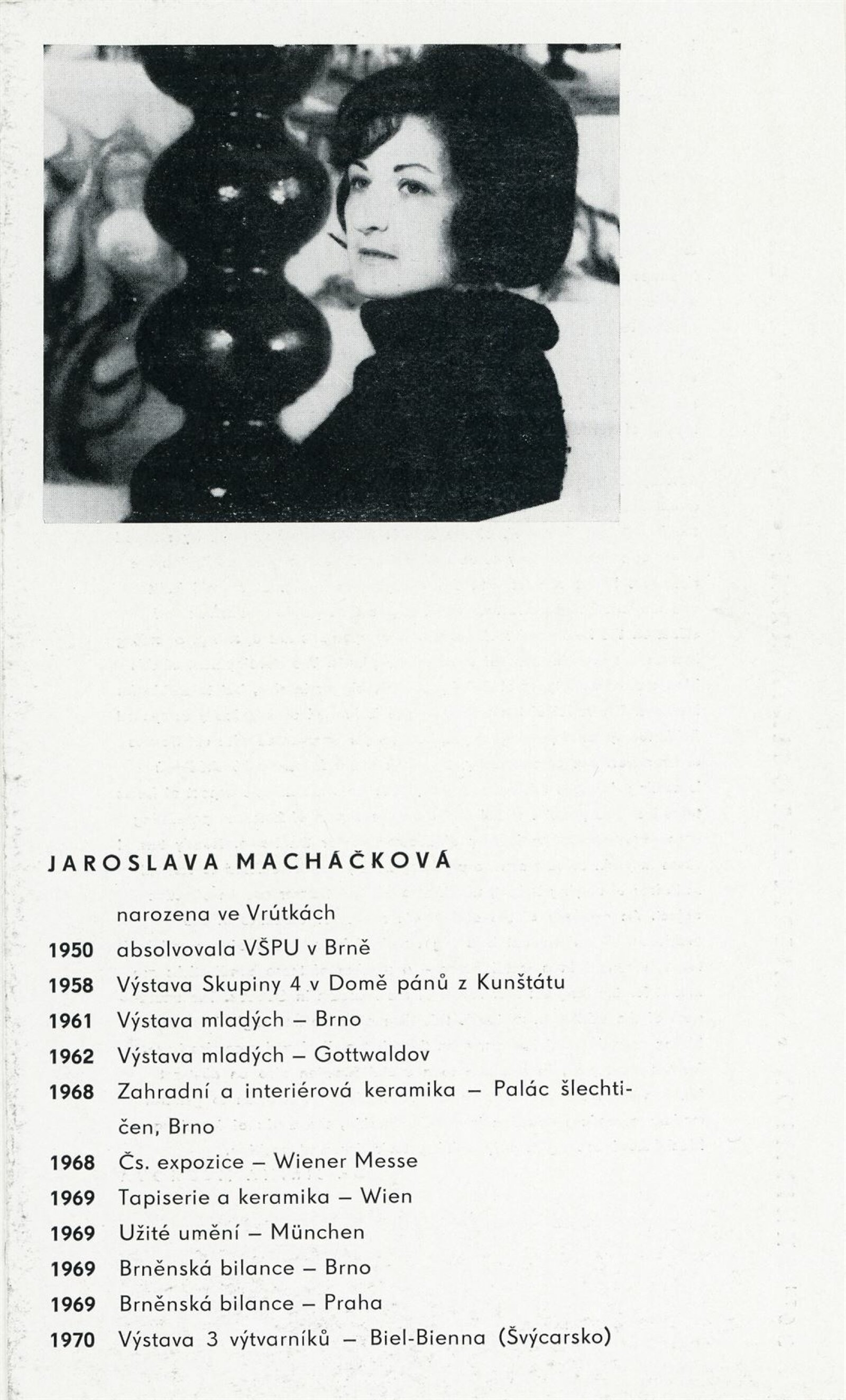 Jaroslava Macháčková. Keramika: Dům umění, 36. výstava v Galerii Jaroslava Krále, 11. 12. 1970 – 10. 1. 1971 / Výstava byla umístěna v Galerii pod Krokodýlem. Text: Jiřina Medková. – Brno: ČFVU, 1970. – 10 s., obr., portrét, životní data, DU 557. – MG