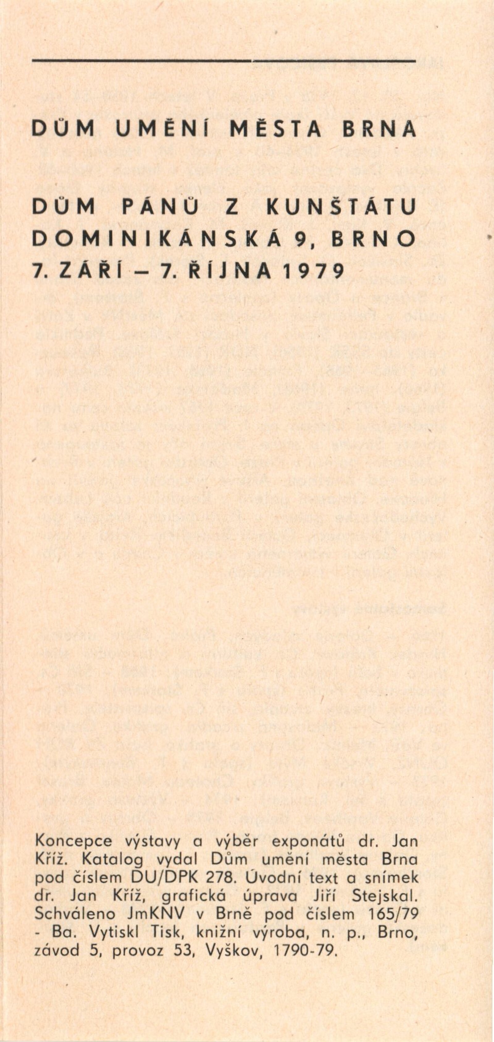 Jaroslava Pešicová. Obrazy, grafika: Dům pánů z Kunštátu 7. 9. – 7. 10. 1979. / Text Jan Kříž. - Brno: DUmB, - 1 skládačka 10 s., obr. + Seznam vystavených prací 2 s. DPK 712; MG; MMB