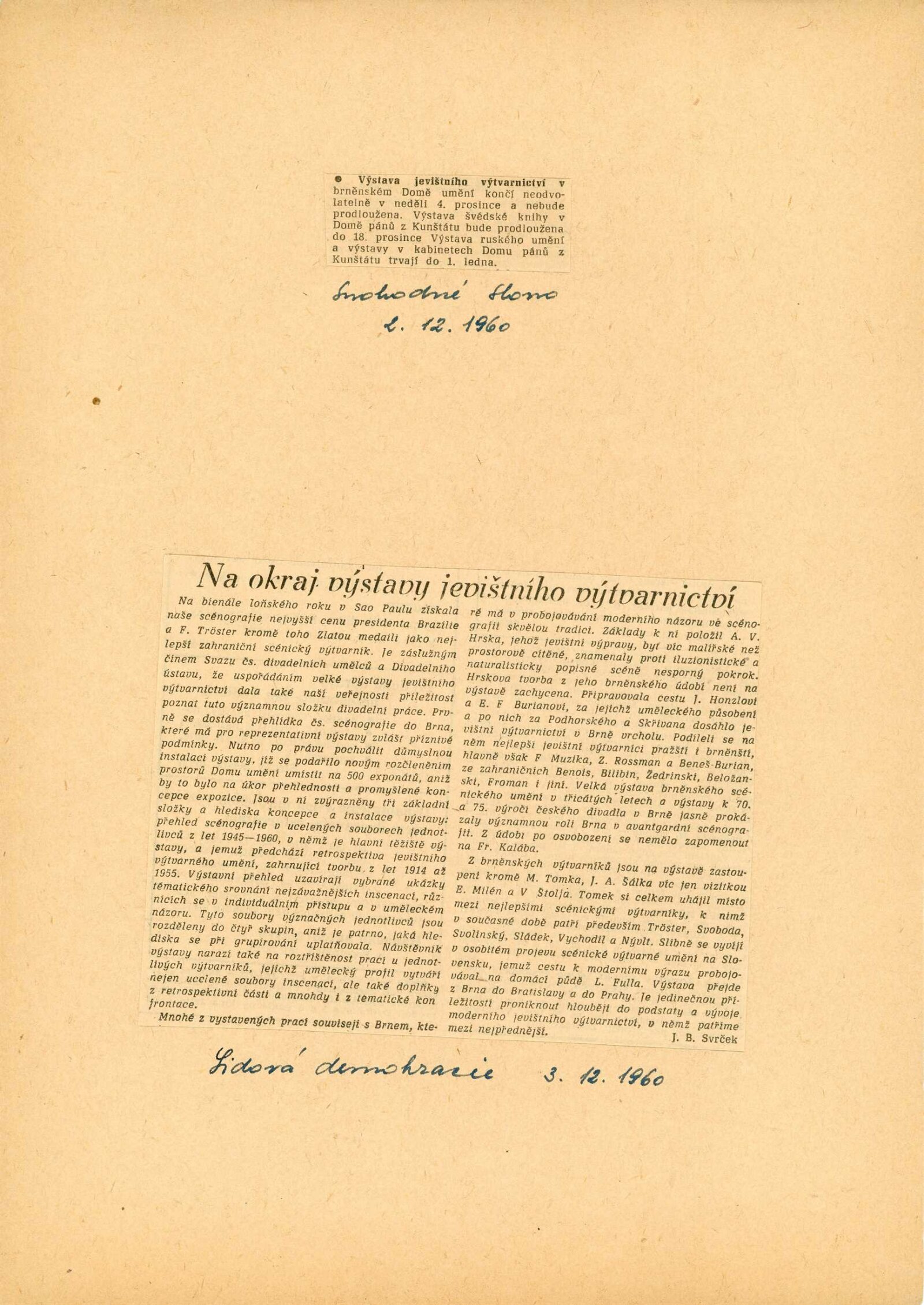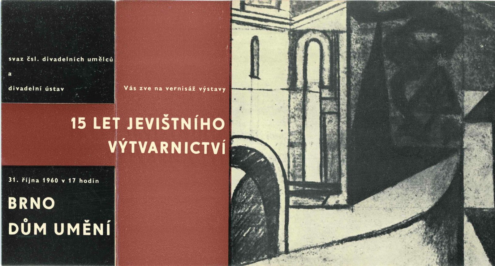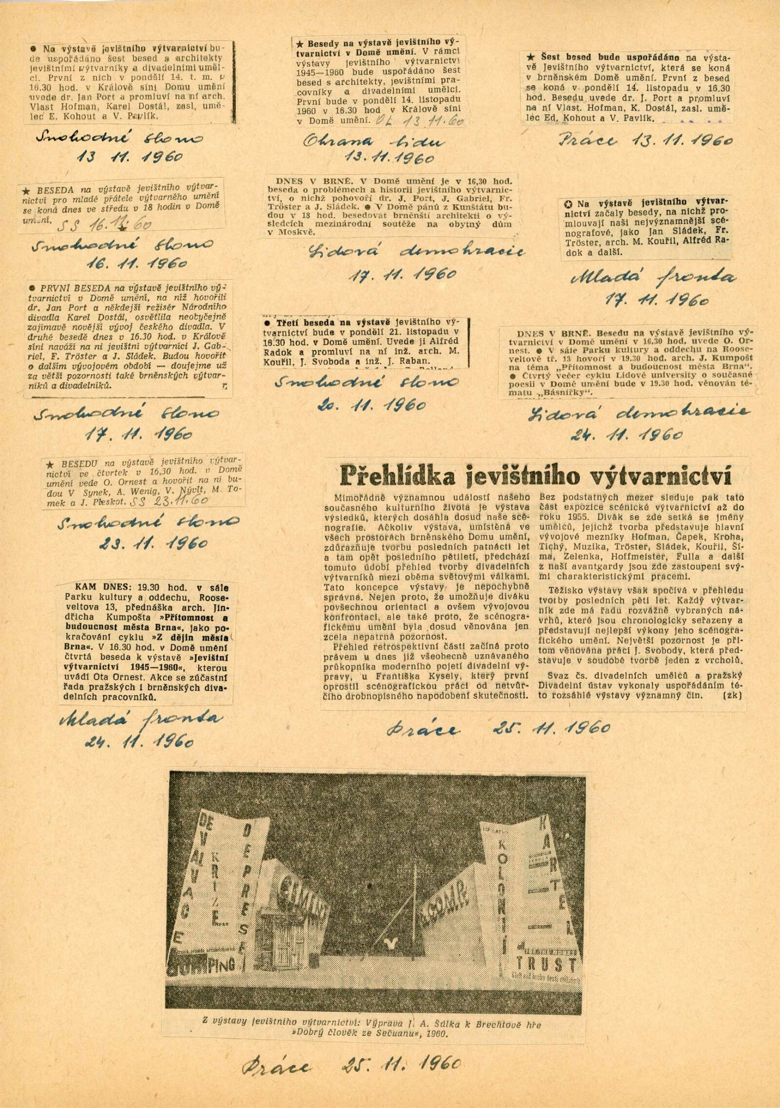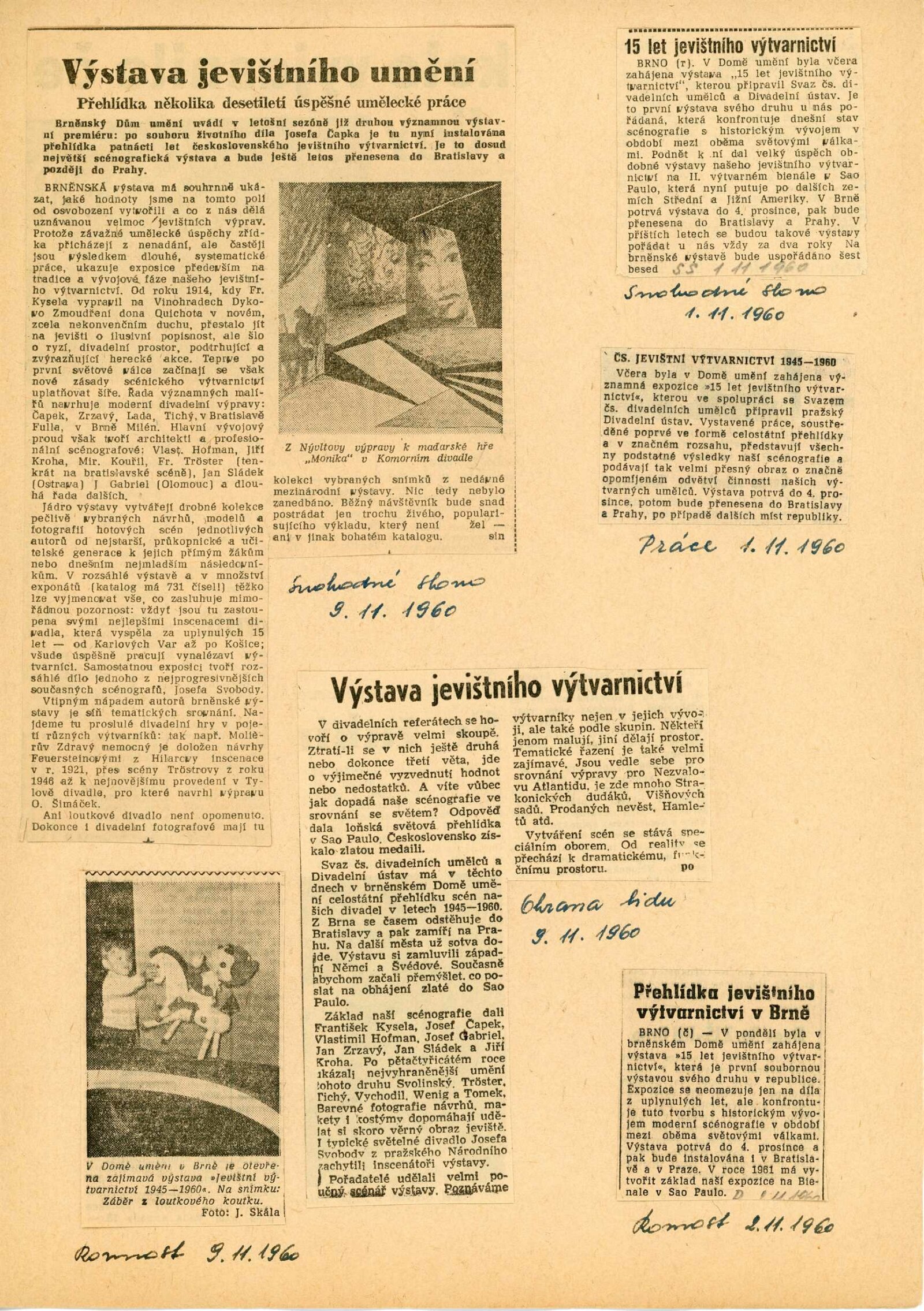 Jevištní výtvarnictví 1945–1960: Dům umění Brno, 31. 10. – 4. 12. 1960 / Text: anonymní. – Praha: Divadelní ústav, 1960. – 8 s., 36 s. obr. příl., seznam vystavených prací 32 s., DU 384. – MG; UPM