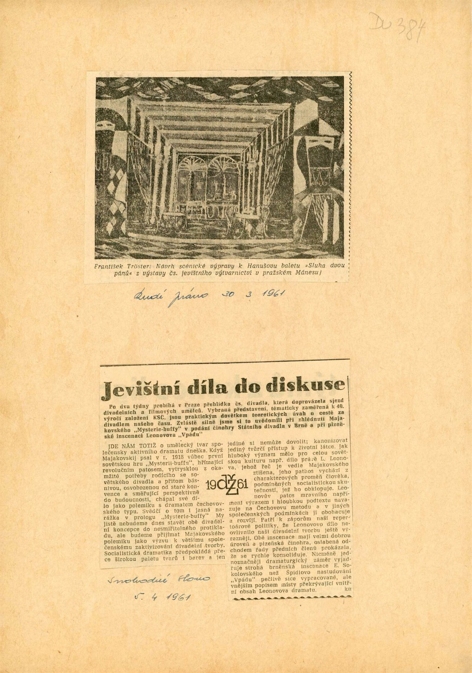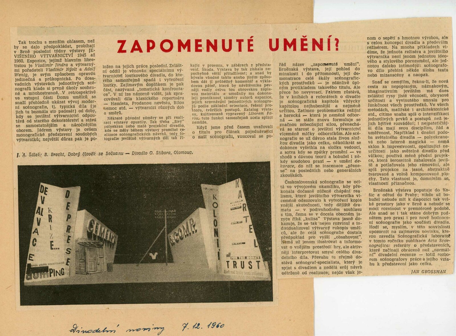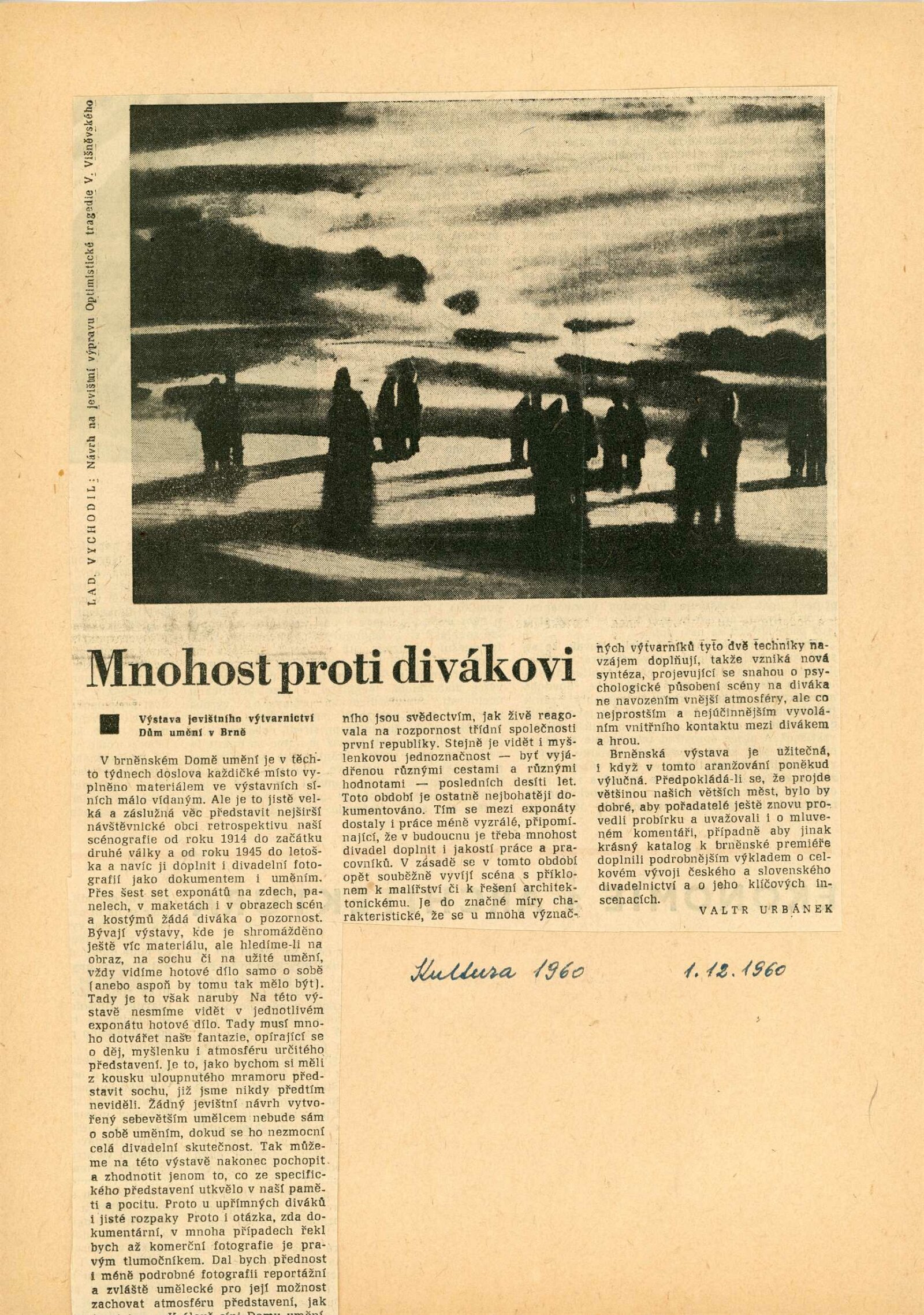 Jevištní výtvarnictví 1945–1960: Dům umění Brno, 31. 10. – 4. 12. 1960 / Text: anonymní. – Praha: Divadelní ústav, 1960. – 8 s., 36 s. obr. příl., seznam vystavených prací 32 s., DU 384. – MG; UPM
