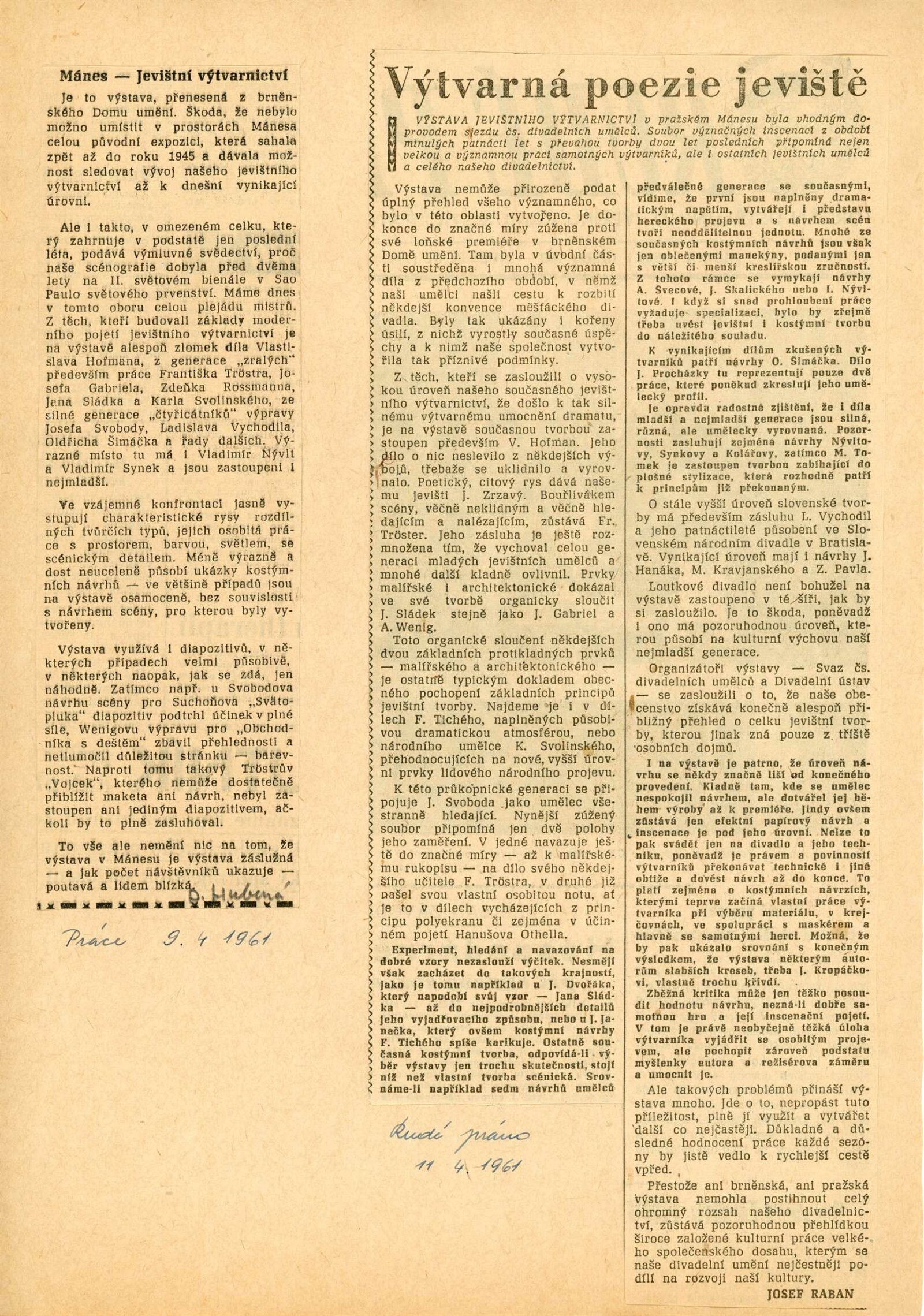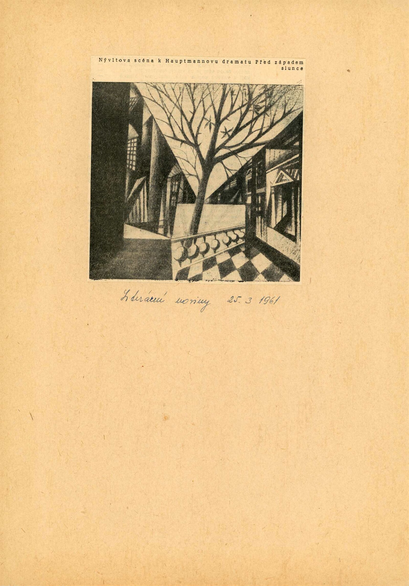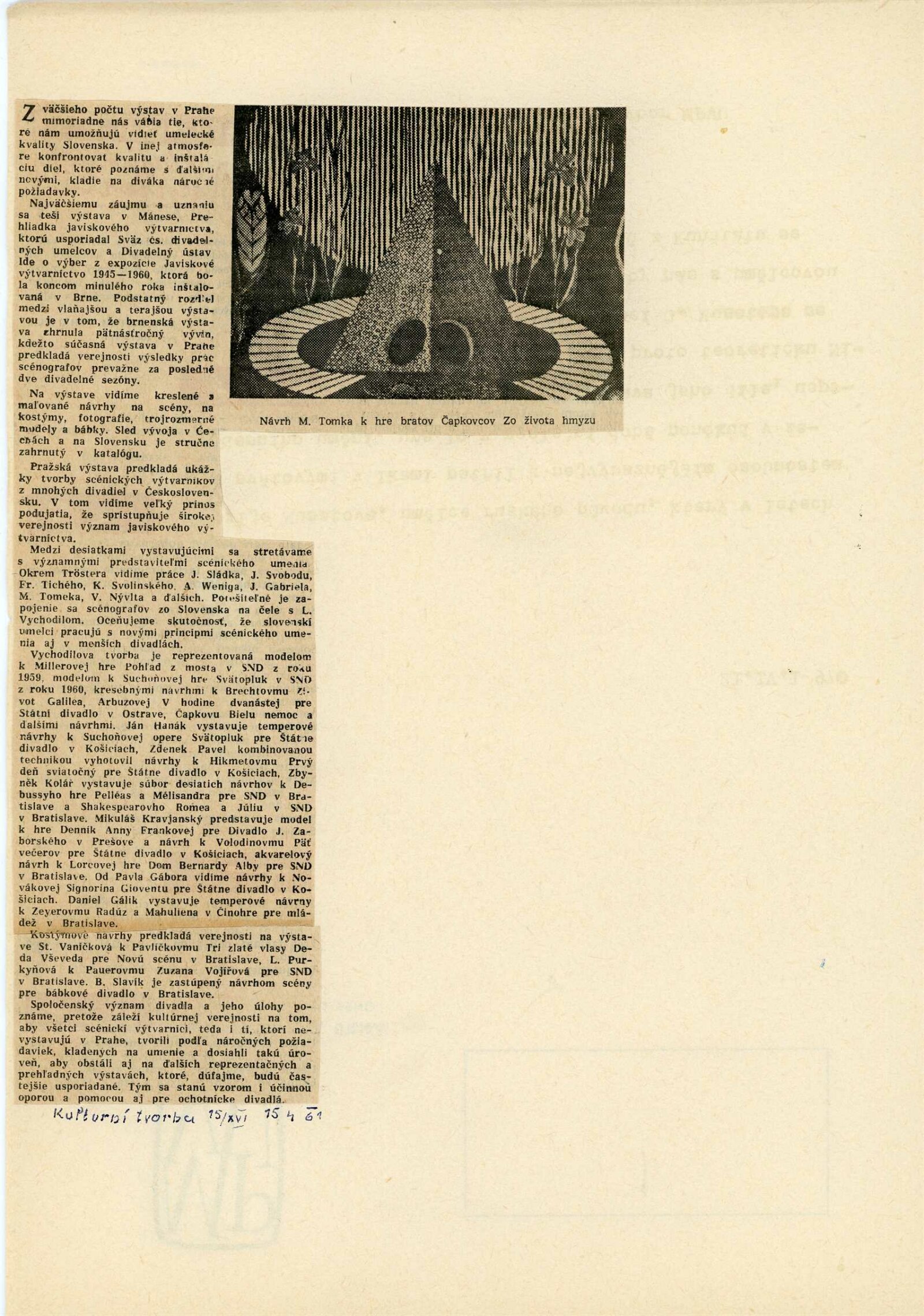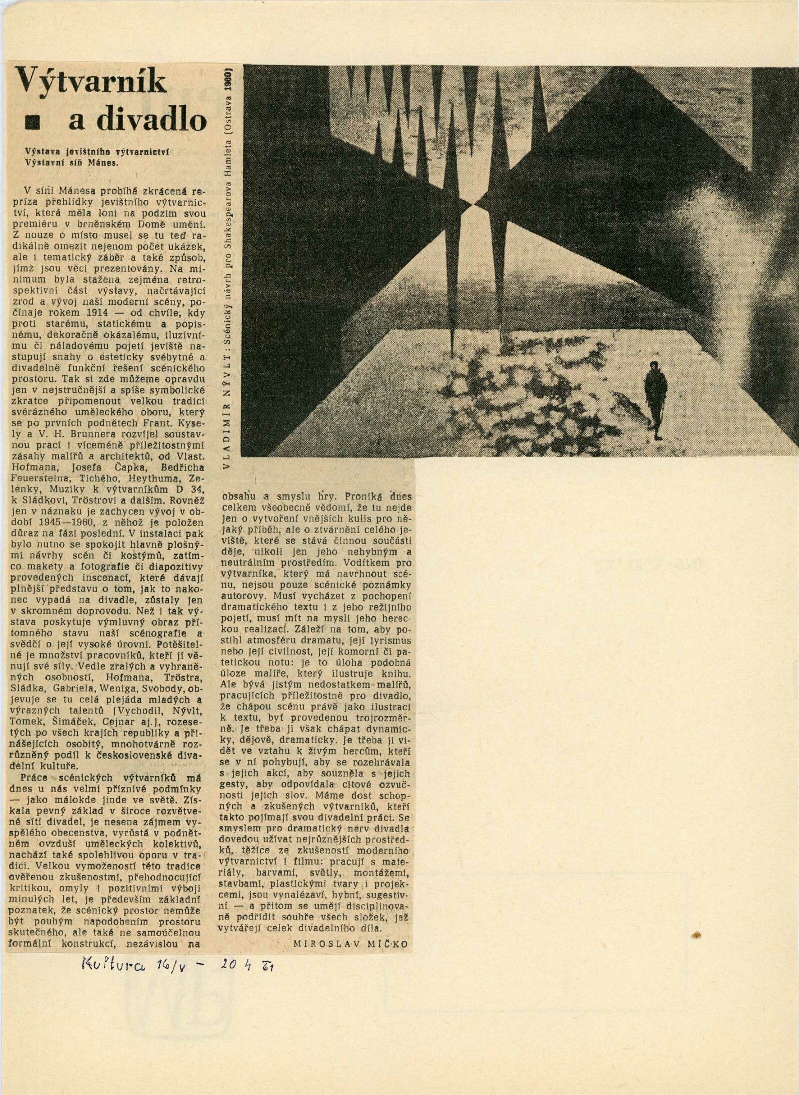Jevištní výtvarnictví 1945–1960: Dům umění Brno, 31. 10. – 4. 12. 1960 / Text: anonymní. – Praha: Divadelní ústav, 1960. – 8 s., 36 s. obr. příl., seznam vystavených prací 32 s., DU 384. – MG; UPM