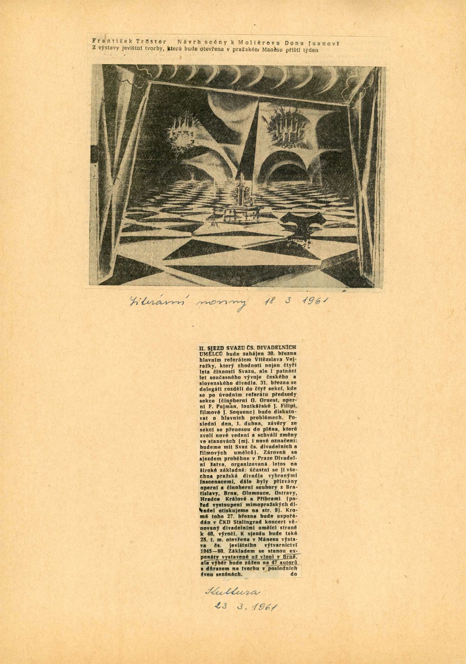 pozvánka (návrh Libor Fára), fotografie z výstavy (jiná instituce), korespondence (se Svazem čs. divadel. umělců), recenze v tisku, sborník dokumentů Technický rozvoj čs. divadelnictví
