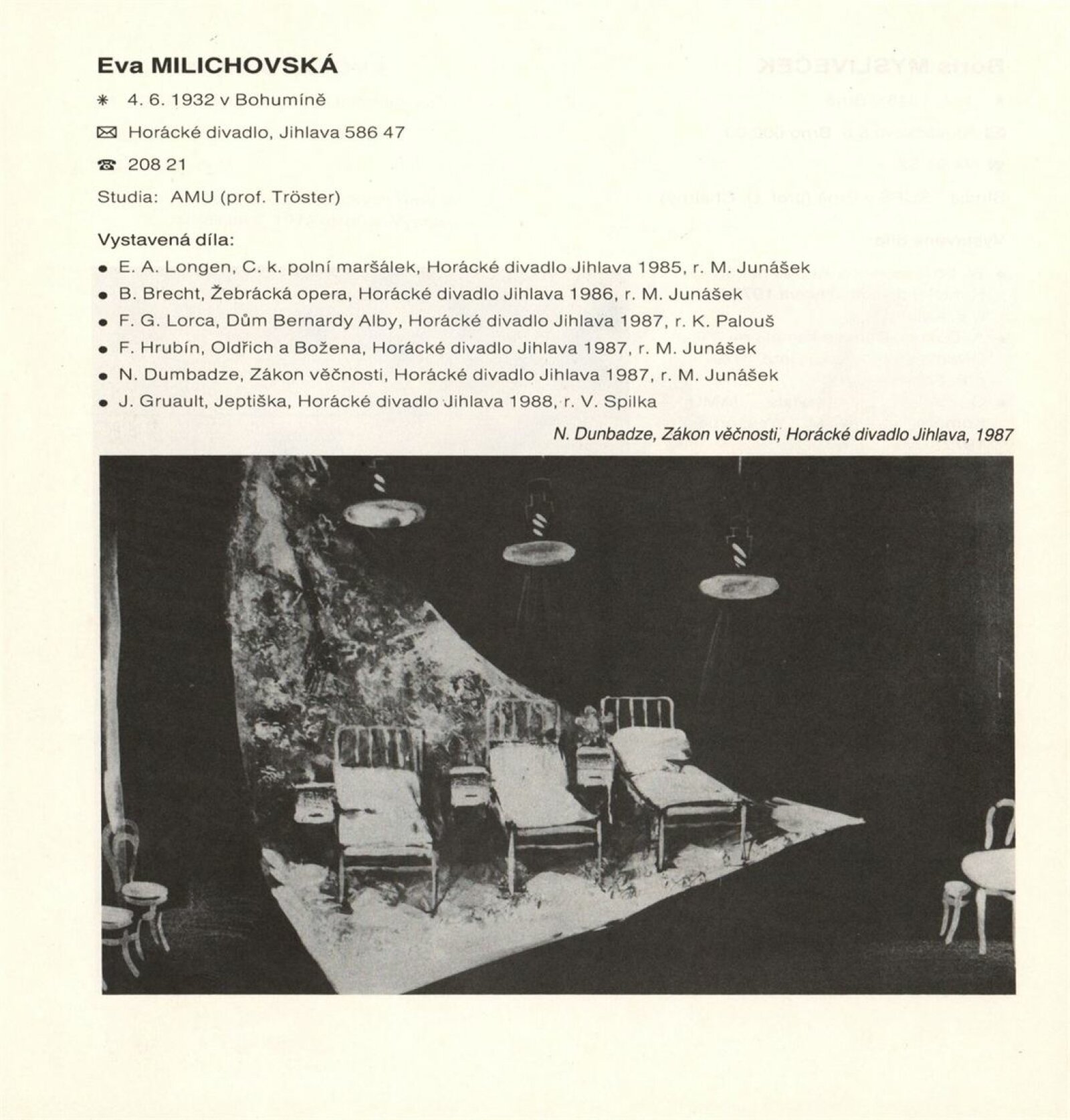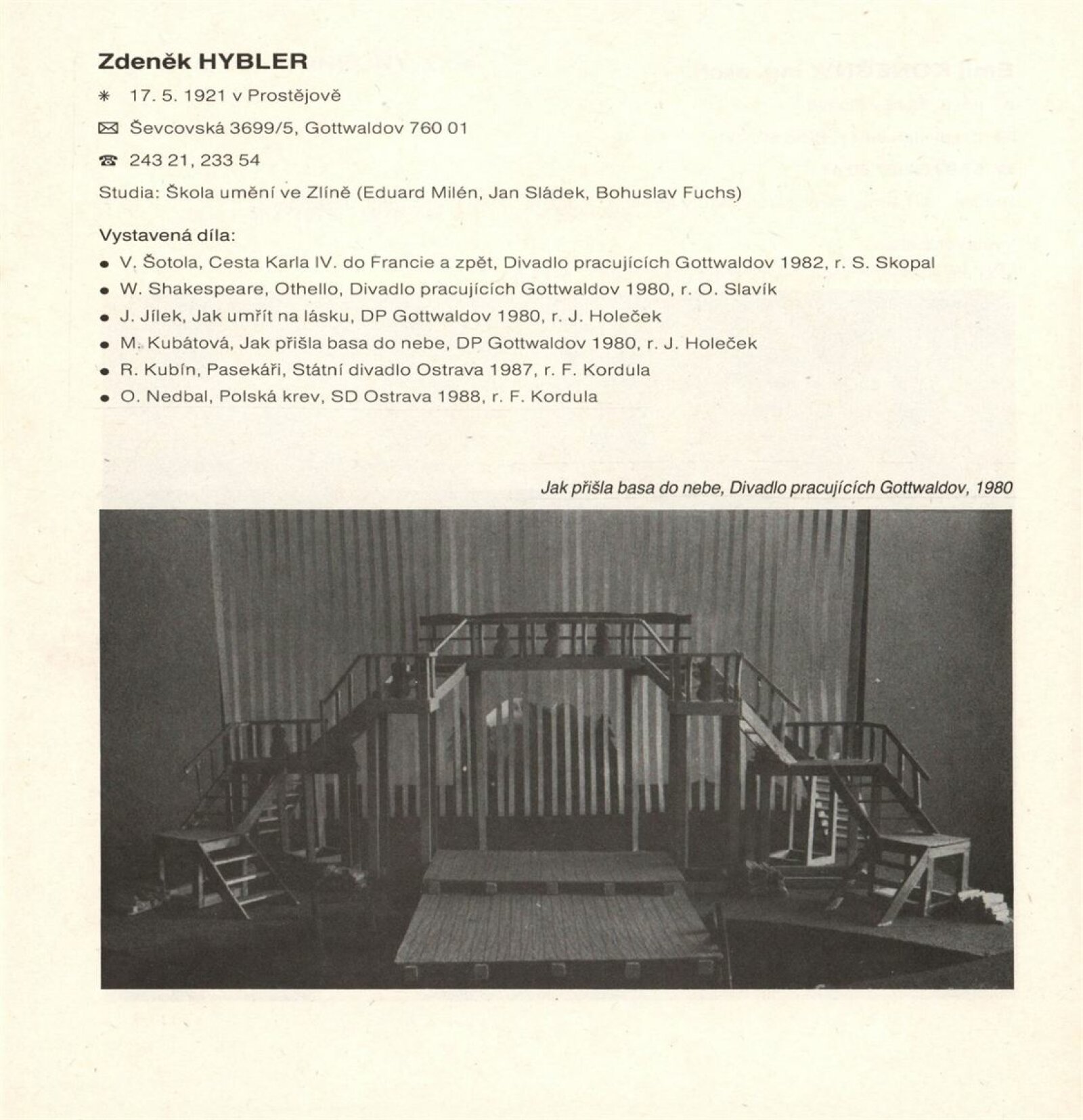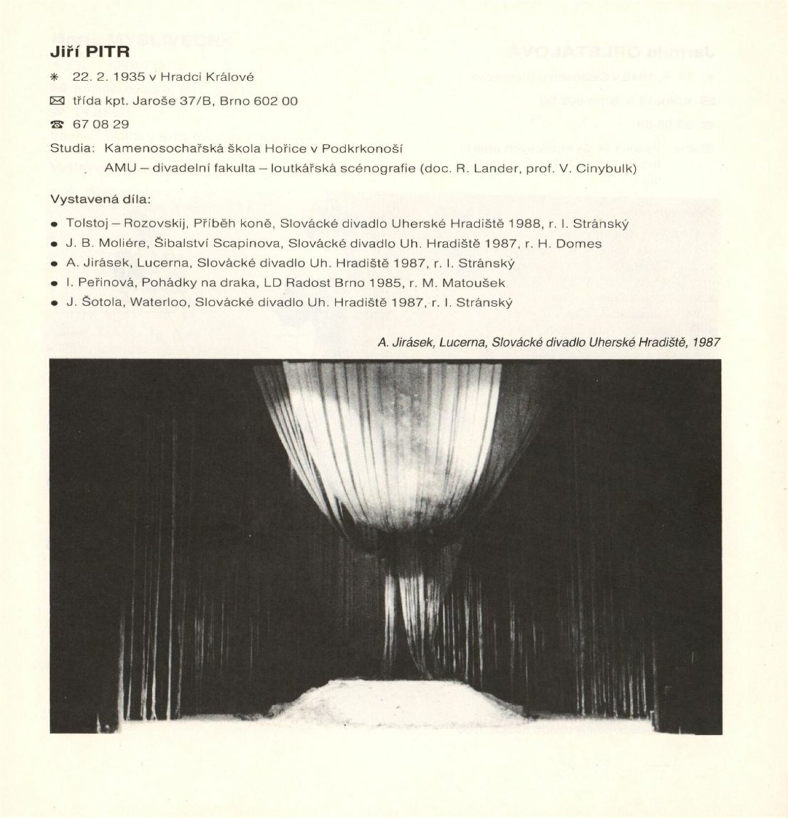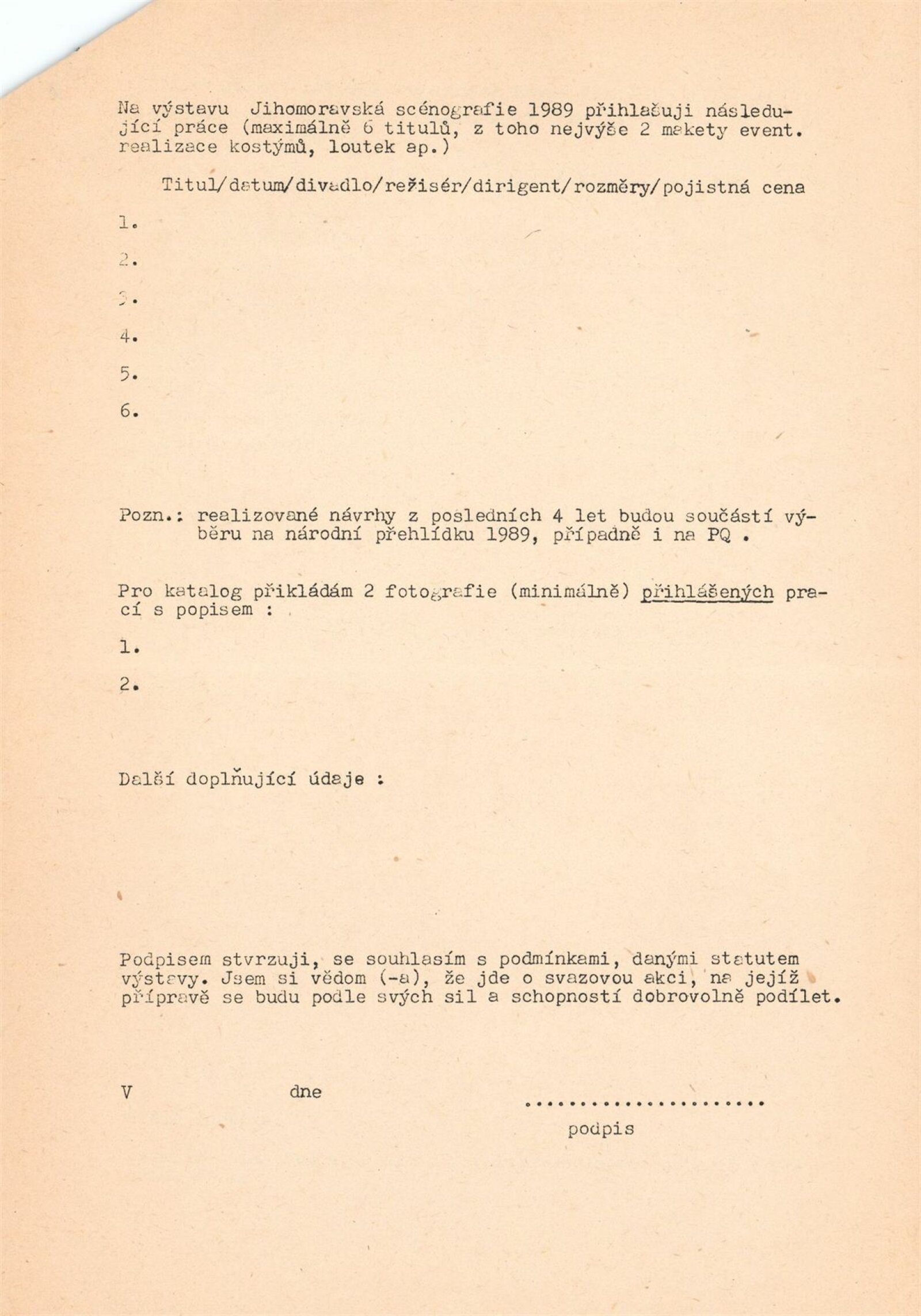 pozvánka, katalog, zápis z pracovní schůzky, vzor přihlášky na výstavu, návrh instalace výstavy, fotografie, seznam zapůjčených předmětů z MM, korespondence, statut výstavy, výzva scénografům k účasti na výstavě, žádost a potvrzení o konání výstavy, recenze v tisku