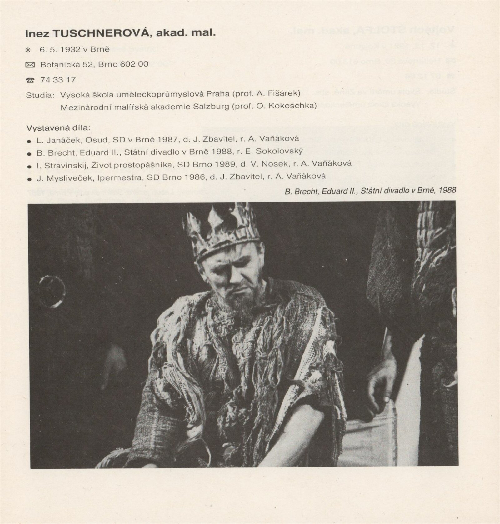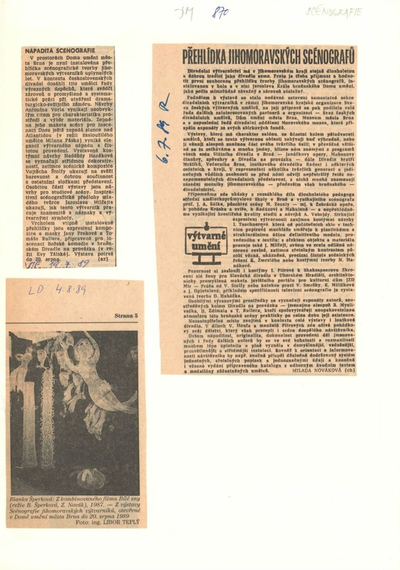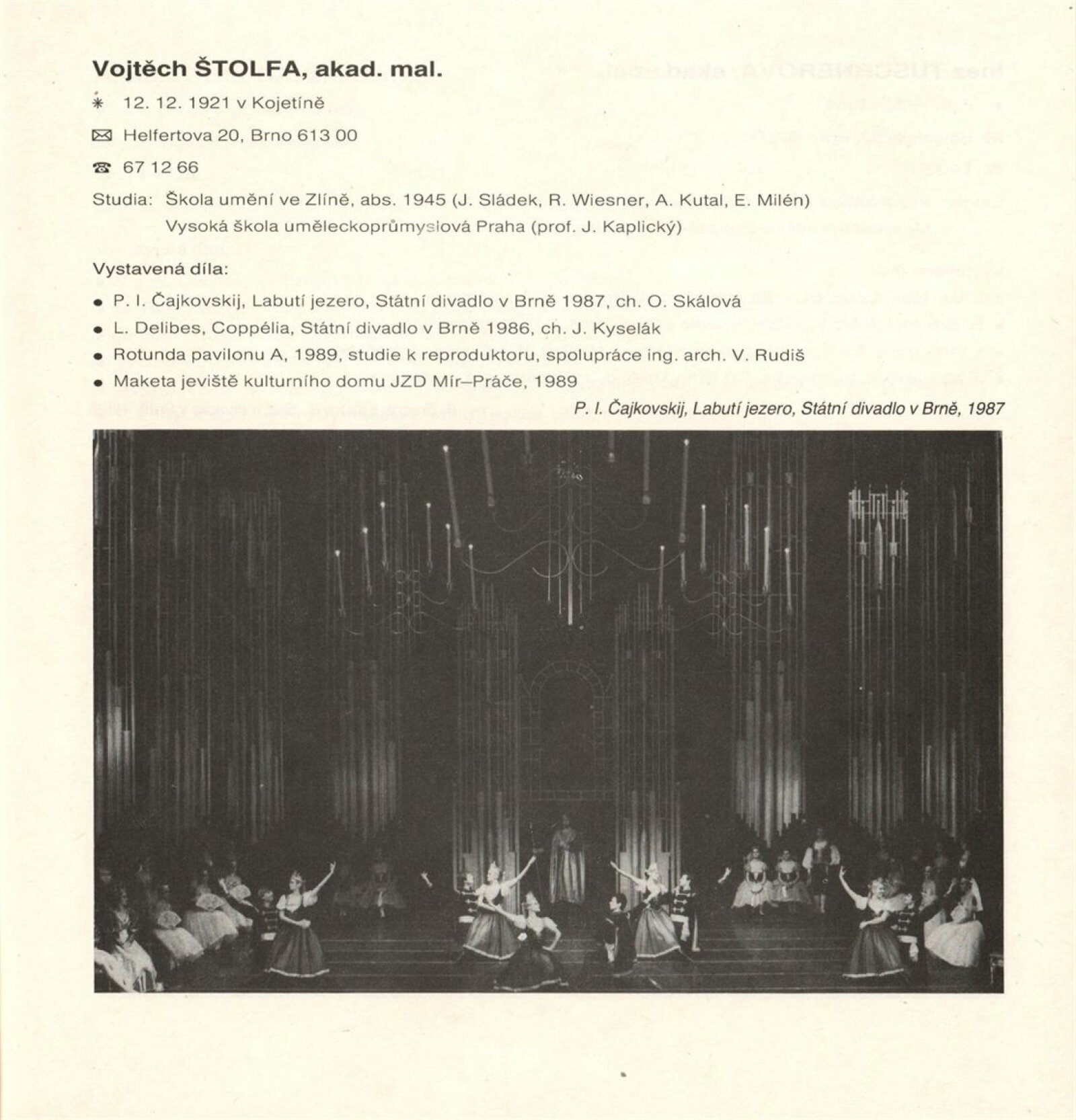 Jihomoravská scénografie ´89. Výstava členů a kandidátů SČVU a profesionálních výtvarníků Jihomoravského kraje: Dům umění města Brna, Galerie Jaroslava Krále, hala, 21. 6. – 20. 8. 1989 / Texty: Vojtěch Štolfa, Jiřina Telcová, Zuzana Ledererová. – Brno: SČVU, 1989. – [34] s., obr., DU 870. – MG