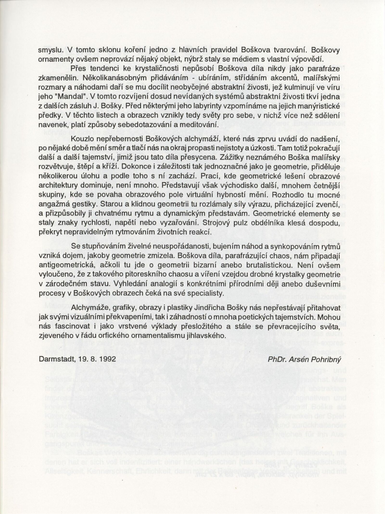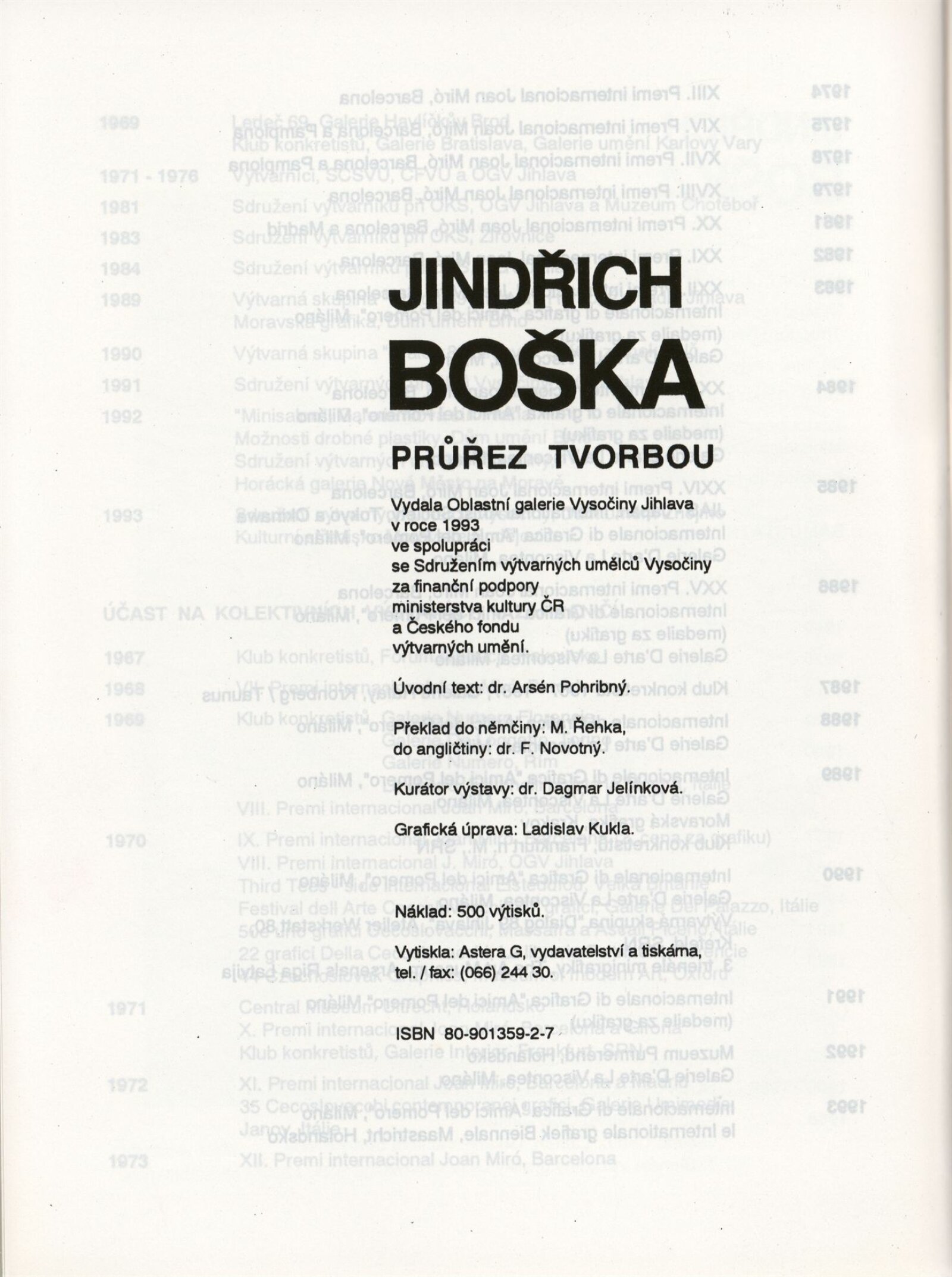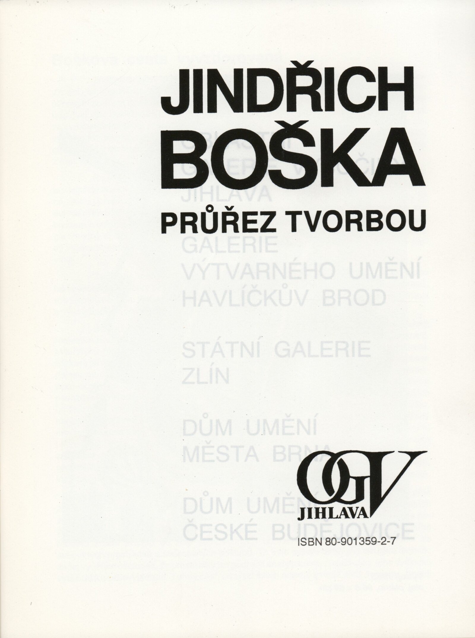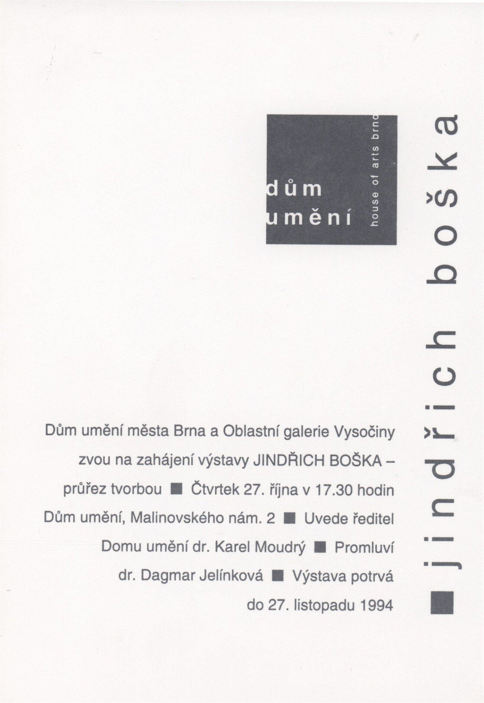 Jindřich Boška. Průřez tvorbou: ... Dům umění města Brna, Procházkova síň, ... 27. 10. – 27. 11. 1994 / Text Arsén Pohribný. - Jihlava: Oblastní galerie Vysočiny, - [38] s., obr. Životní data, výstavy DU 980; MZK