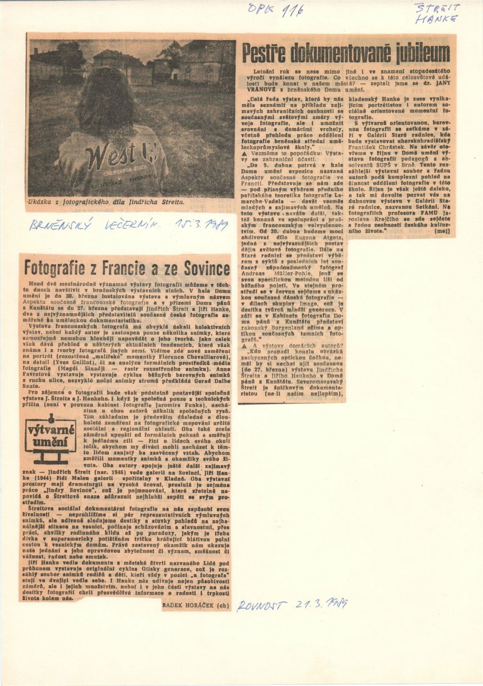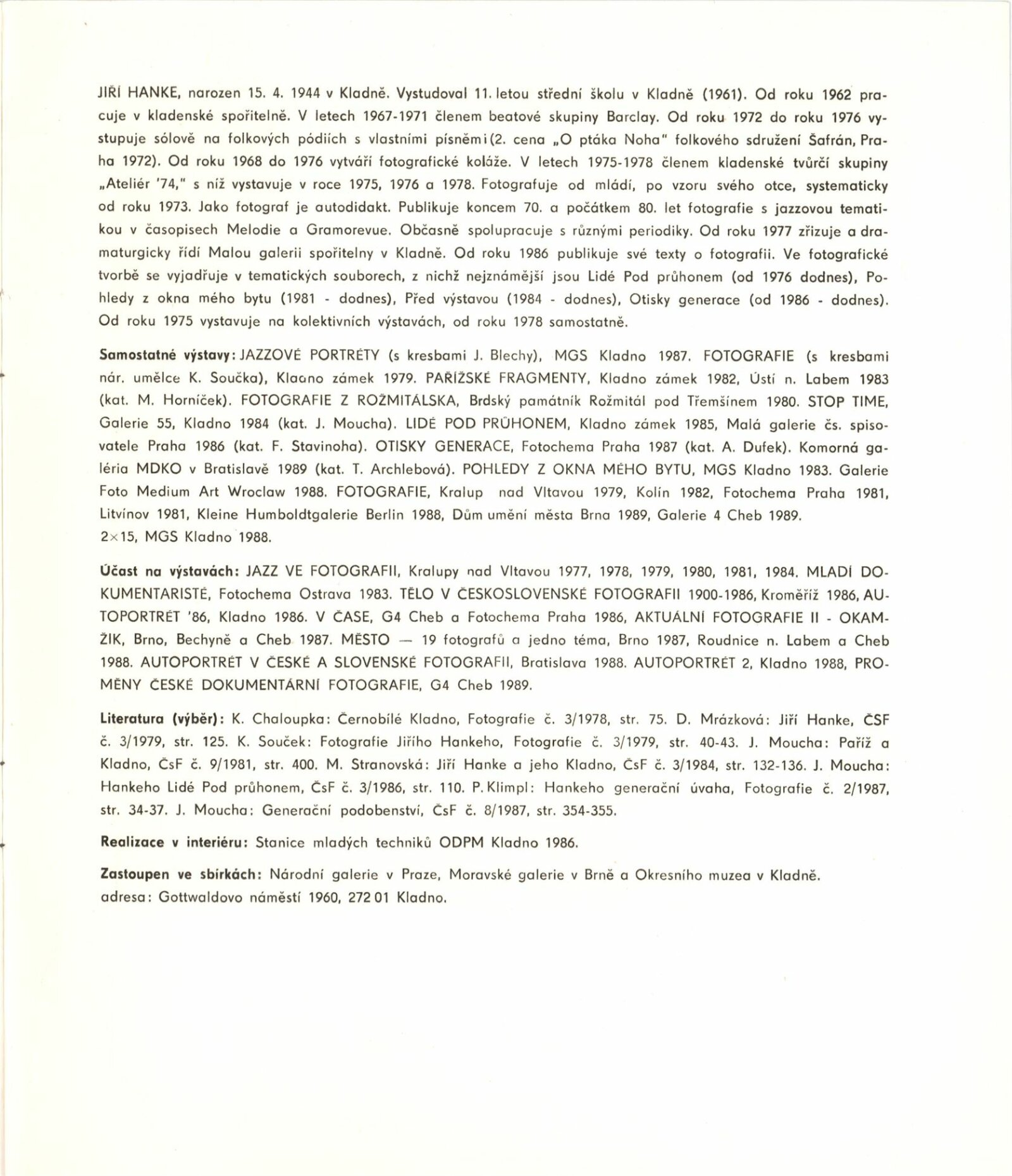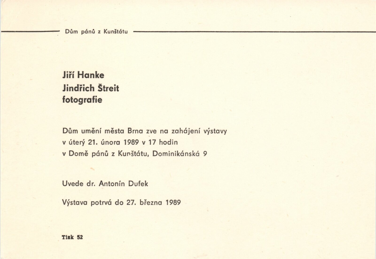 Jiří Hanke. Fotografie: Dům umění / Dům pánů z Kunštátu, 21. 2. – 27. 3. 1989 / Text: Antonín Dufek. – Brno: DUmB, 1989. – [9 ] s., obr., životní data, výstavy, zastoupení ve sbírkách, bibliografie, DPK 916. – MZK; MG / Jindřich Štreit. Fotografie: Dům umění / Dům pánů z Kunštátu, 21. 2. – 27. 3. 1989 / Text: Antonín Dufek. – Brno: DUmB, 1989. – [9] s., obr., životní data, výstavy, DPK 916. – MZK; MG; MMB