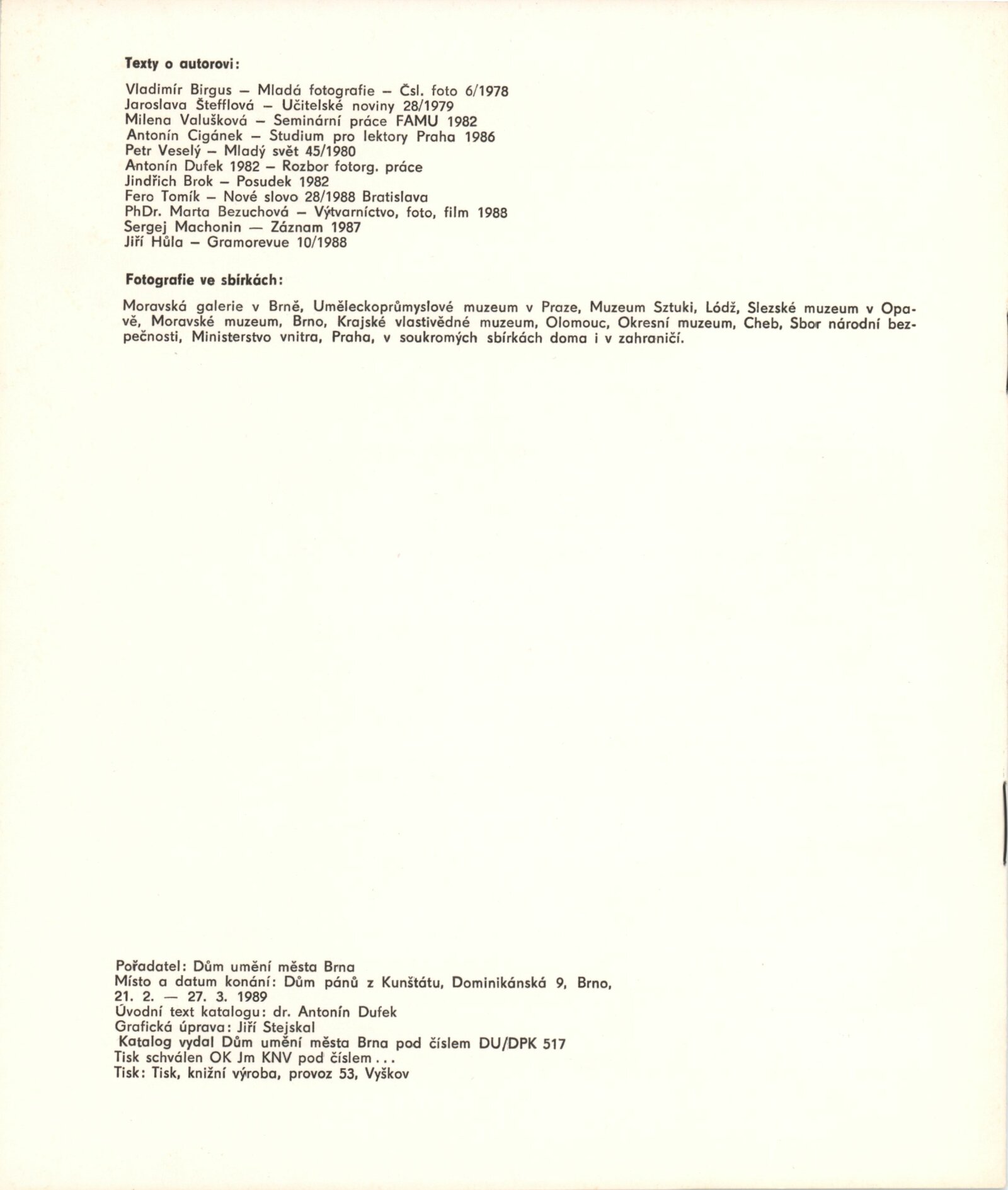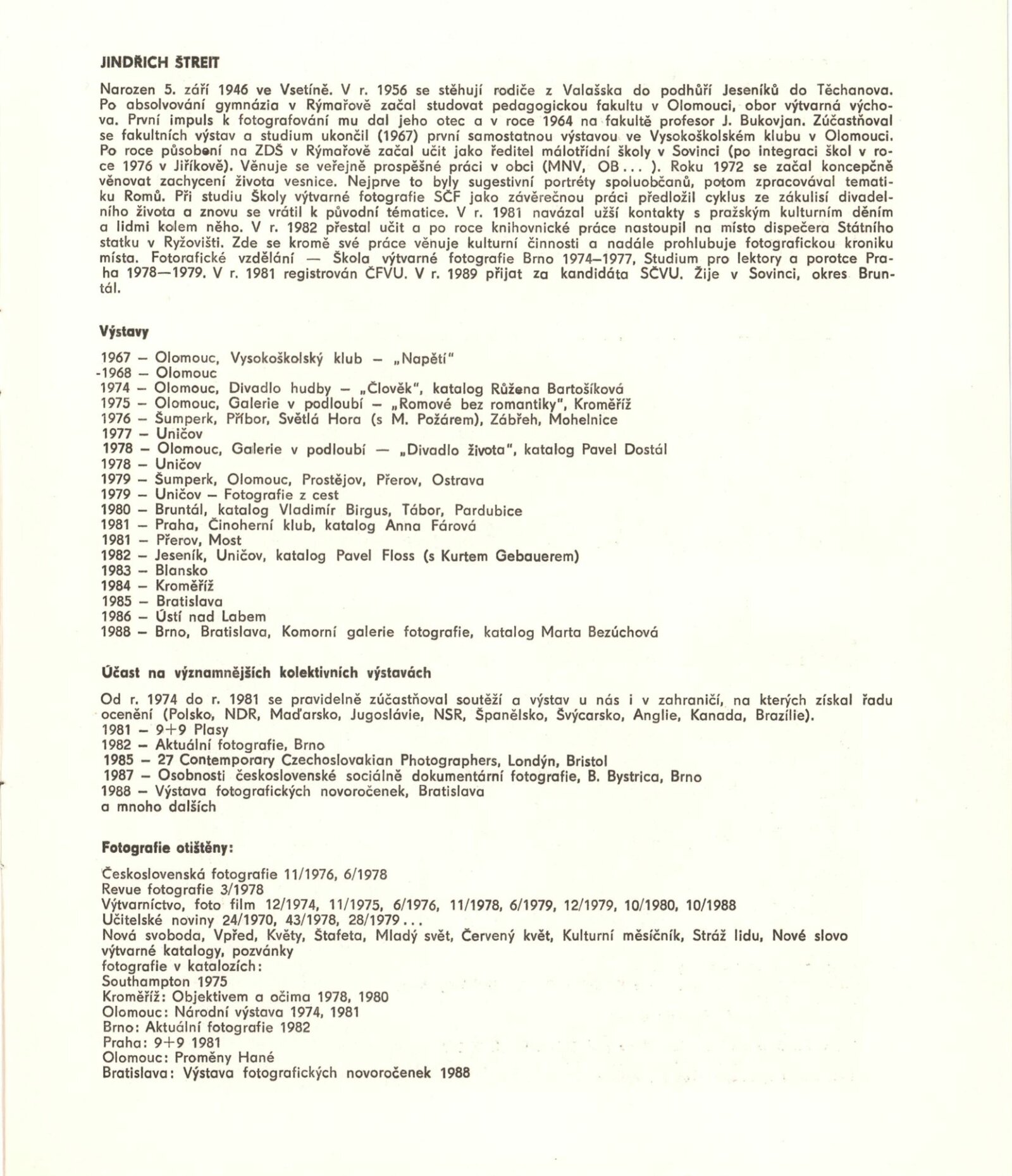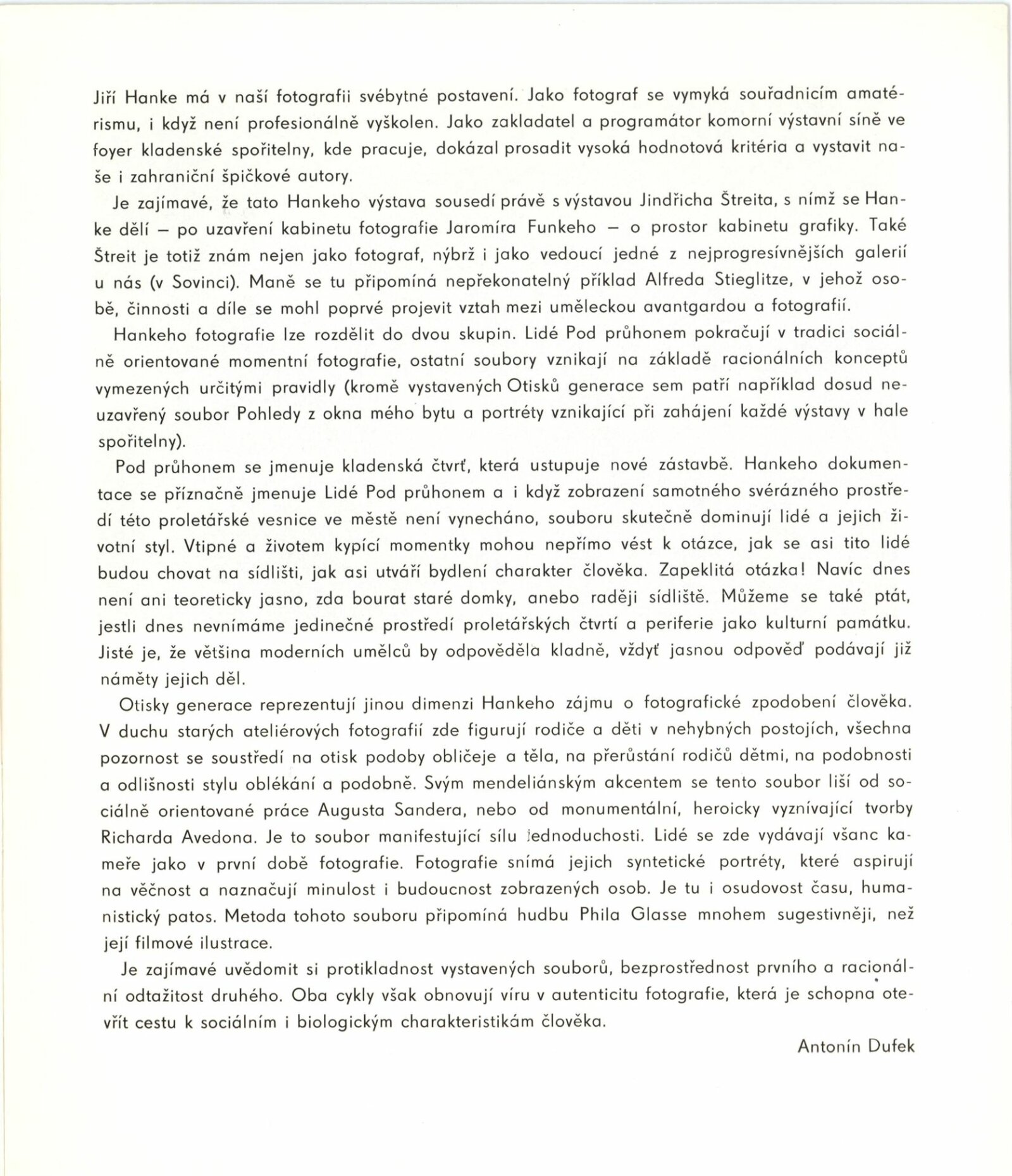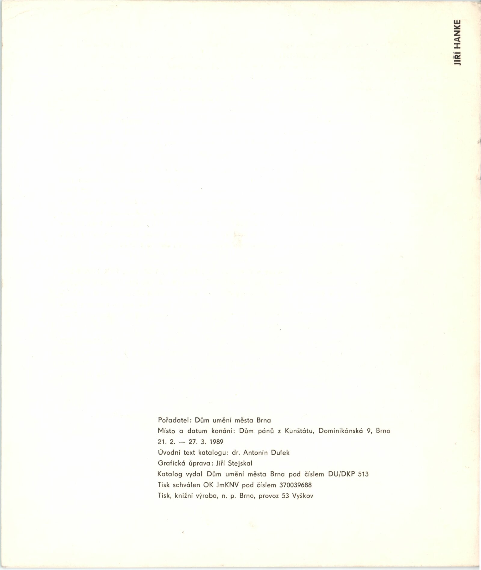 Jiří Hanke. Fotografie: Dům umění / Dům pánů z Kunštátu, 21. 2. – 27. 3. 1989 / Text: Antonín Dufek. – Brno: DUmB, 1989. – [9 ] s., obr., životní data, výstavy, zastoupení ve sbírkách, bibliografie, DPK 916. – MZK; MG / Jindřich Štreit. Fotografie: Dům umění / Dům pánů z Kunštátu, 21. 2. – 27. 3. 1989 / Text: Antonín Dufek. – Brno: DUmB, 1989. – [9] s., obr., životní data, výstavy, DPK 916. – MZK; MG; MMB