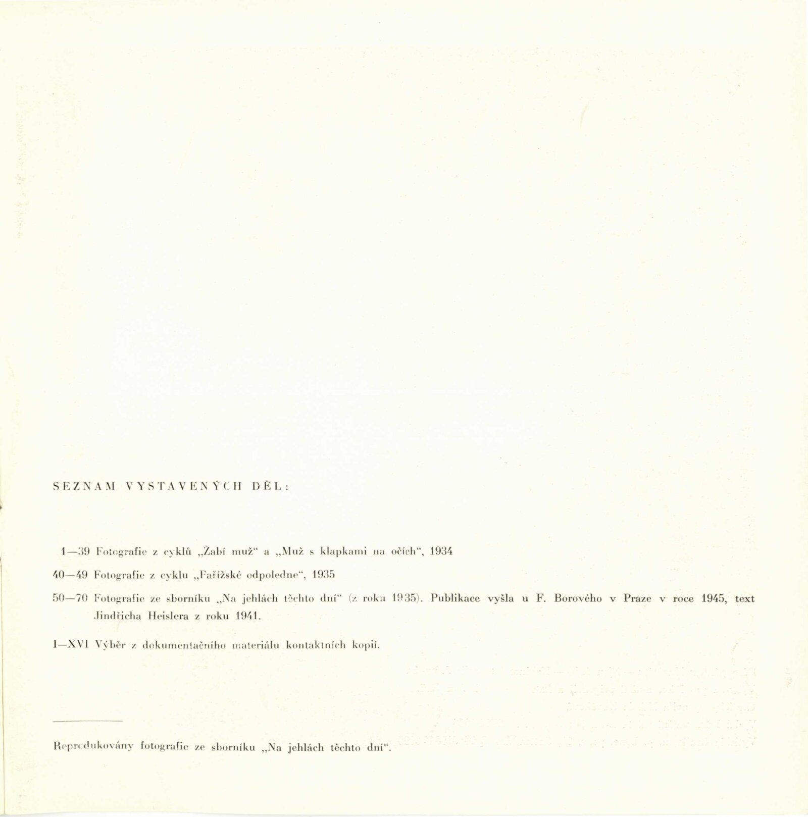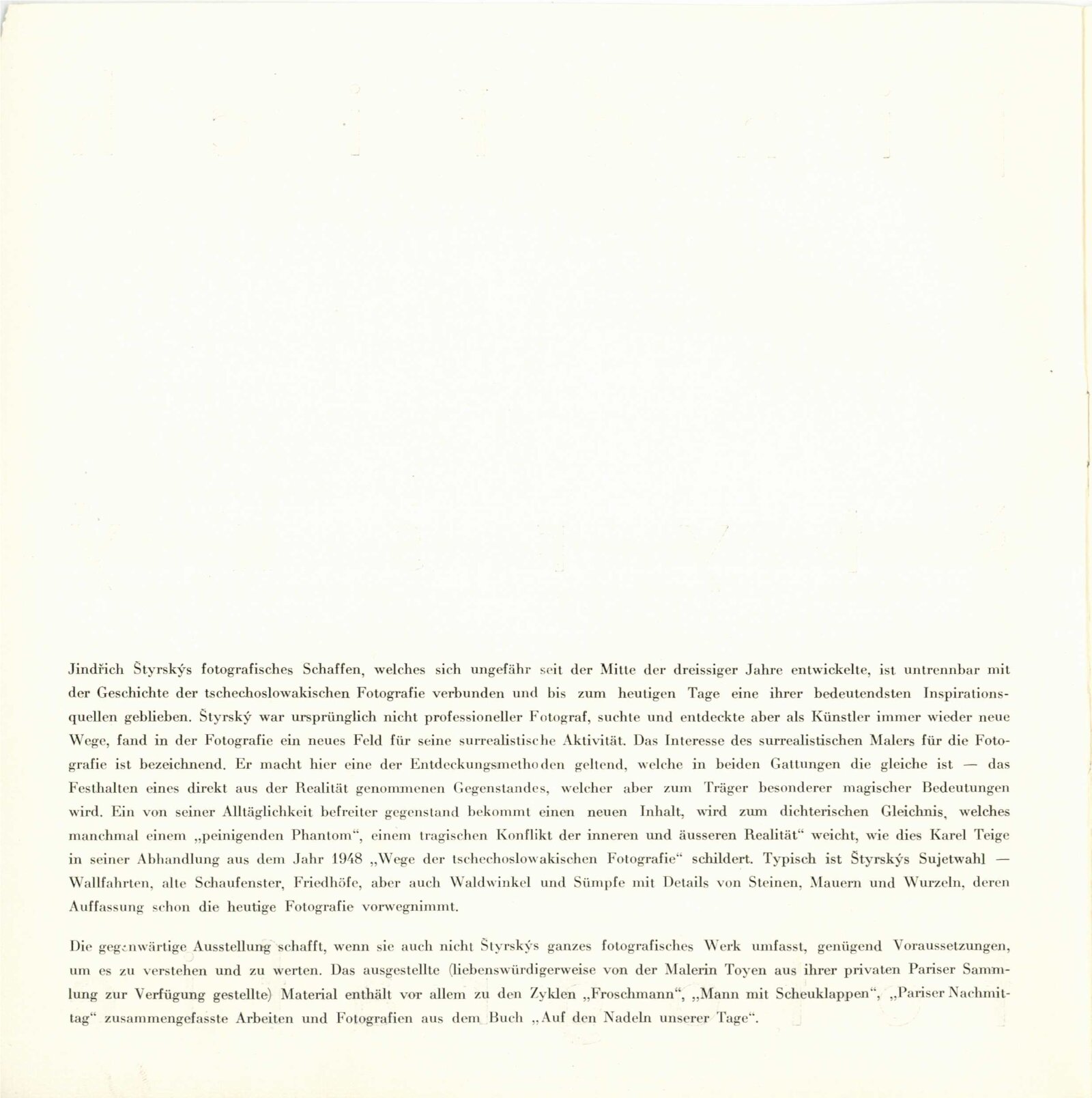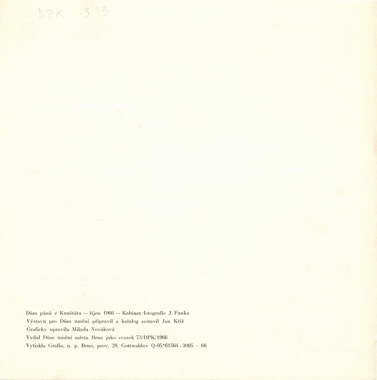 Jindřich Štyrský. Fotografie: Dům umění města Brna / Dům pánů z Kunštátu, 75. výstava Kabinetu fotografie Jaromíra Funka, 30. 9. – 30. 10. 1966 / Text: Jan Kříž. – Brno: DUmB, 1966. – 12 s., obr., DPK 313. – MZK; MG