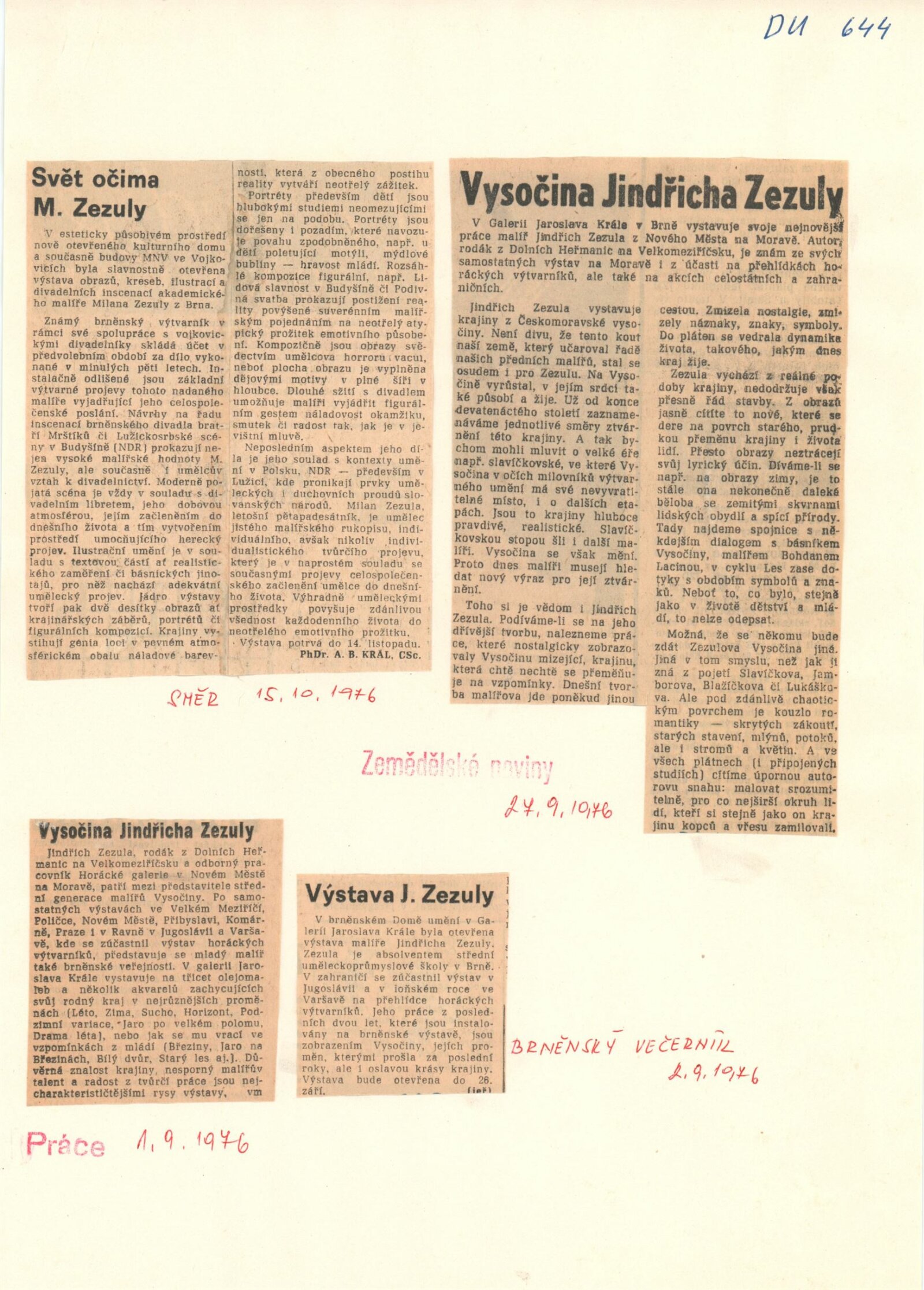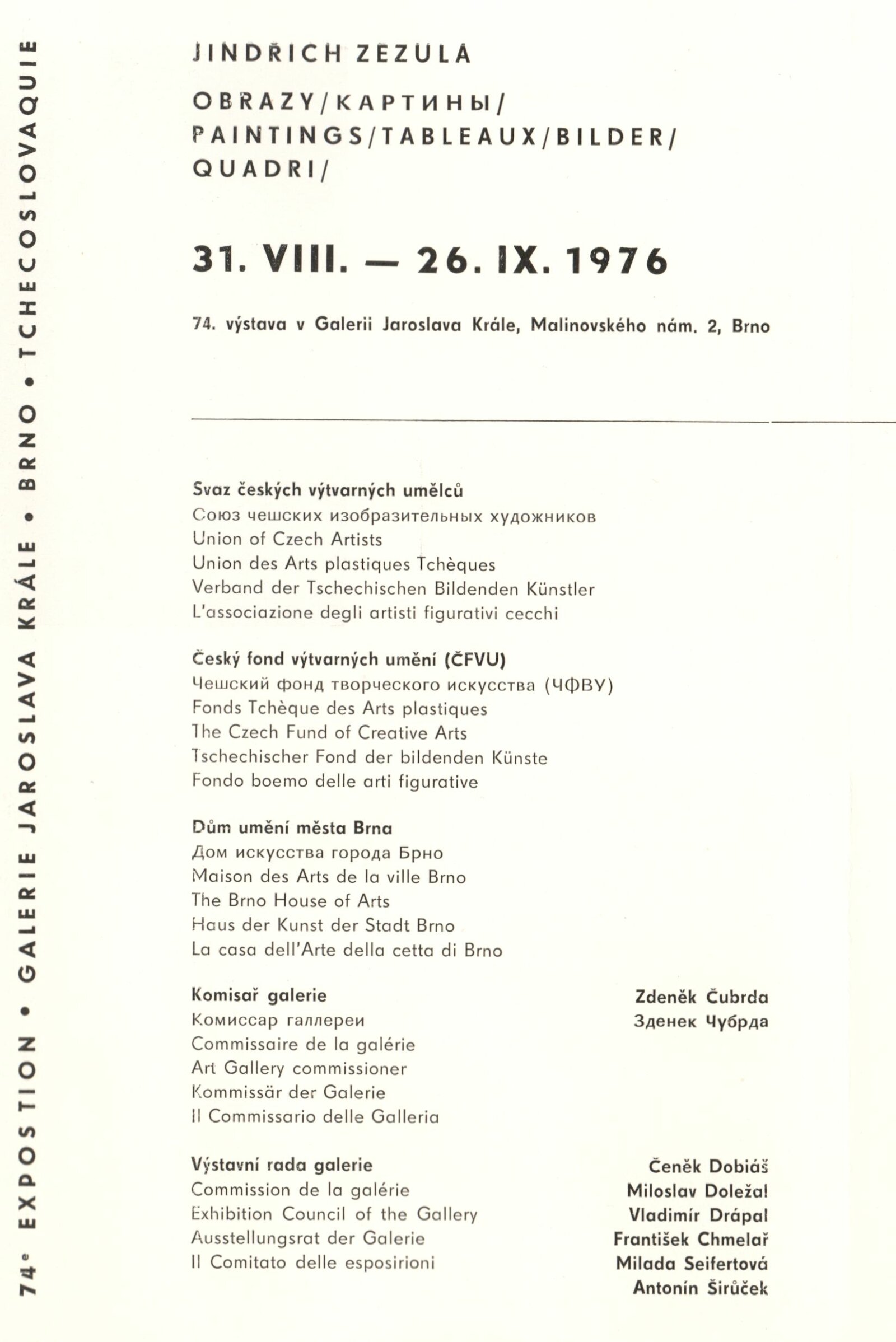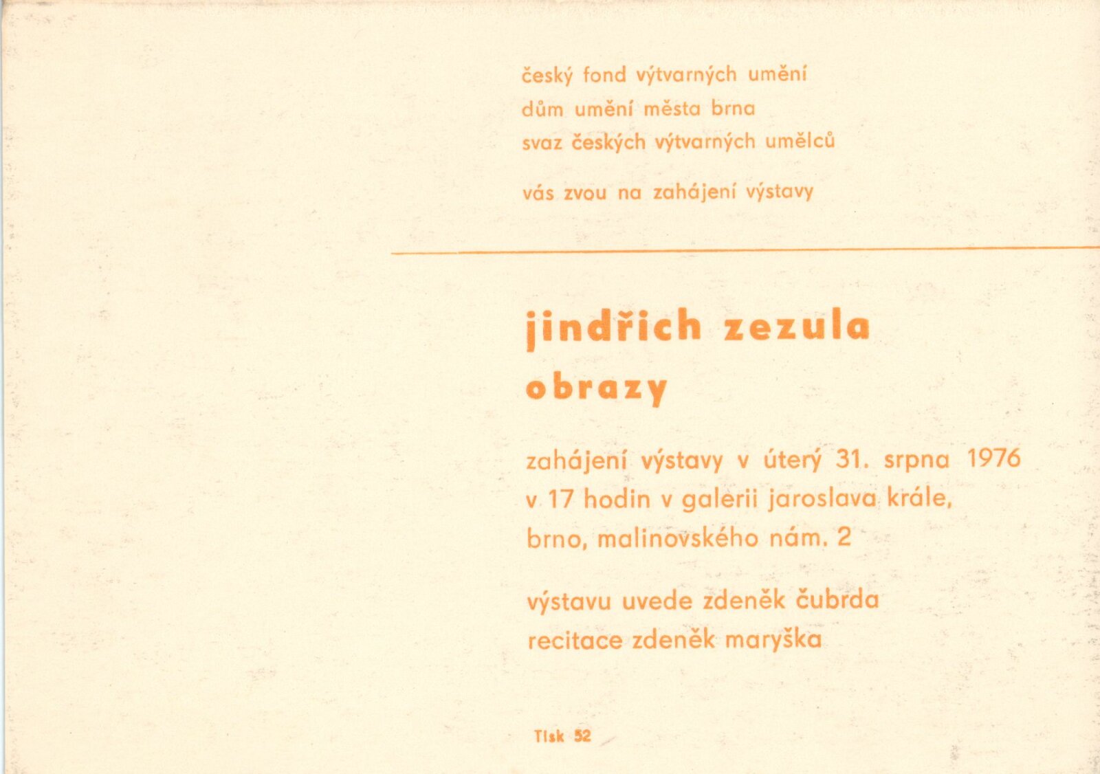 Jindřich Zezula. Obrazy: Dům umění, 74. výstava v Galerii Jaroslava Krále, 31. 8. – 26. 9. 1976 / Text: Zdeněk Čubrda. – Brno: ČFVU, 1976. – 10 s., obr., seznam vystavených prací 2 s., portrét, životopis, výstavy, DU 644. – MZK; MG; MMB