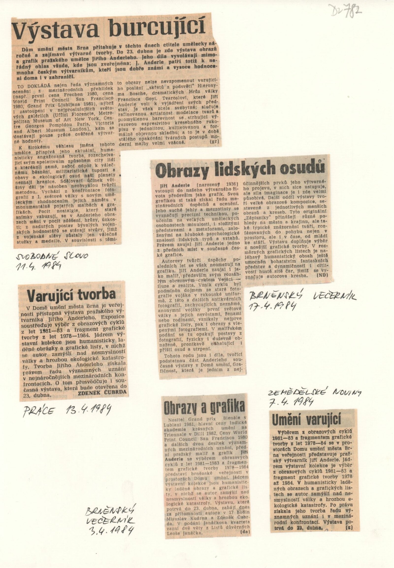 Jiří Anderle. Výběr z obrazových cyklů 1981–1983. Fragment grafické tvorby 1978–1984: Dům umění, 121. výstava v Galerii Jaroslava Krále, 3. 4. – 23. 4. 1984 / Text: Zdeněk Čubrda. – Brno: SČVU, 1984. – 12 s., obr., seznam vystavených prací 2 s., portrét, životopis, DU 782