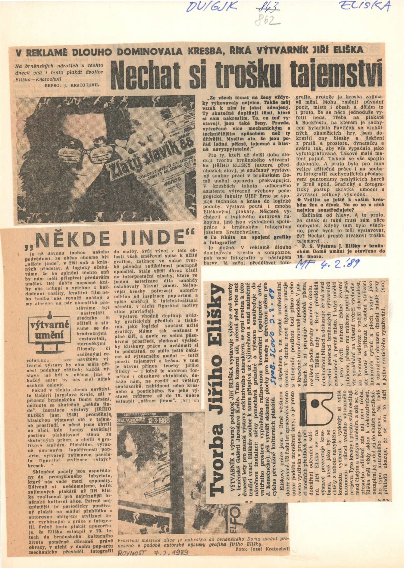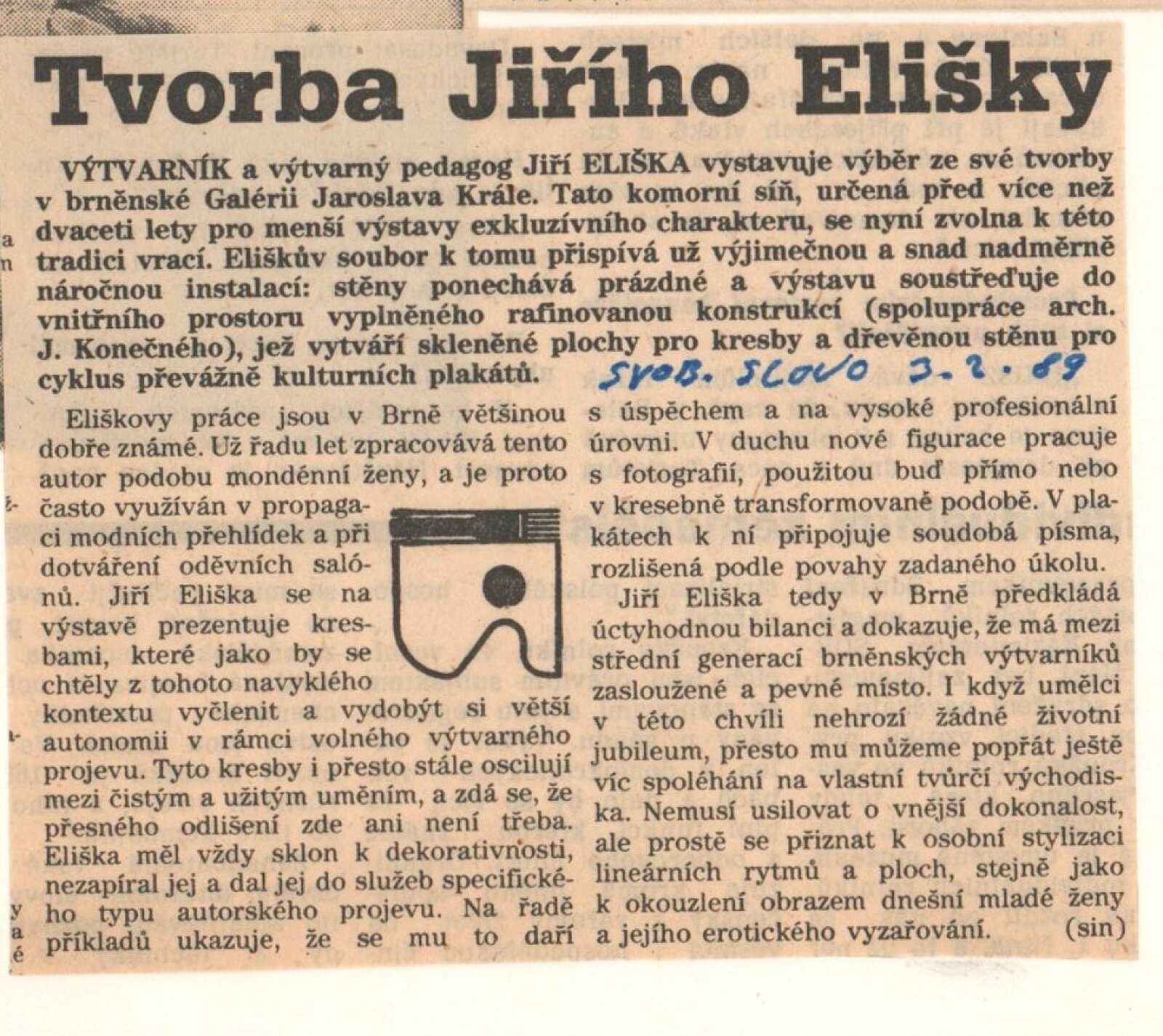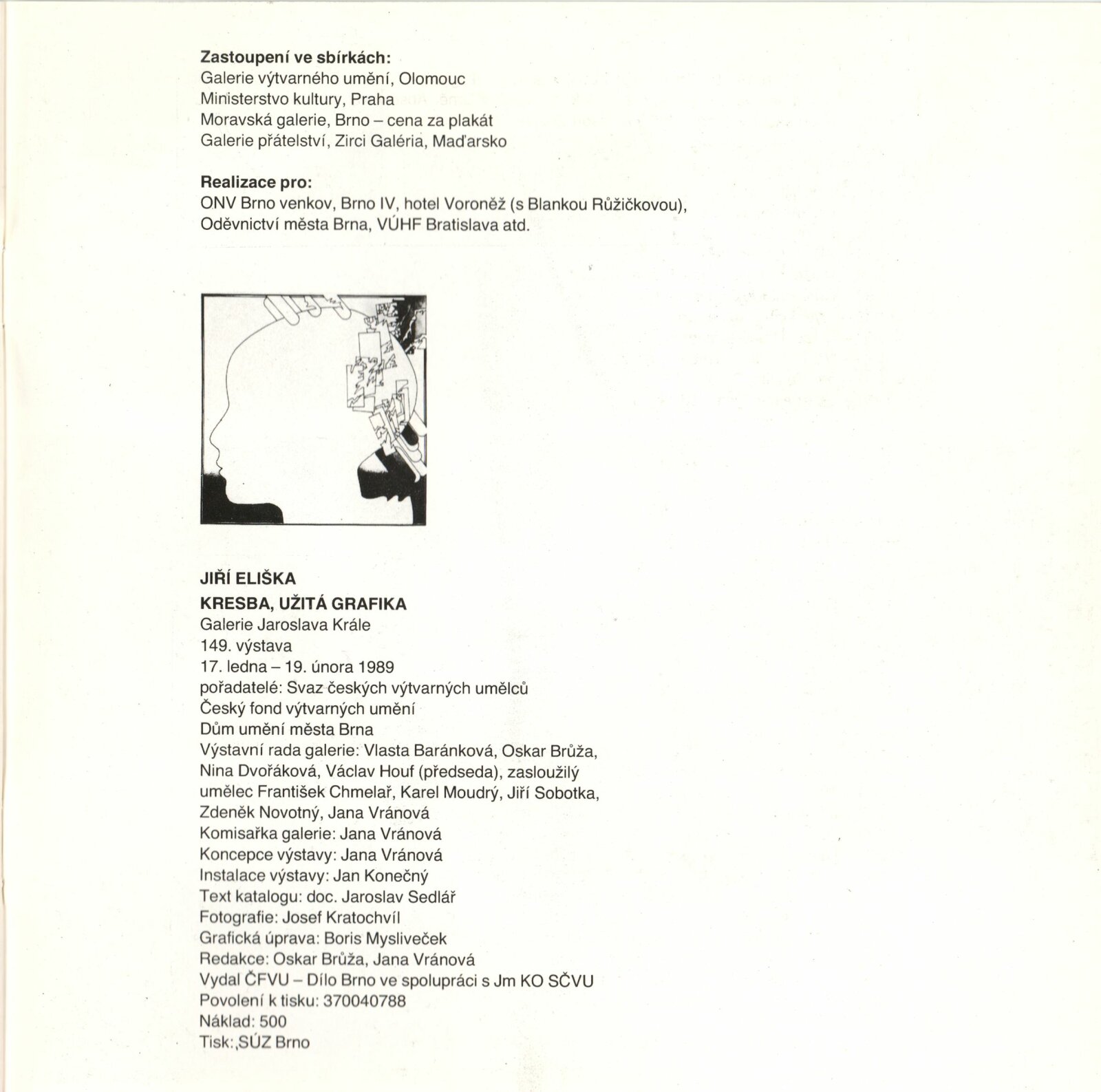 Jiří Eliška. Kresba, užitá grafika: Dům umění, 149. výstava v Galerii Jaroslava Krále, 17. 1. – 19. 2. 1989 / Text: Jaroslav Sedlář. – Brno: ČFVU-Dílo, 1989. – [20] s., obr., životní data, seznam výstav, zastoupení ve sbírkách, DU 862. – MZK; MG; MMB