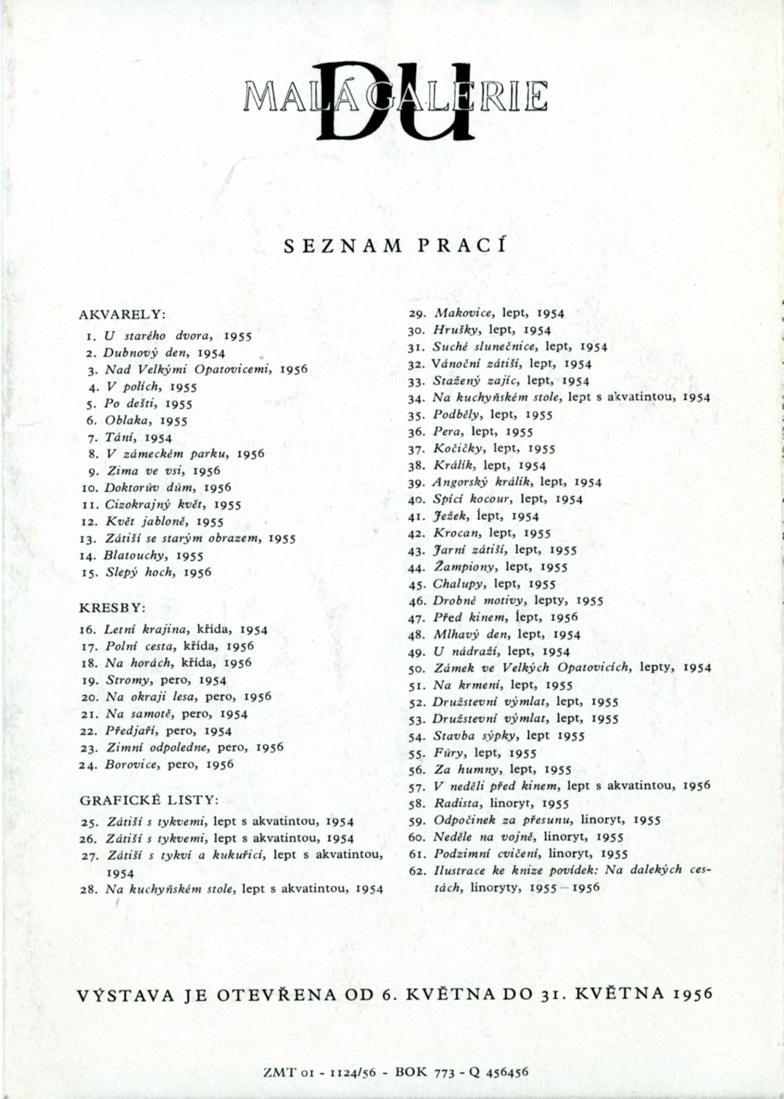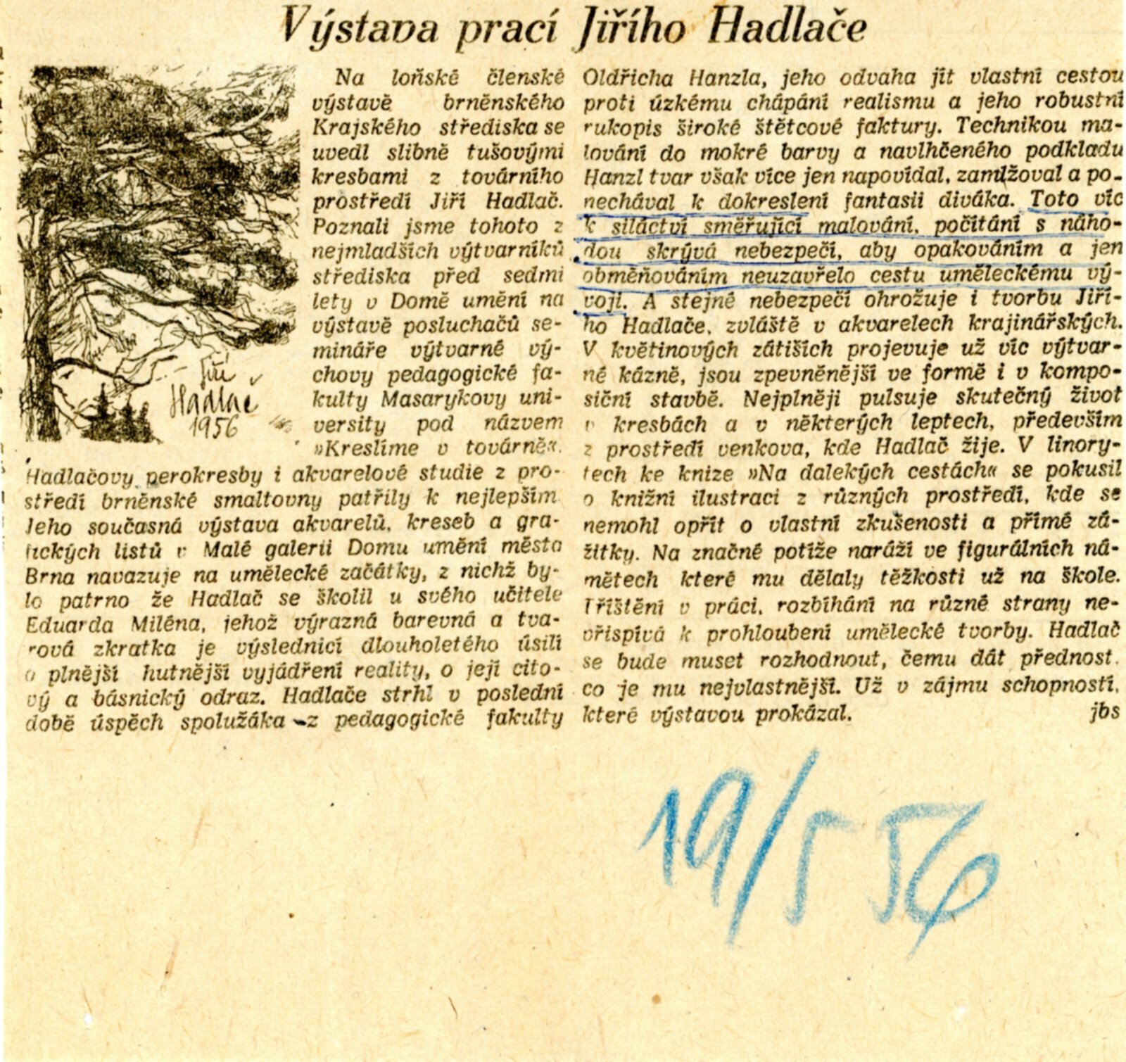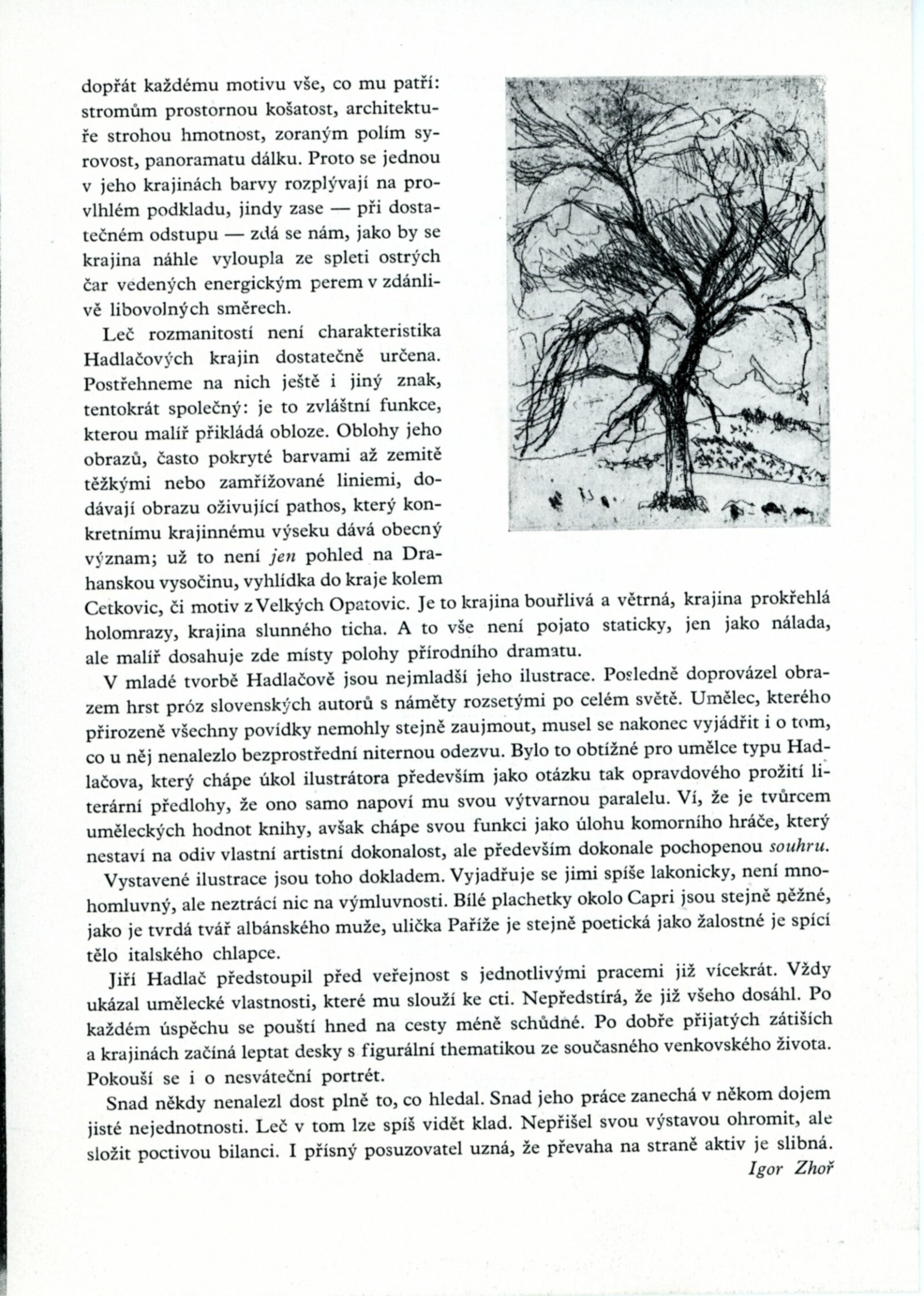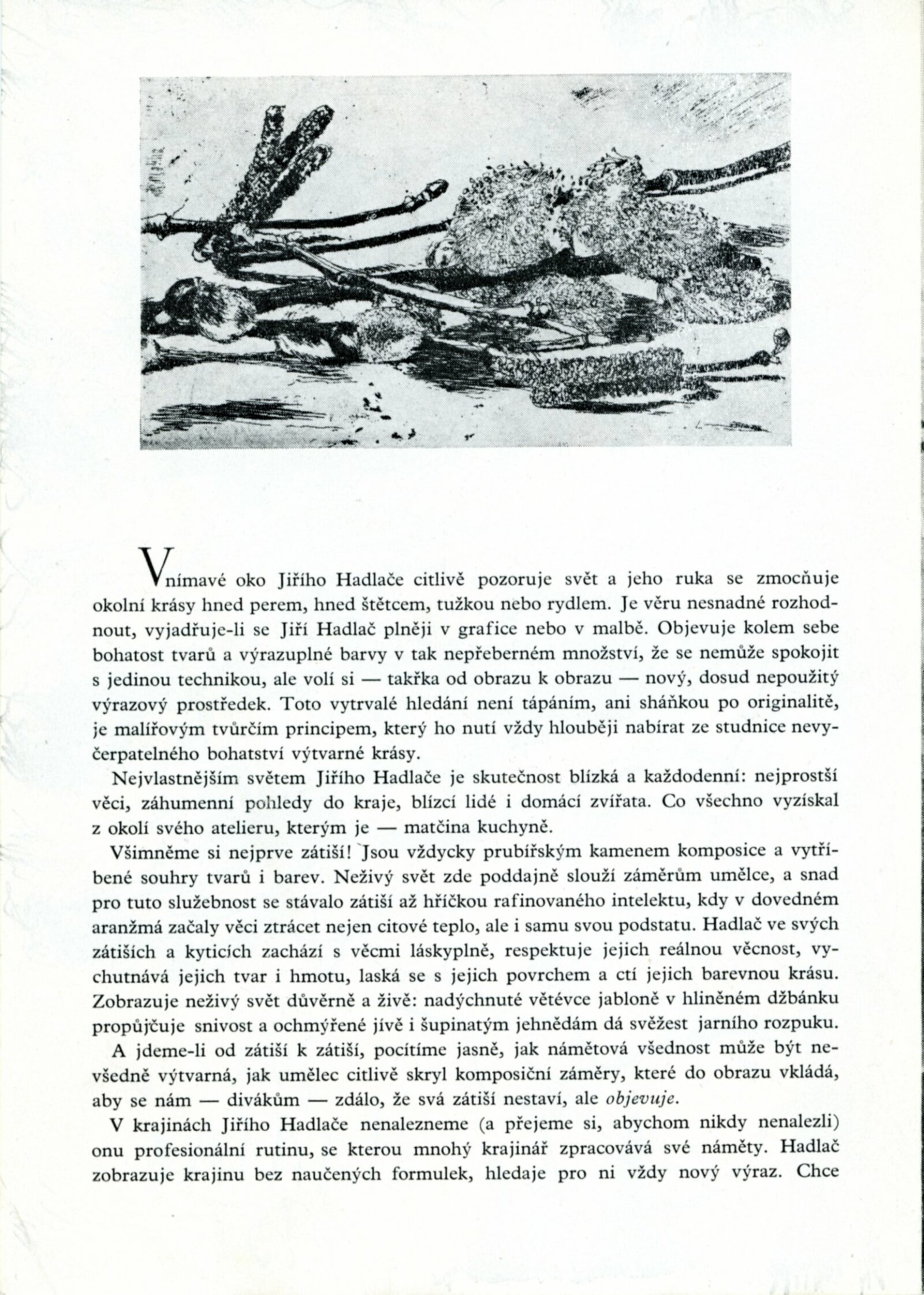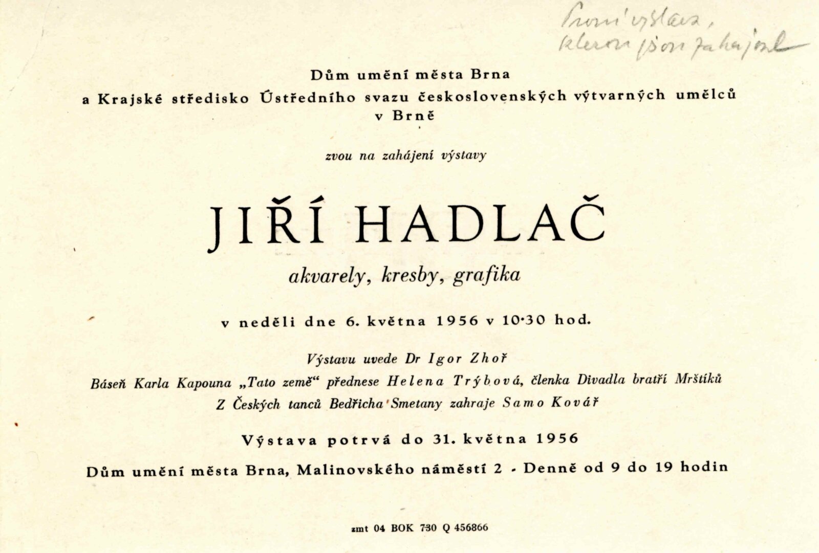 Jiří Hadlač 1956: Dům umění, Malá galerie, 6. 5. – 31. 5. 1956 / Text: Igor Zhoř. – Brno: DUmB, 1956. – skládačka, 6 s., obr., báseň Karla Kapouna, DU 252. – MMB