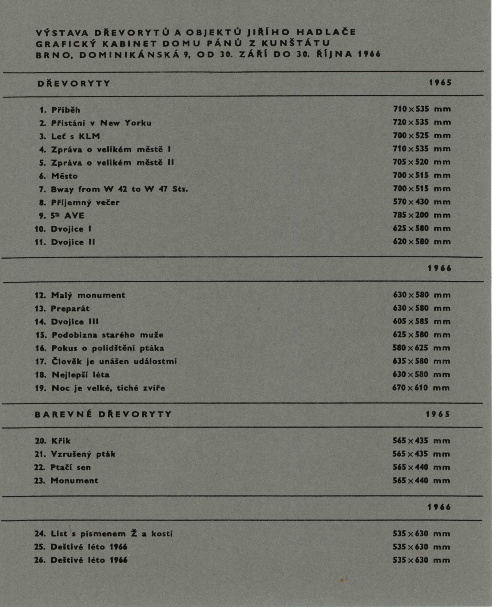 Jiří Hadlač. Výstava dřevorytů a objektů: Dům umění města Brna / Dům pánů z Kunštátu, 76. výstava Kabinetu grafiky, 30. 9. – 30. 10. 1966 / Text: Igor Zhoř. – Brno: DUmB, 1966. – 8 s., obr., seznam vystavených prací 2 s., DPK 312. – MZK; MMB