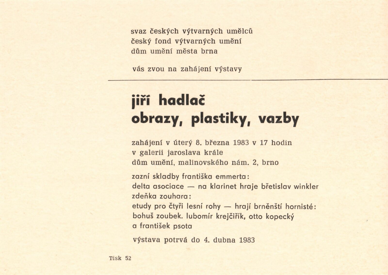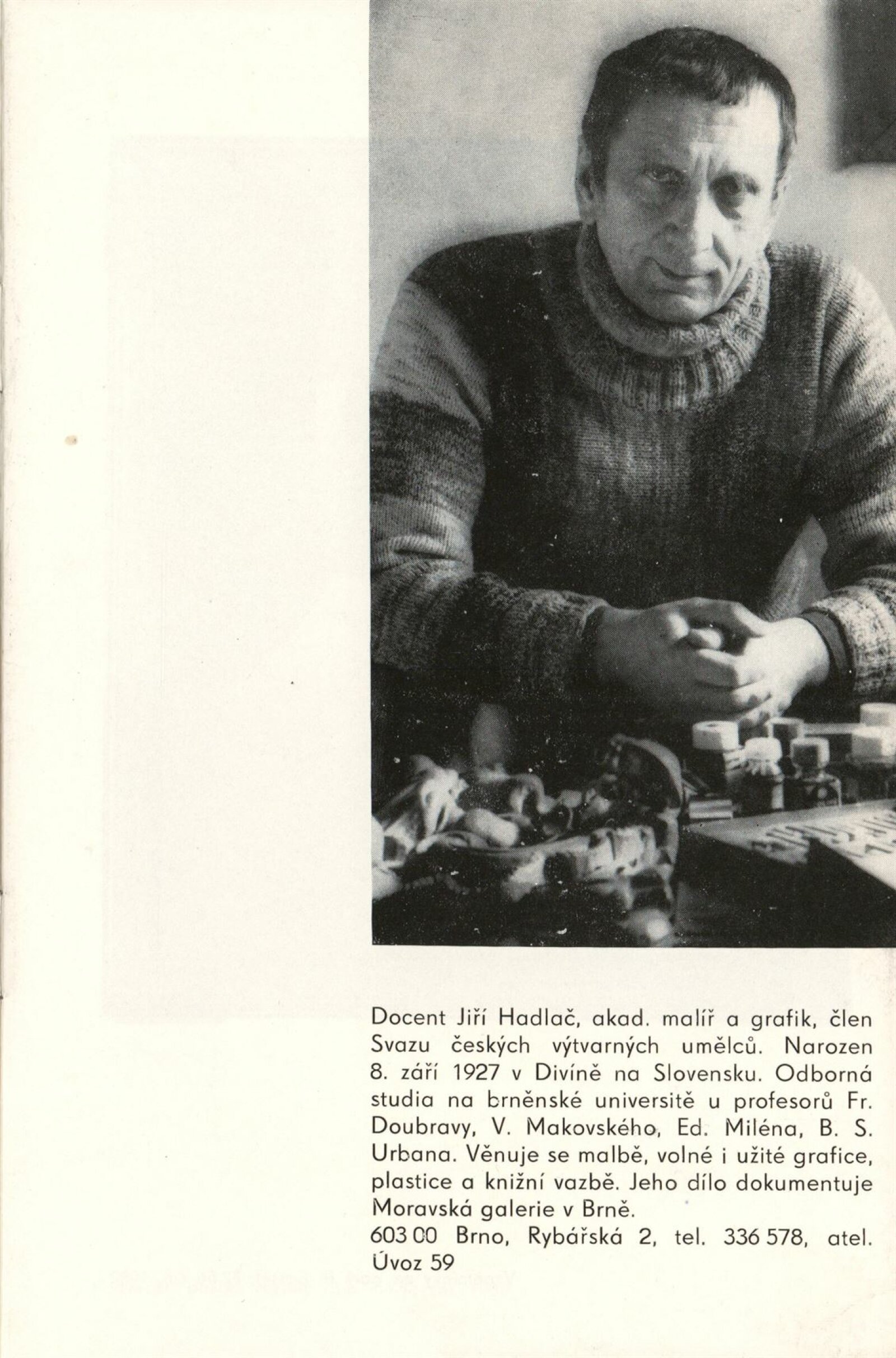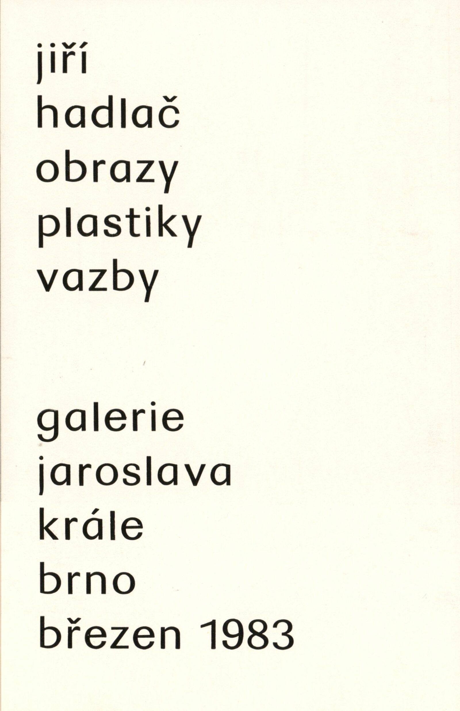 Jiří Hadlač. Obrazy, plastiky, vazby: Dům umění, Galerie Jaroslava Krále, 8. 3. – 4. 4. 1983 / Brno: ČFVU, 1983. – 14 s., portrét, medailon, obr., DU 757