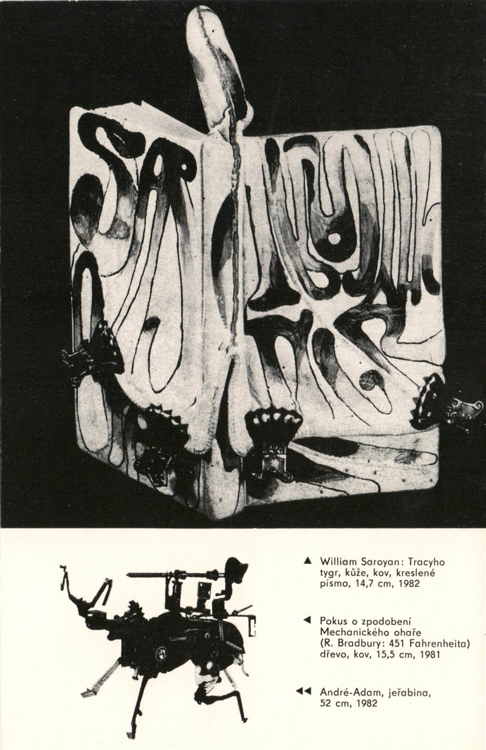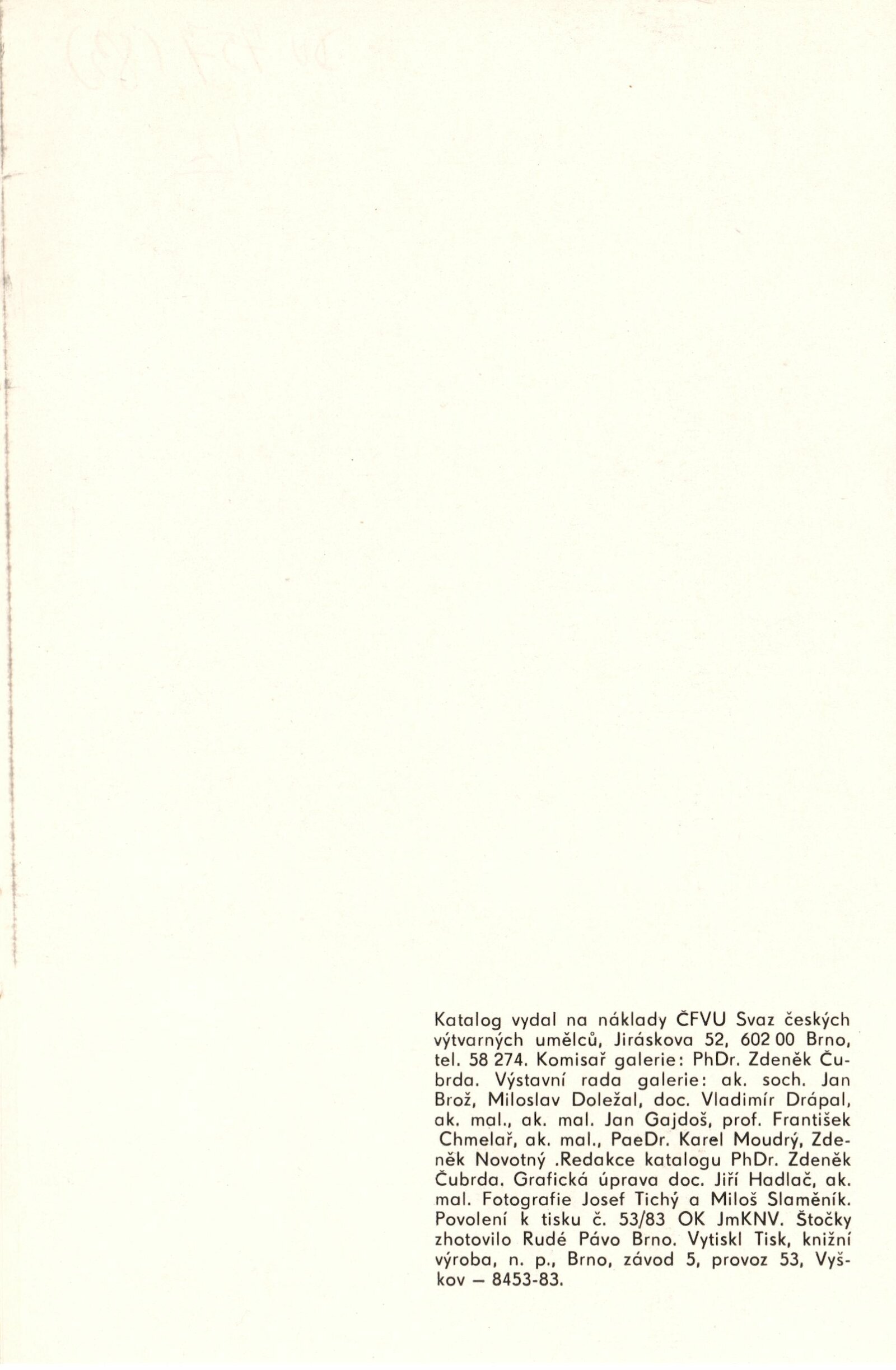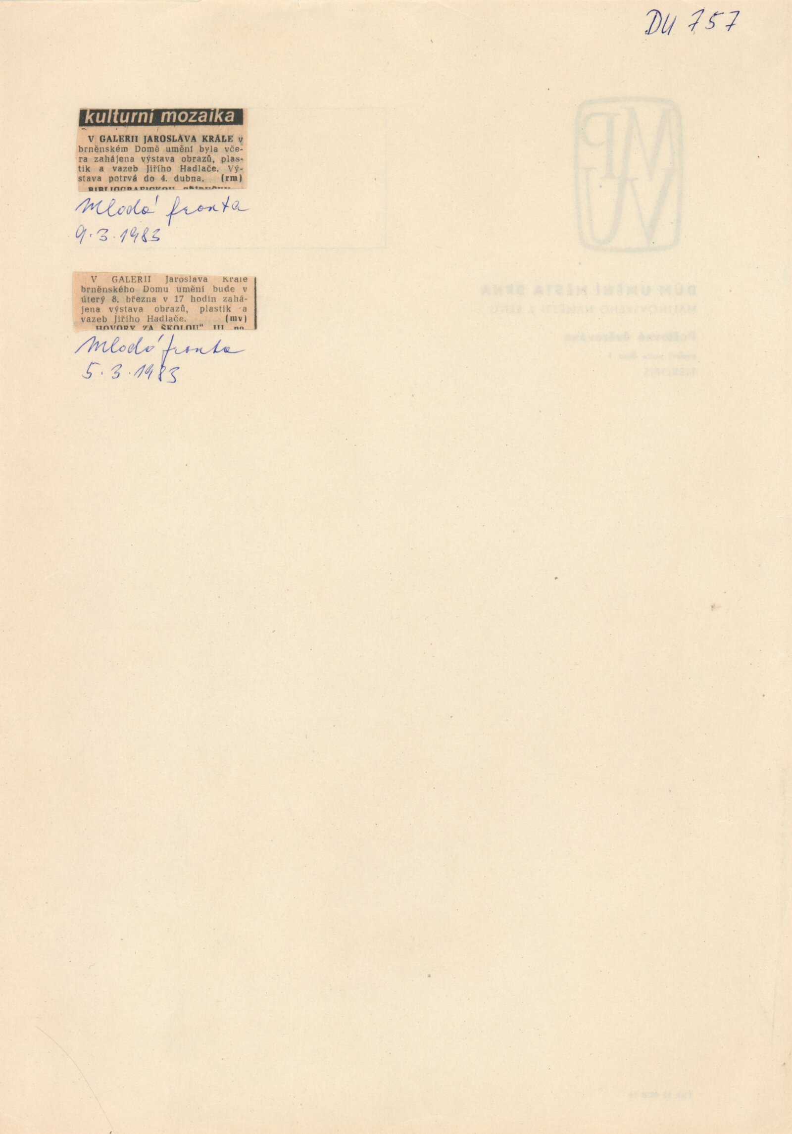 Jiří Hadlač. Obrazy, plastiky, vazby: Dům umění, Galerie Jaroslava Krále, 8. 3. – 4. 4. 1983 / Brno: ČFVU, 1983. – 14 s., portrét, medailon, obr., DU 757