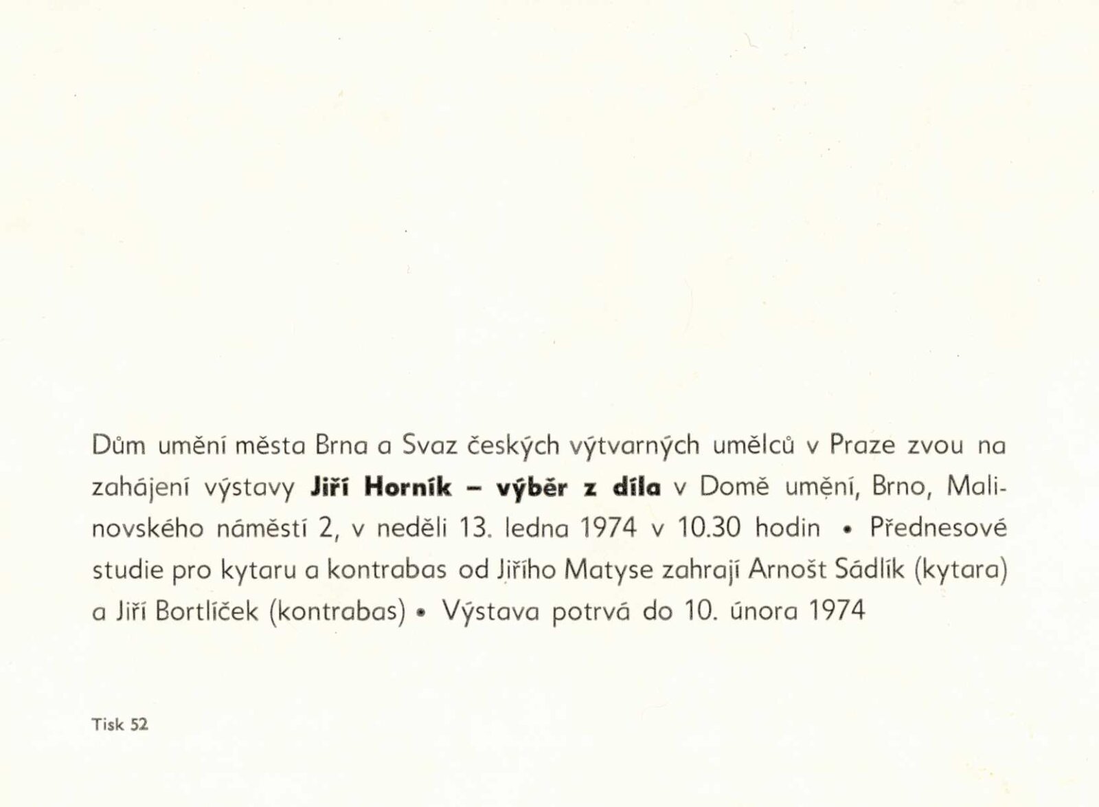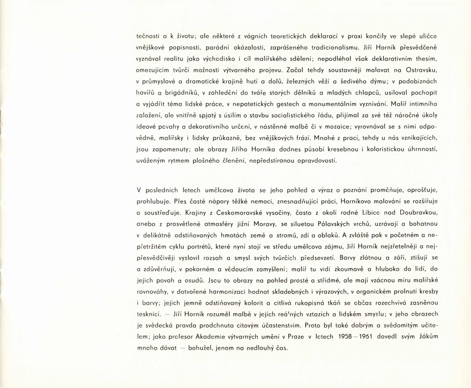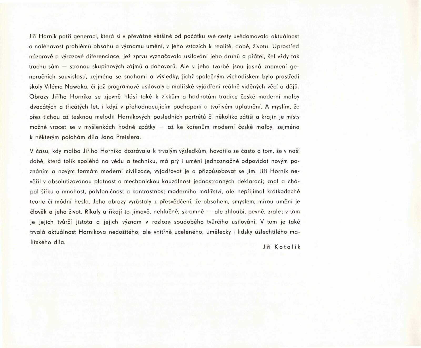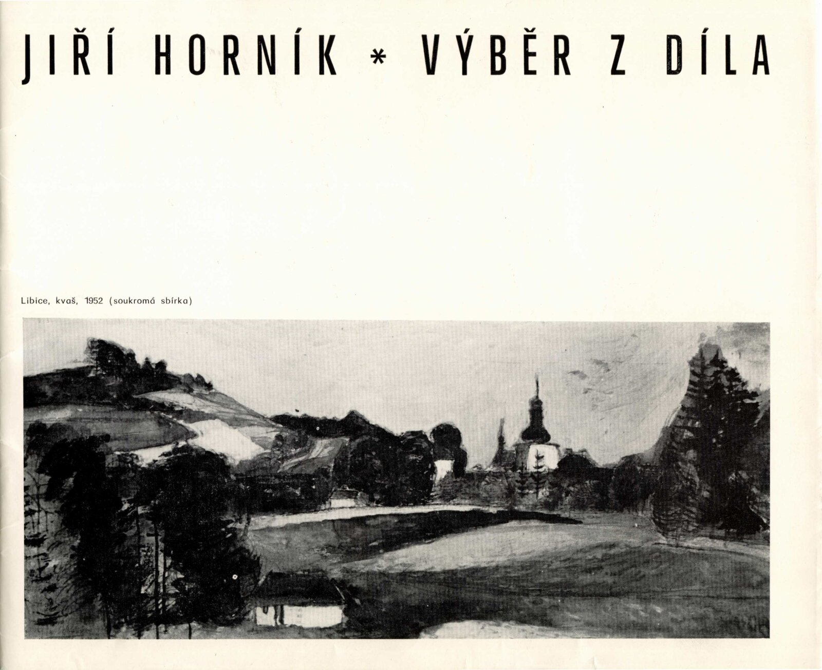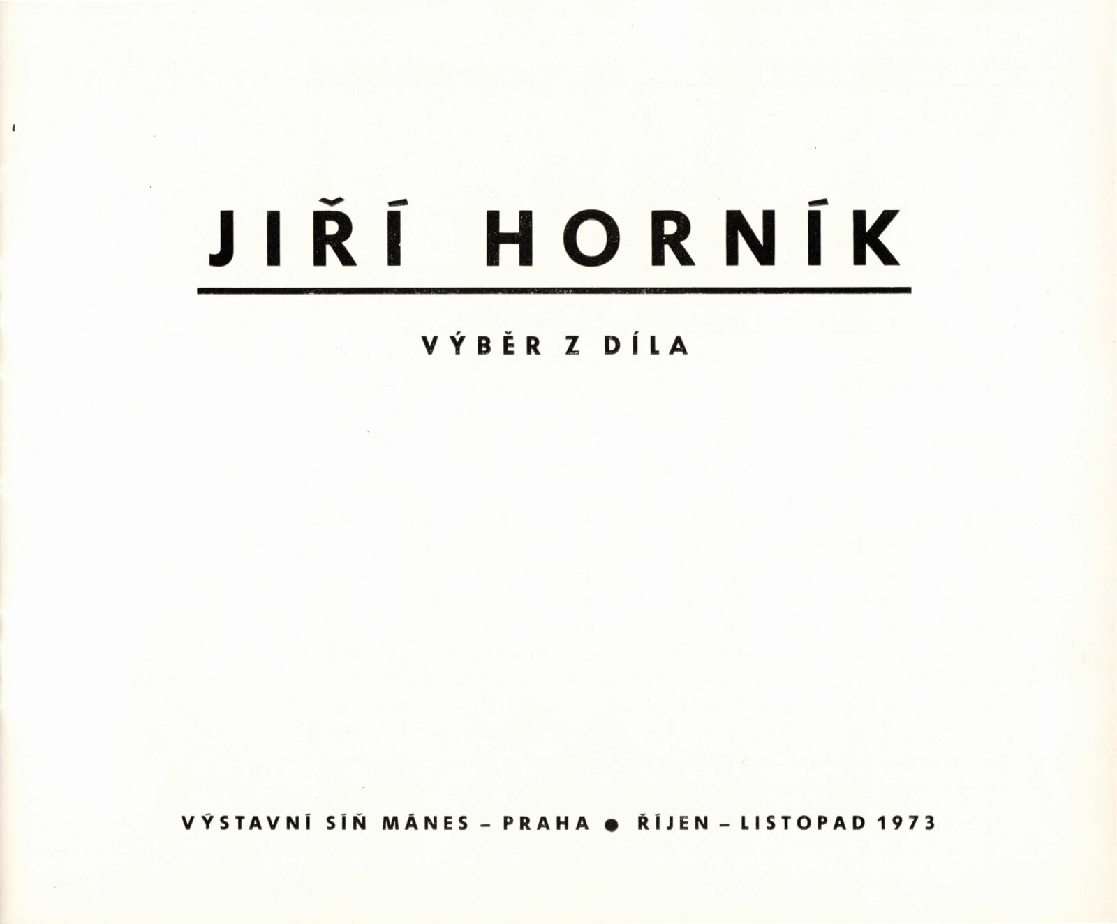 Jiří Horník. Výběr z díla: Dům umění města Brna, 13. 1. – 17. 2. 1974 / Převzatý katalog. Jiří Horník. Výběr z díla: Výstavní síň Mánes, Praha, říjen–listopad 1973 / Text: Jiří Kotalík. – Praha: SČVU, 1973. – 18 s., obr., seznam vystavených prací 2 s., vlastní portrét, životní data, výstavy, bibliografie, DU 601. – MG