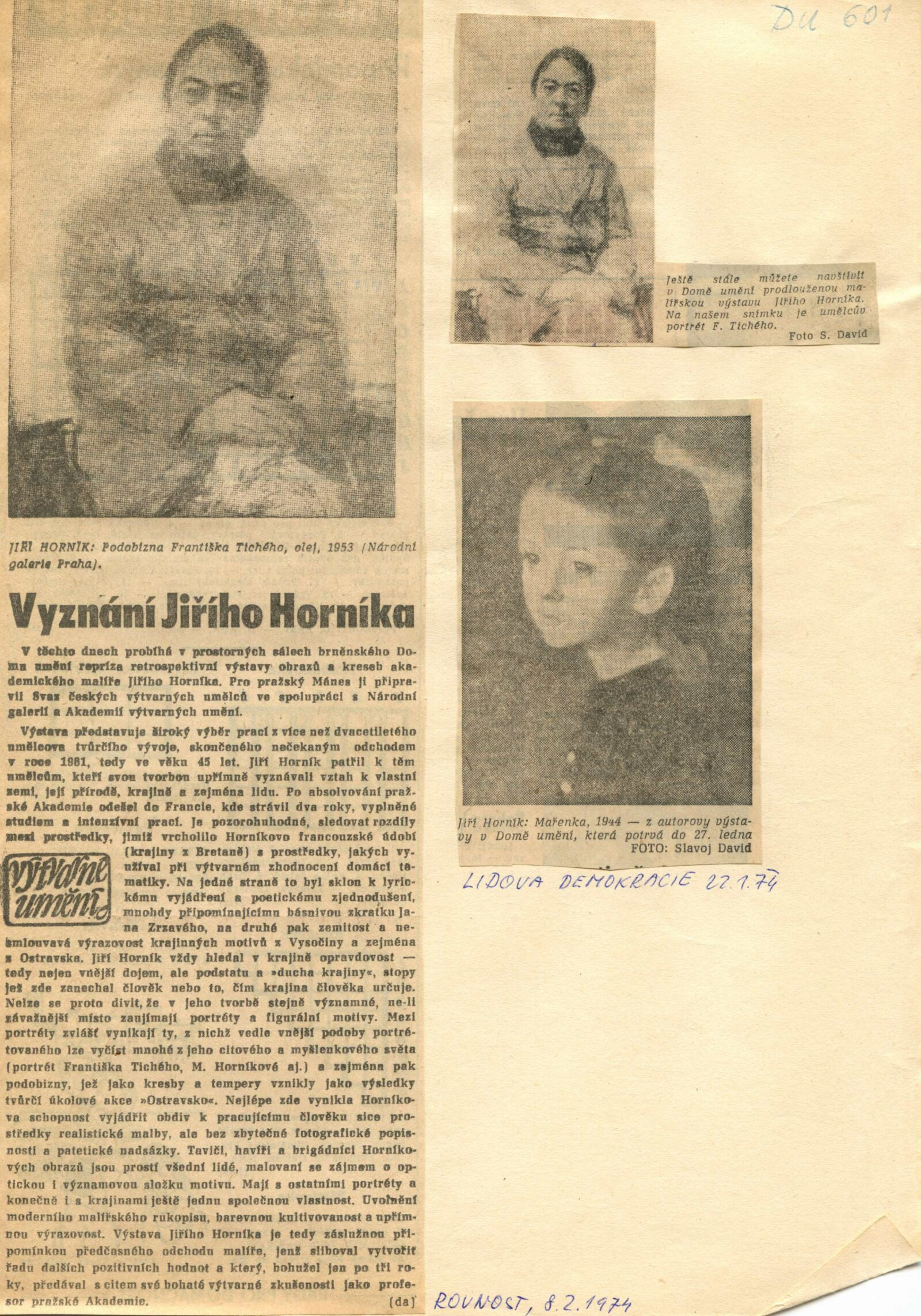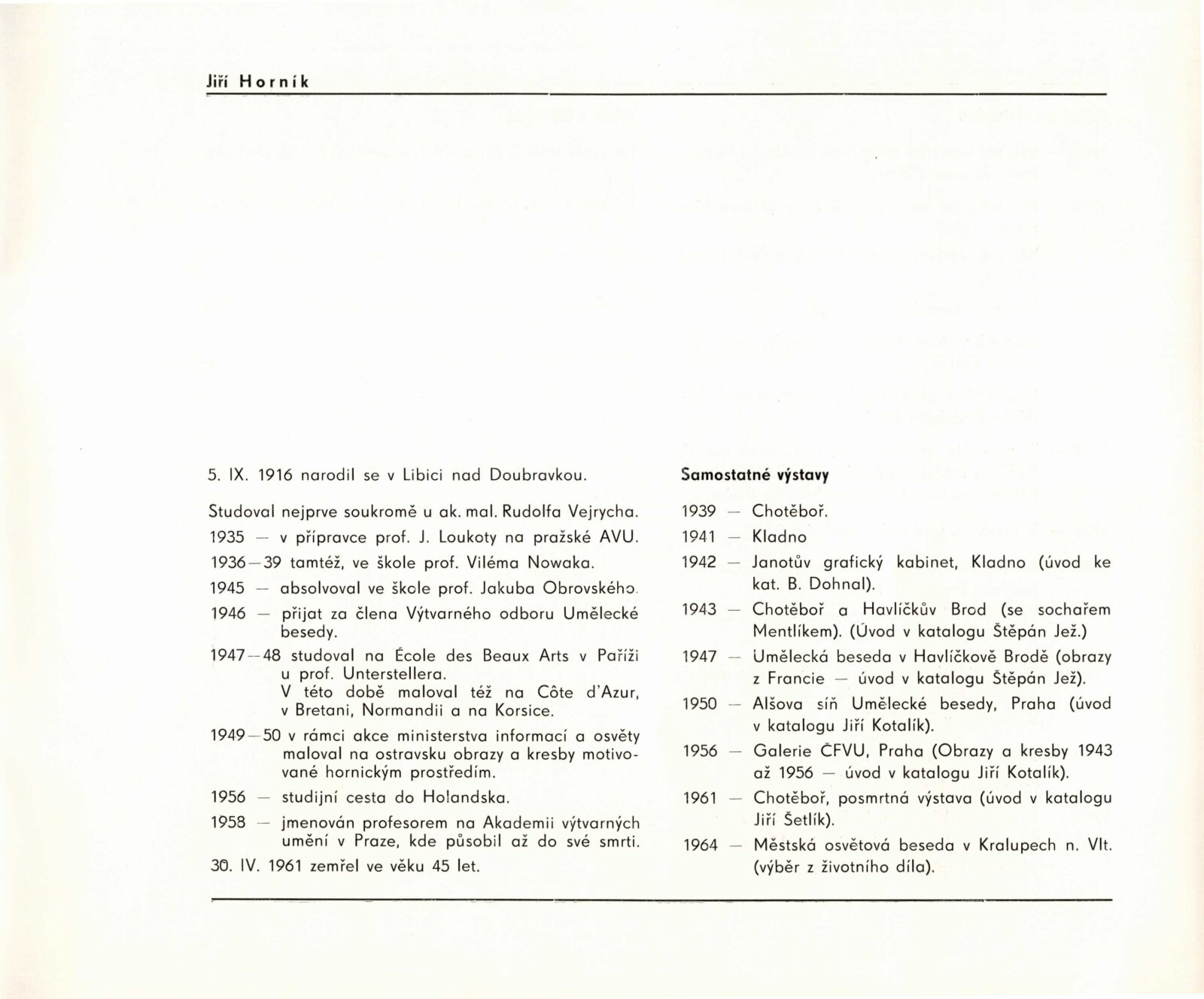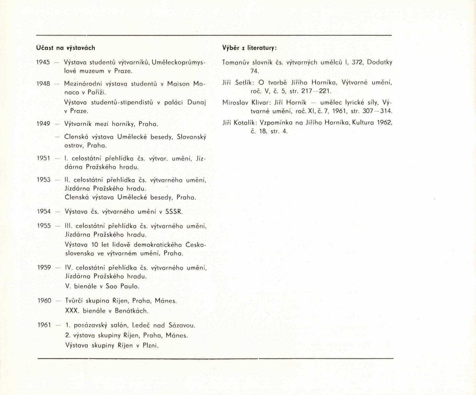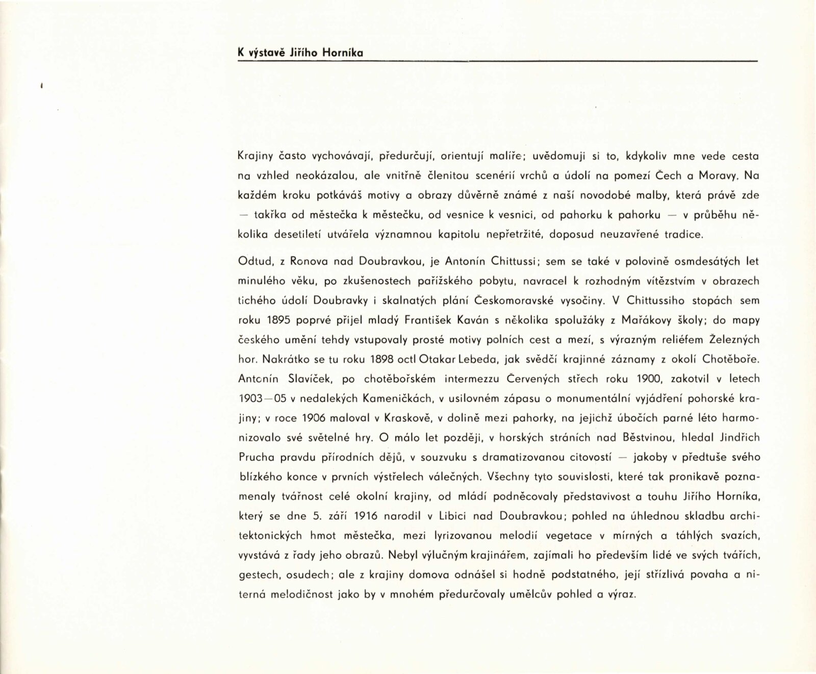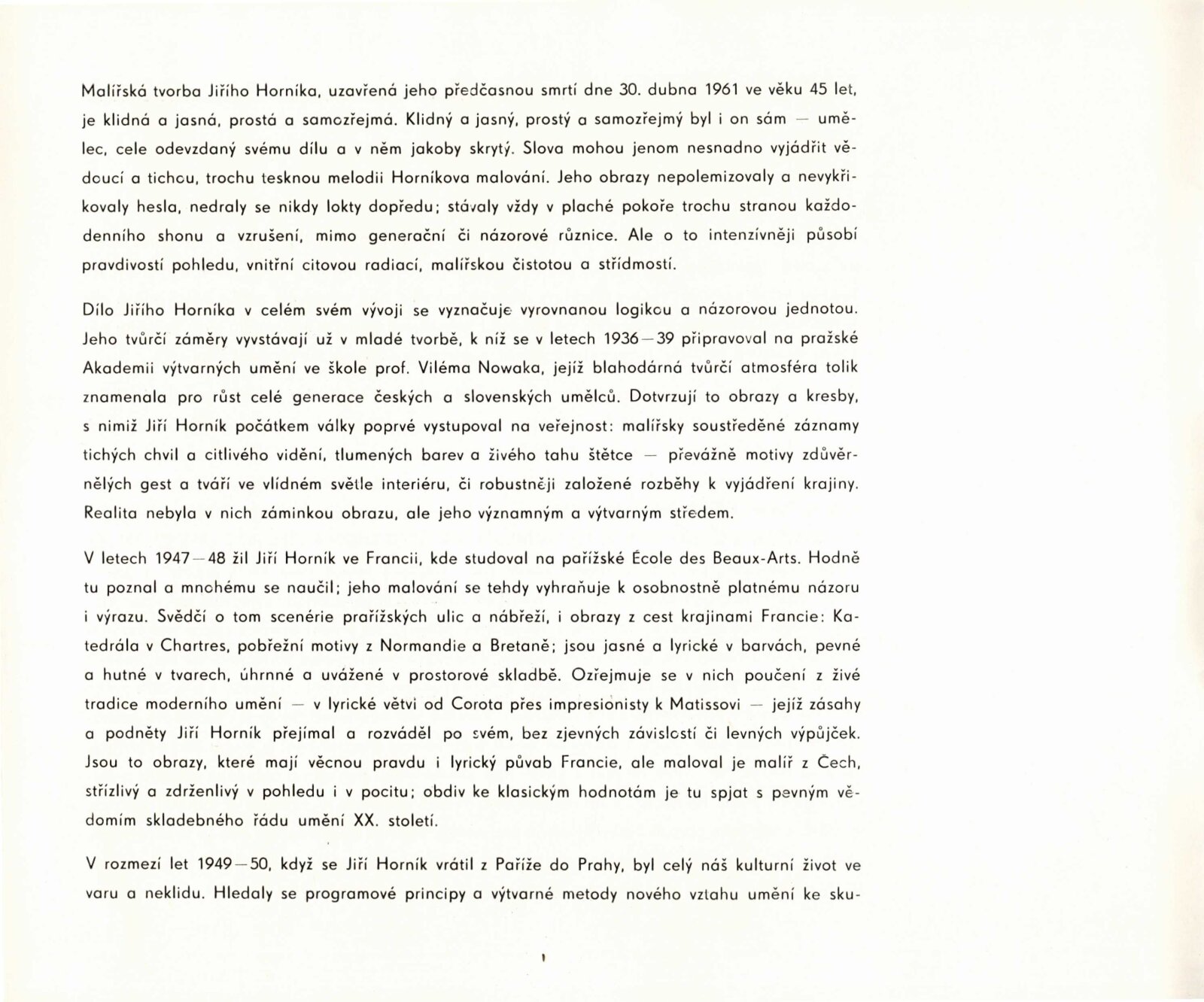 Jiří Horník. Výběr z díla: Dům umění města Brna, 13. 1. – 17. 2. 1974 / Převzatý katalog. Jiří Horník. Výběr z díla: Výstavní síň Mánes, Praha, říjen–listopad 1973 / Text: Jiří Kotalík. – Praha: SČVU, 1973. – 18 s., obr., seznam vystavených prací 2 s., vlastní portrét, životní data, výstavy, bibliografie, DU 601. – MG